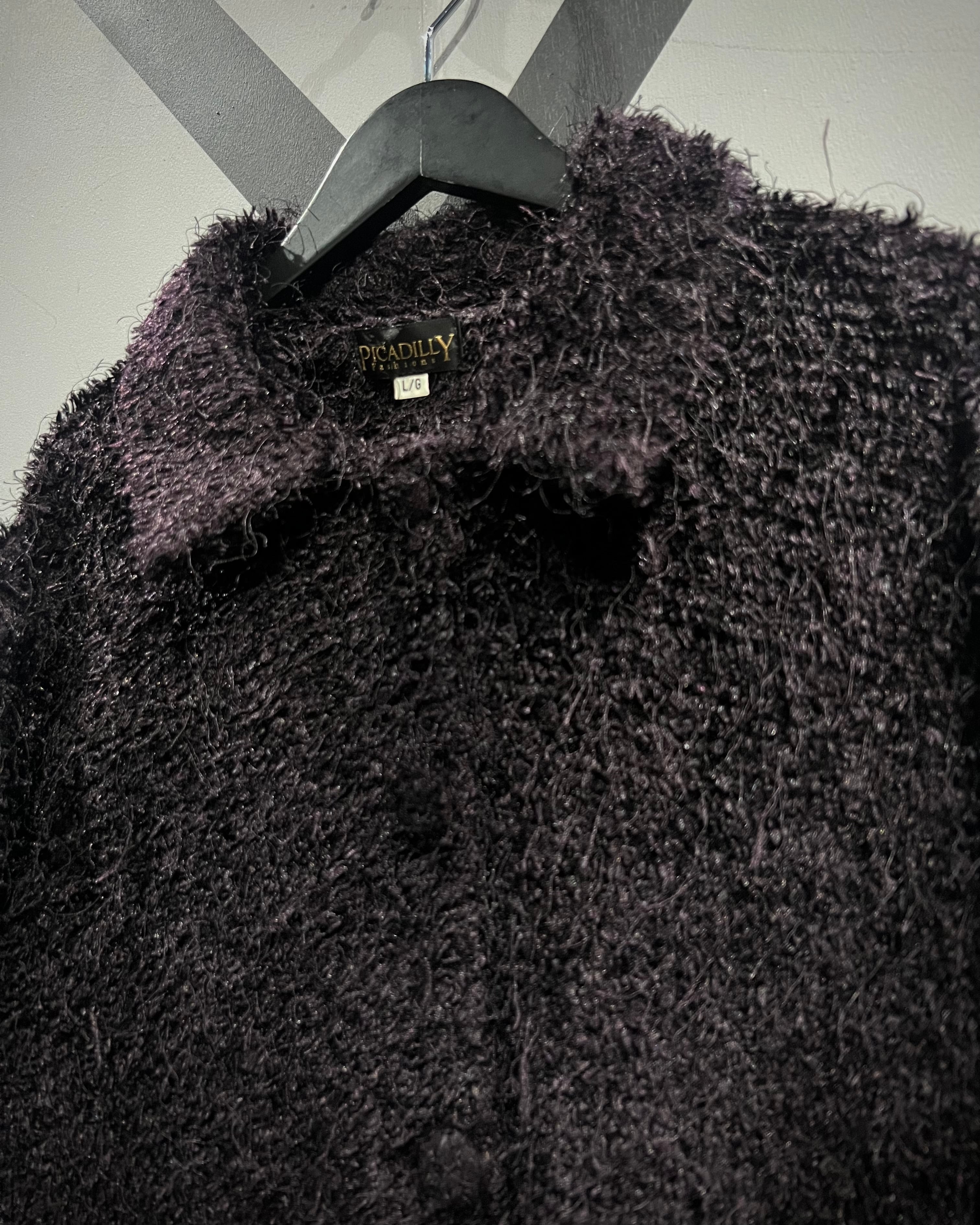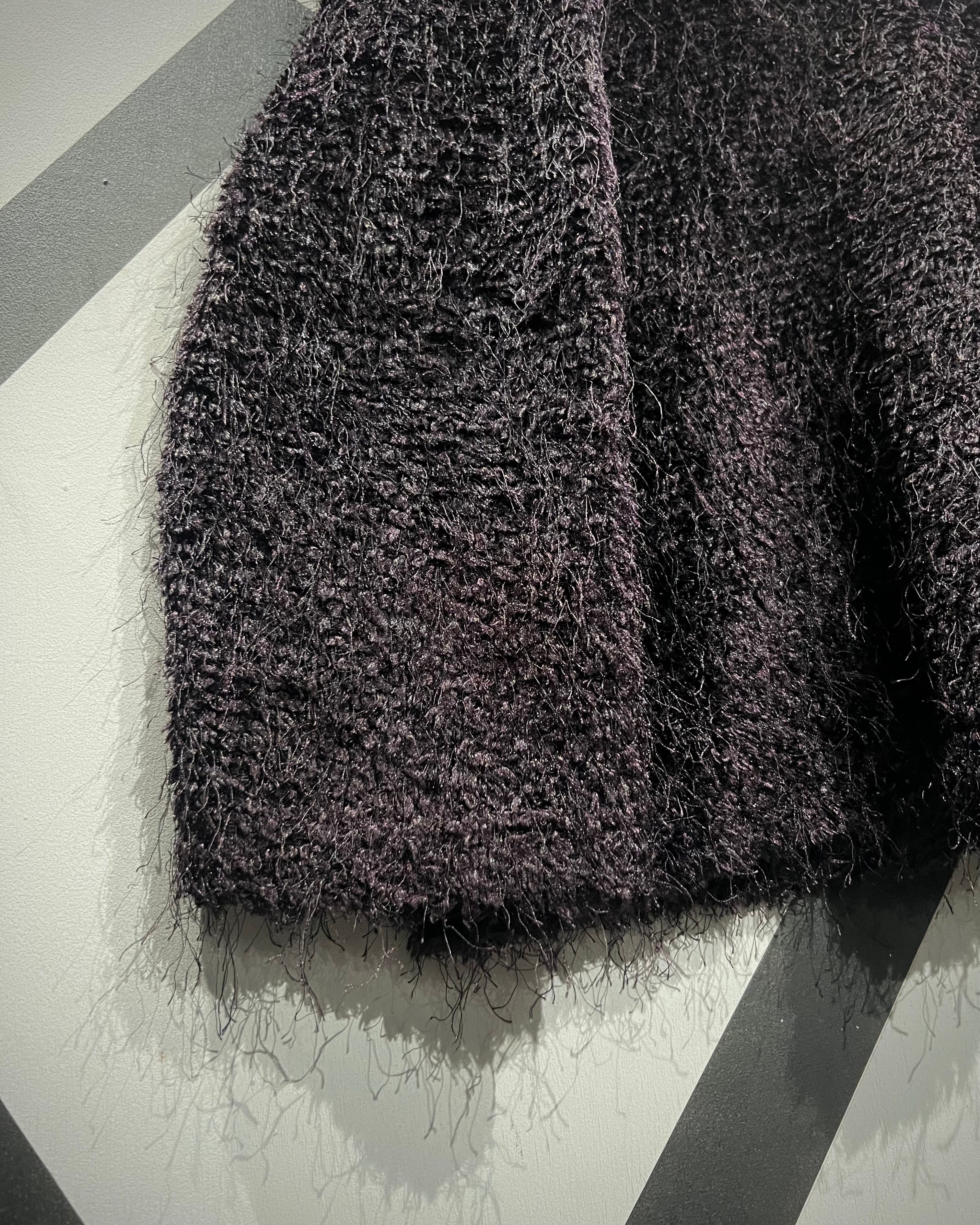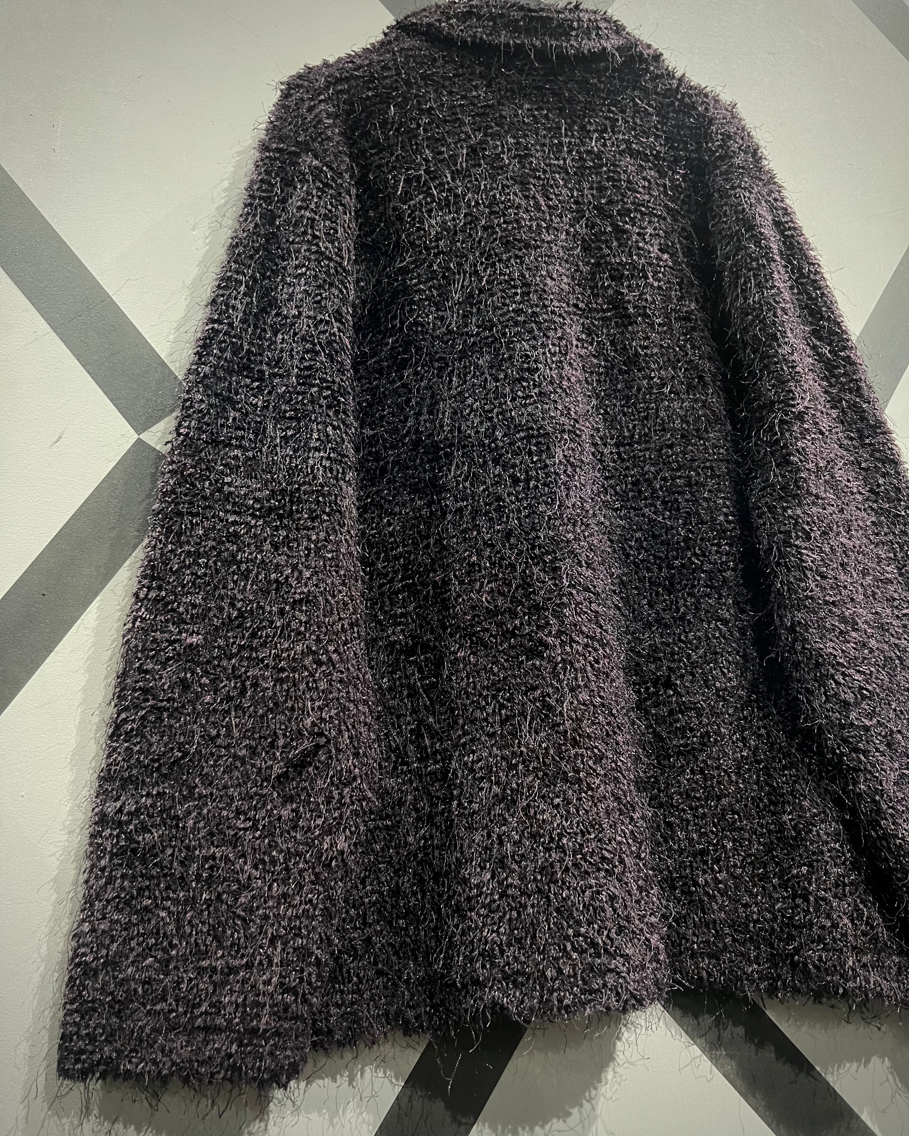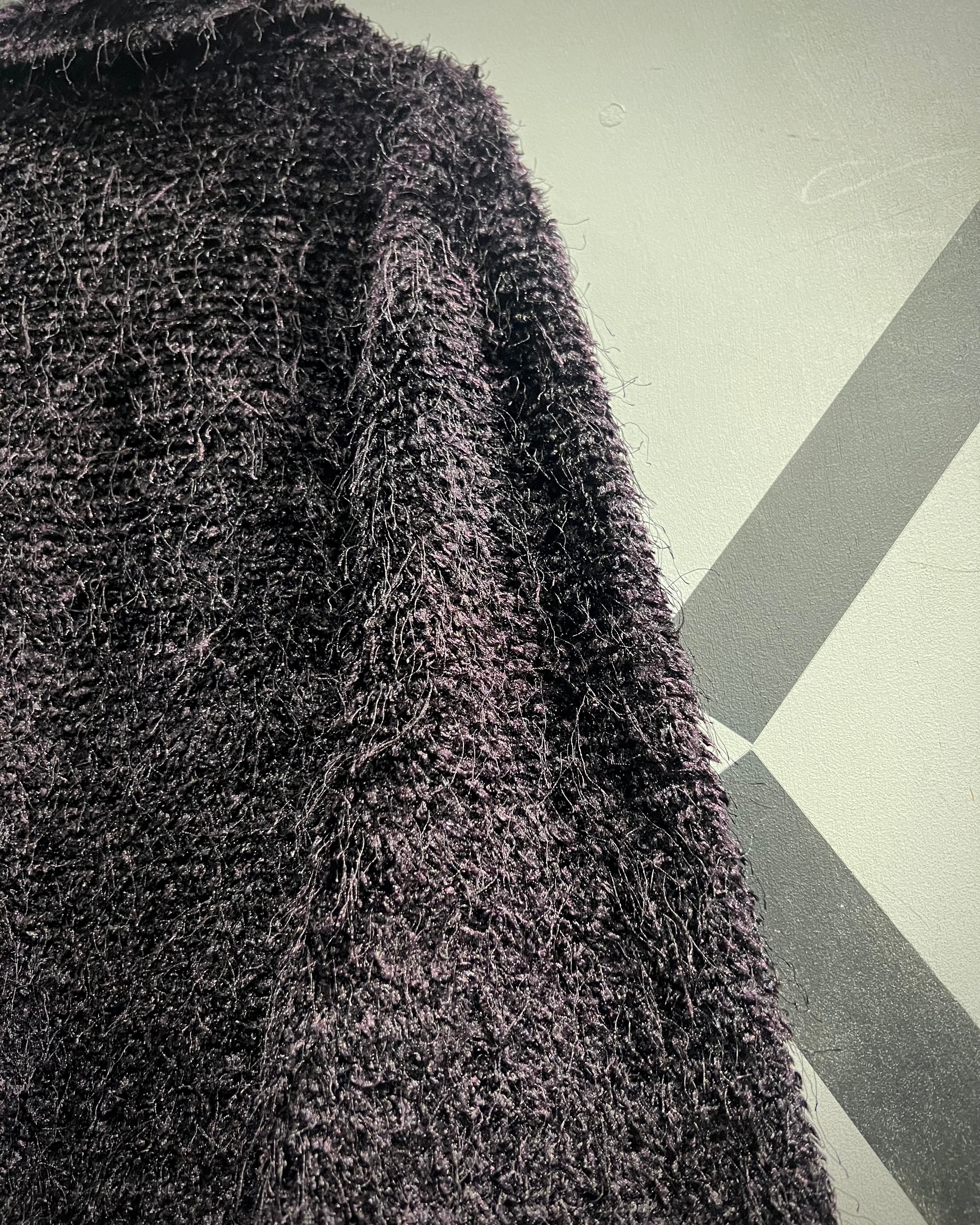 深みのあるパープルトーンと、独特の毛足を持つシャギー素材が印象的な長袖シャツ。
