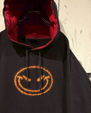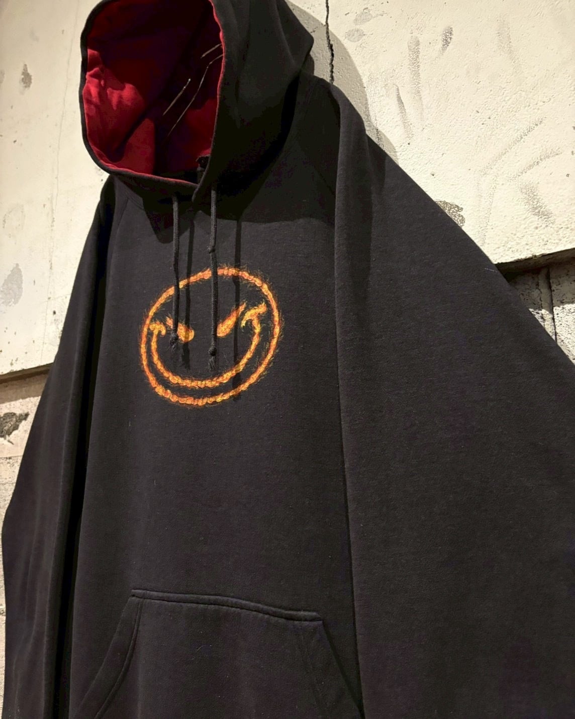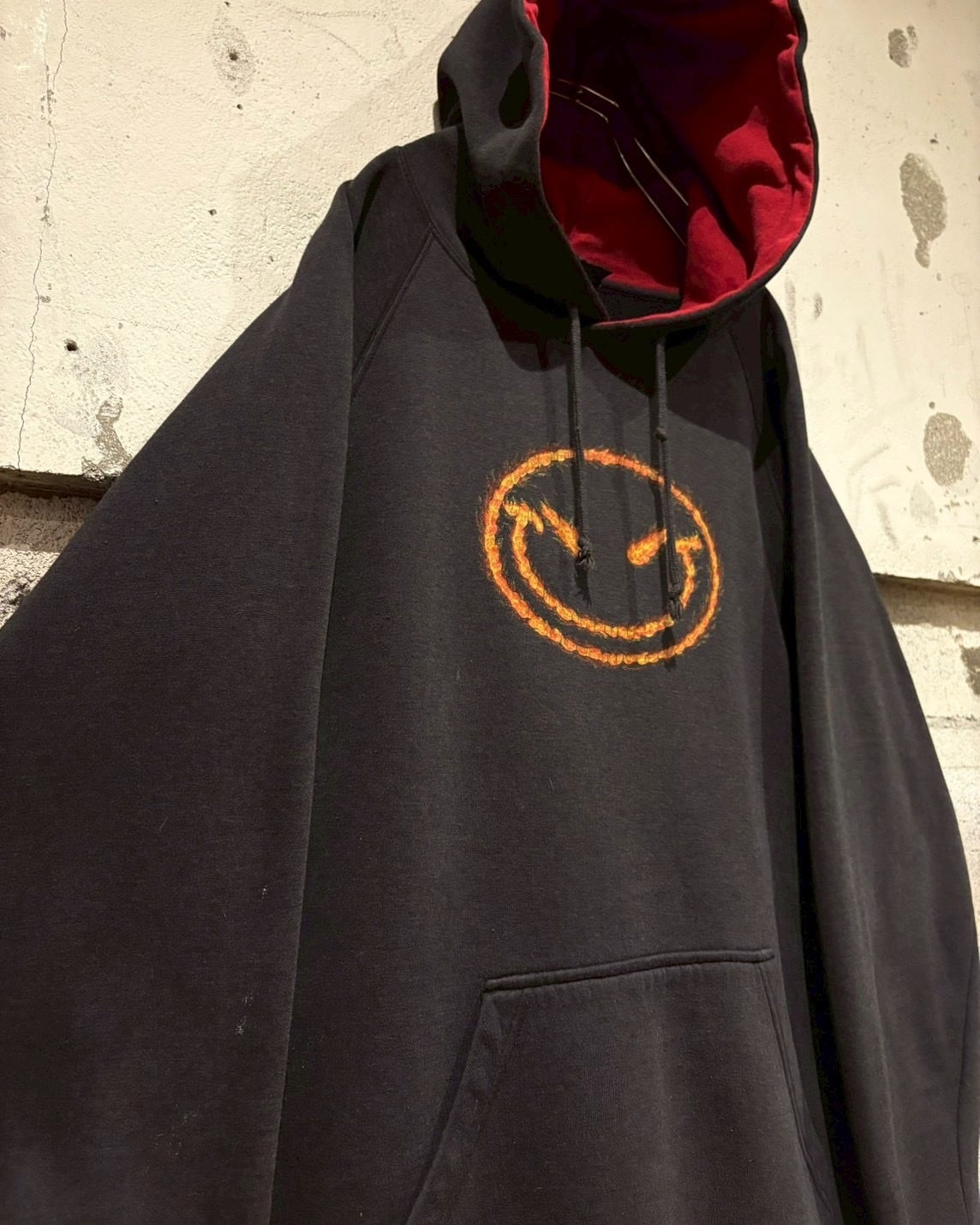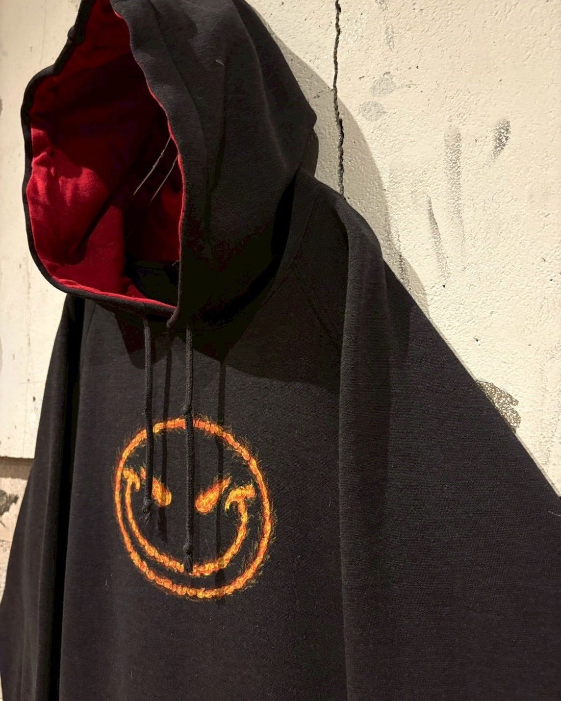 アンダーグラウンドシーンを象徴するような、ファイヤースマイルモチーフをフロントに大胆にON。ブラックボディに映える燃え上がるようなグラフィック、そしてフード裏には真紅のスウェット生地を切り替え、シンプルながら存在感を抜群に放っています。