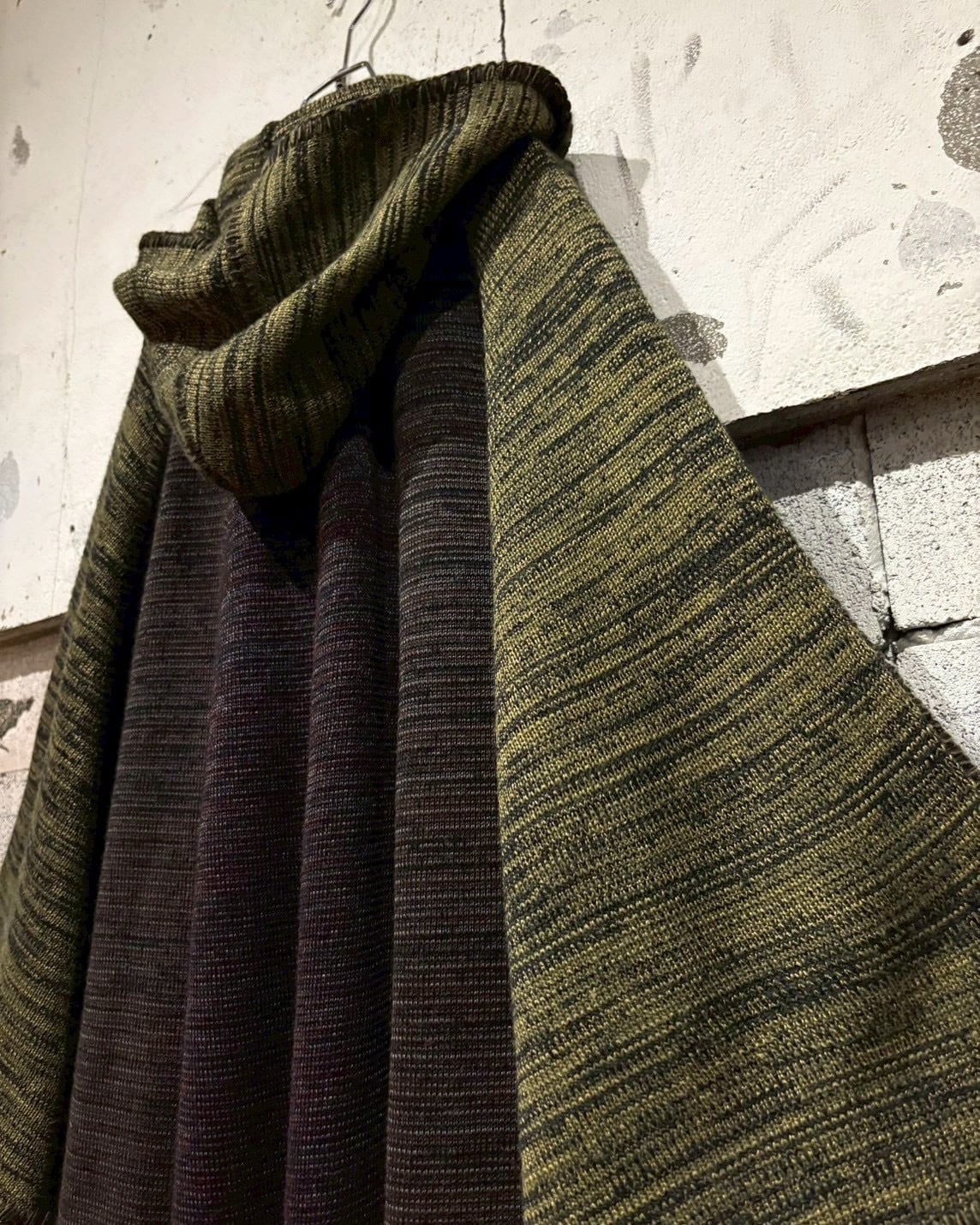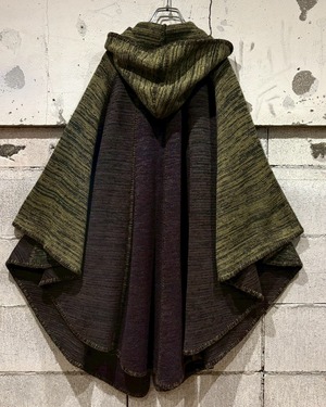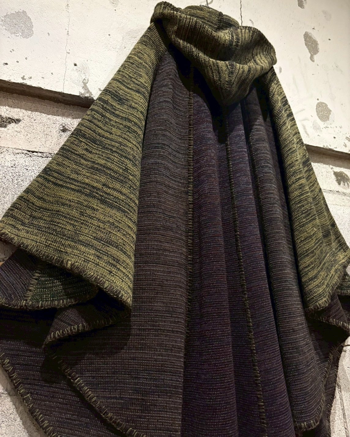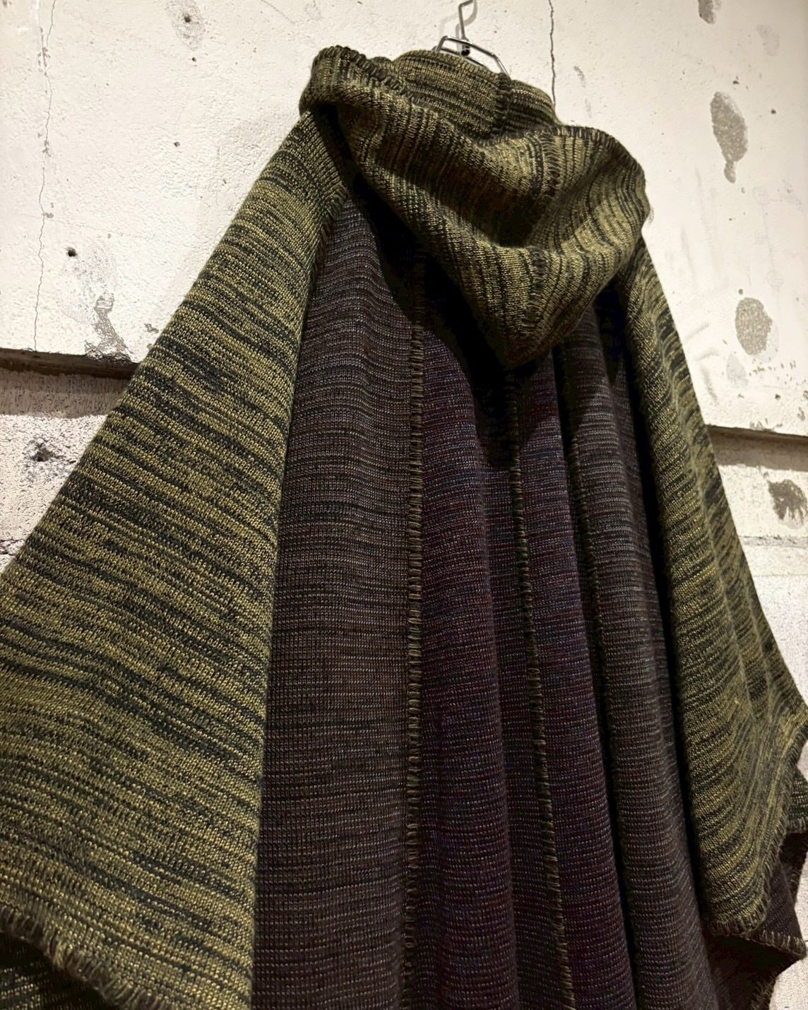 メイドインイタリーの、上質なメランジニットポンチョ。深みのあるオリーブ×ブラウンの色調が織りなす立体的な陰影が美しく、秋冬シーズンに映える逸品。