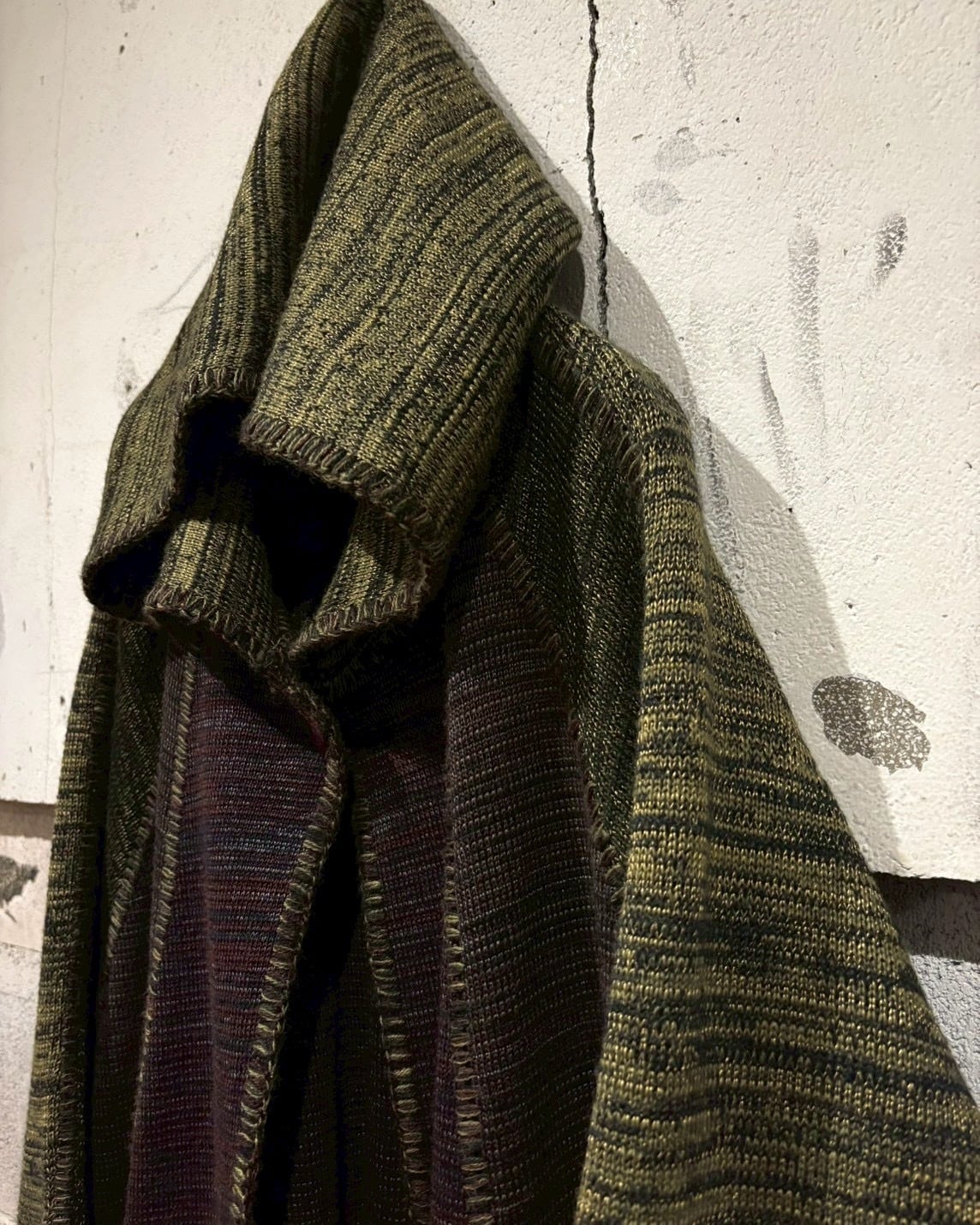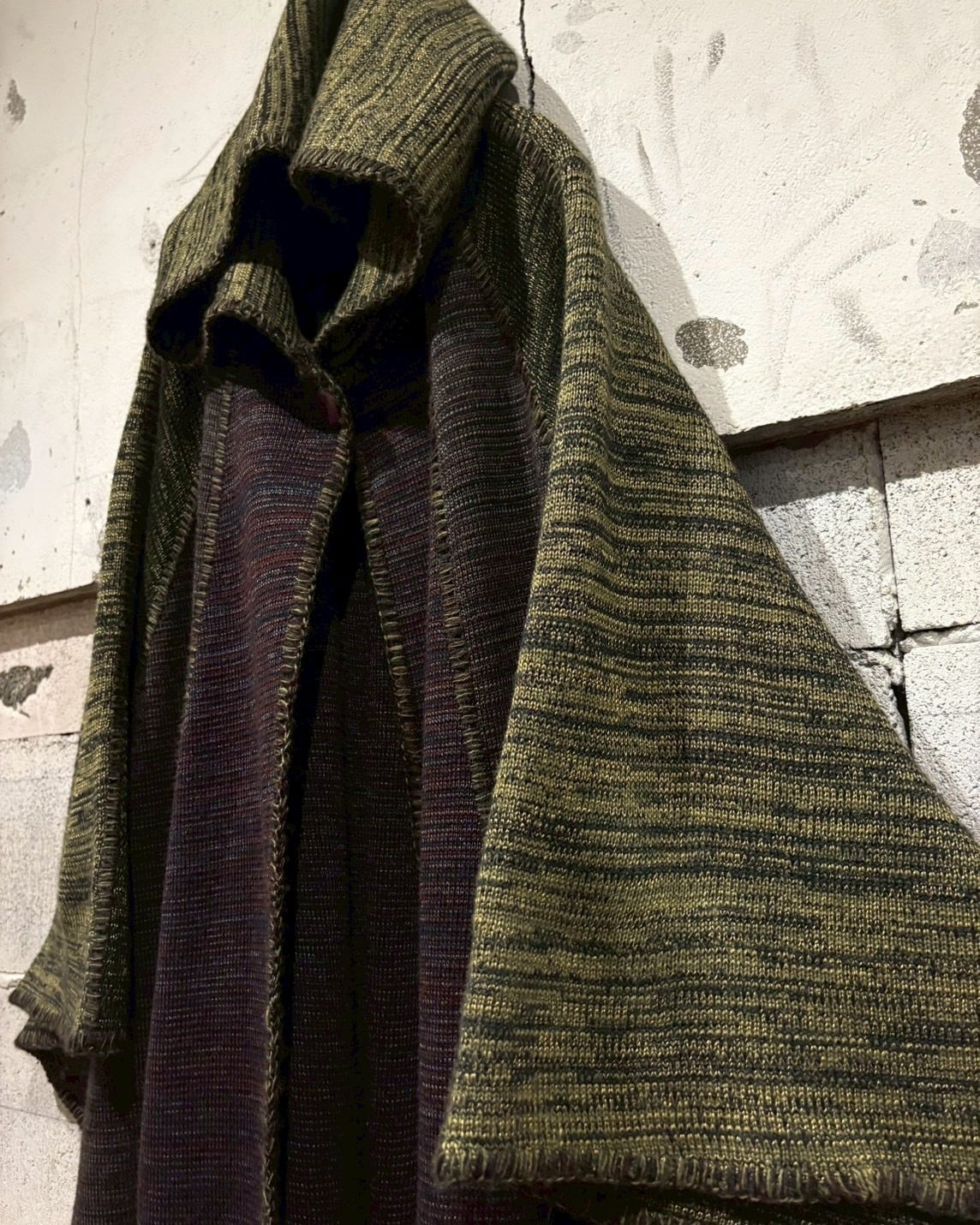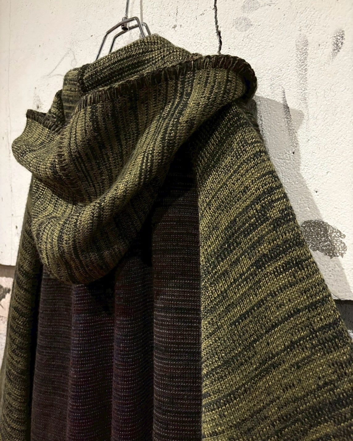 メイドインイタリーの、上質なメランジニットポンチョ。深みのあるオリーブ×ブラウンの色調が織りなす立体的な陰影が美しく、秋冬シーズンに映える逸品。