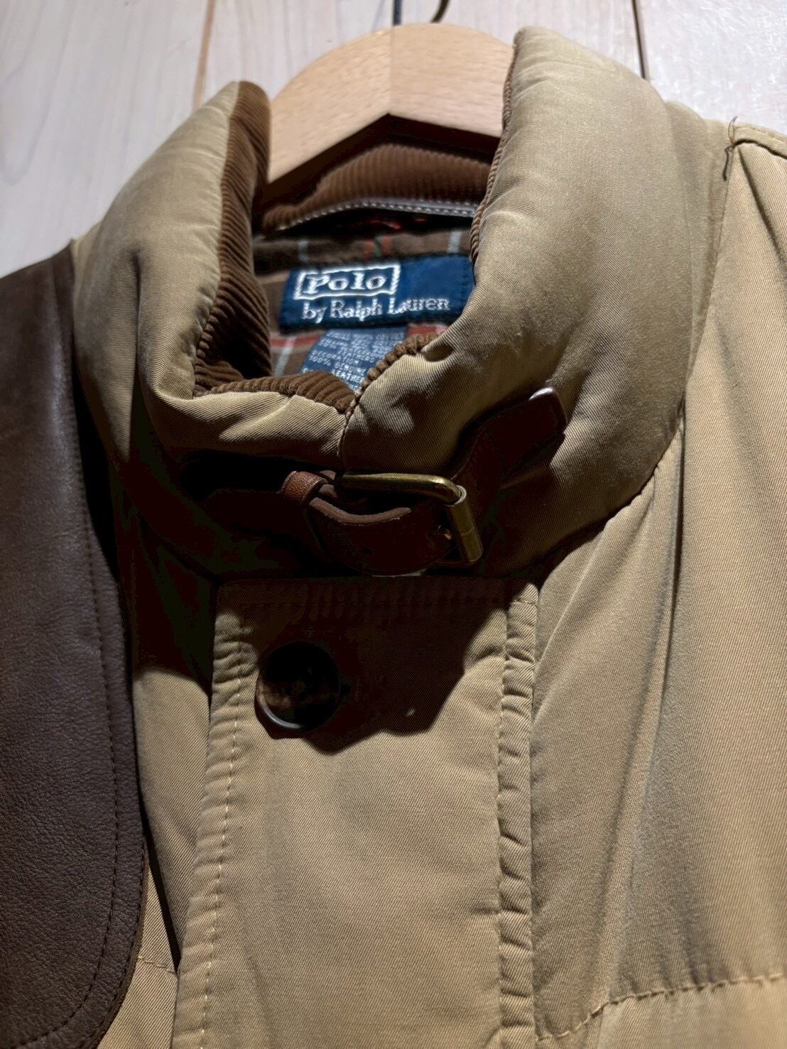 ボディにはコットンシェルを採用し、右肩には上質なリアルレザーを切り替え。経年によるレザーの艶と自然なシワ感が重厚な存在感を放ち、ベージュトーンのボディとのコントラストが抜群。ネックにはコーデュロイのスタンドカラーとチンストラップを備え、クラシックかつ実用的なディテールを演出しています。