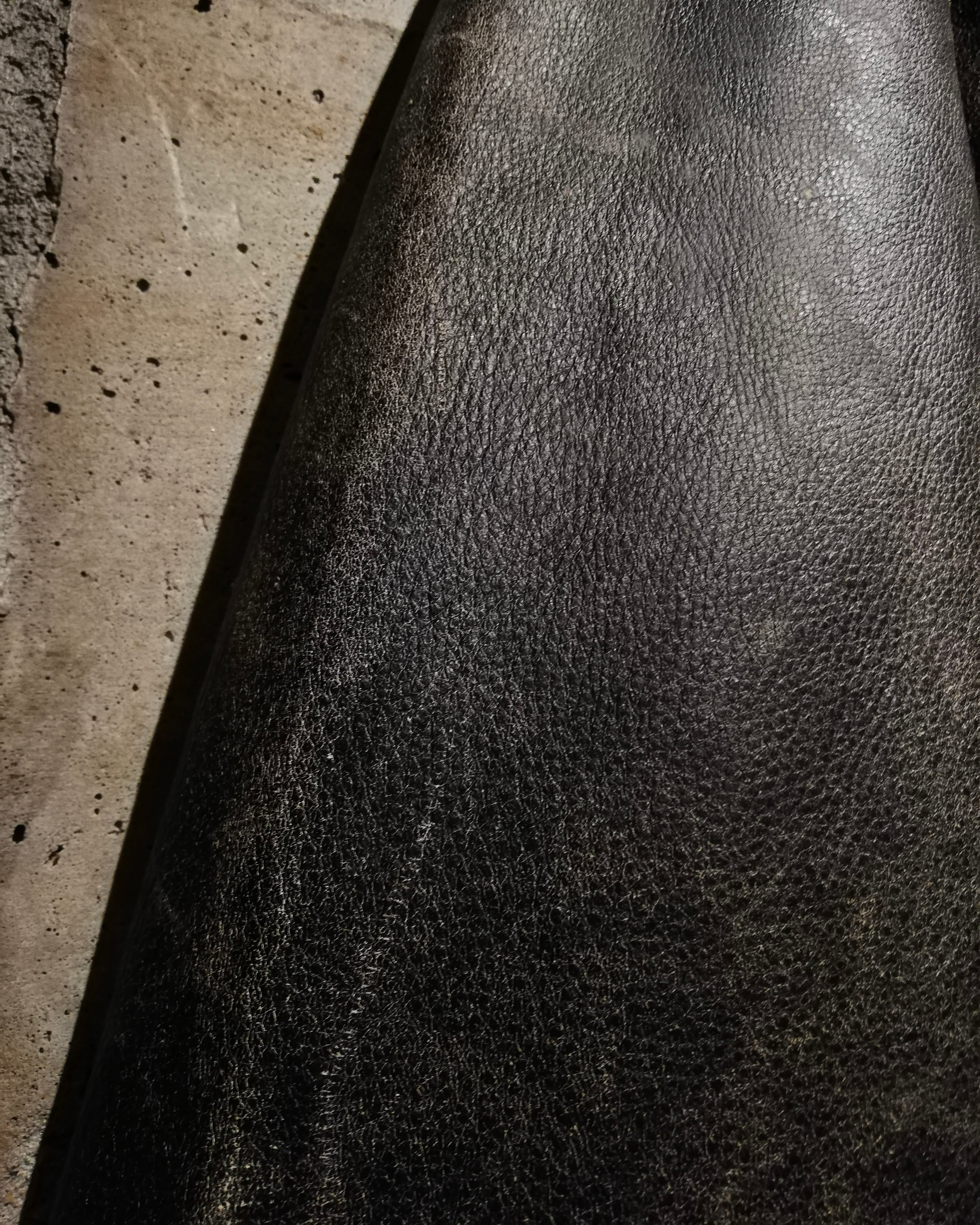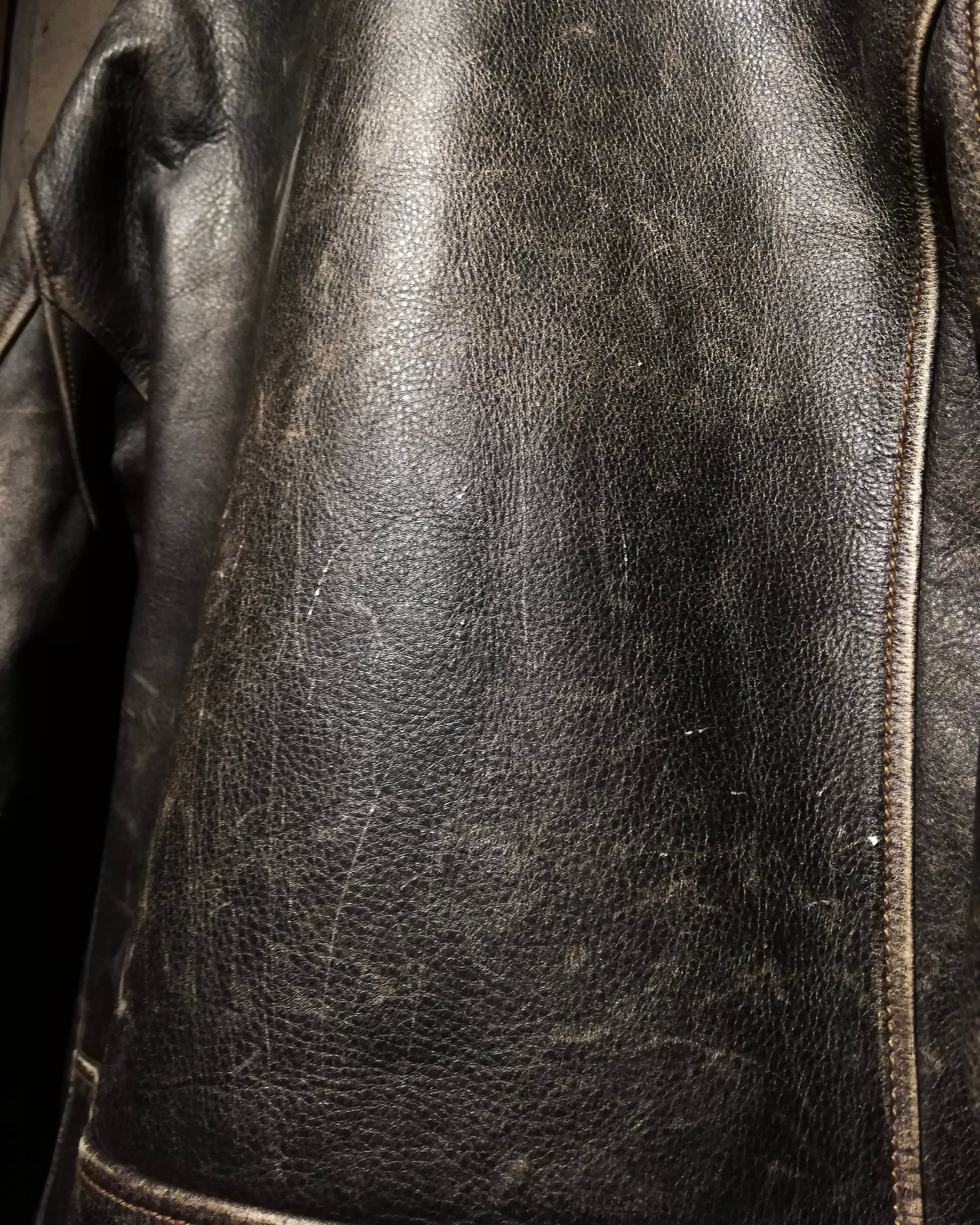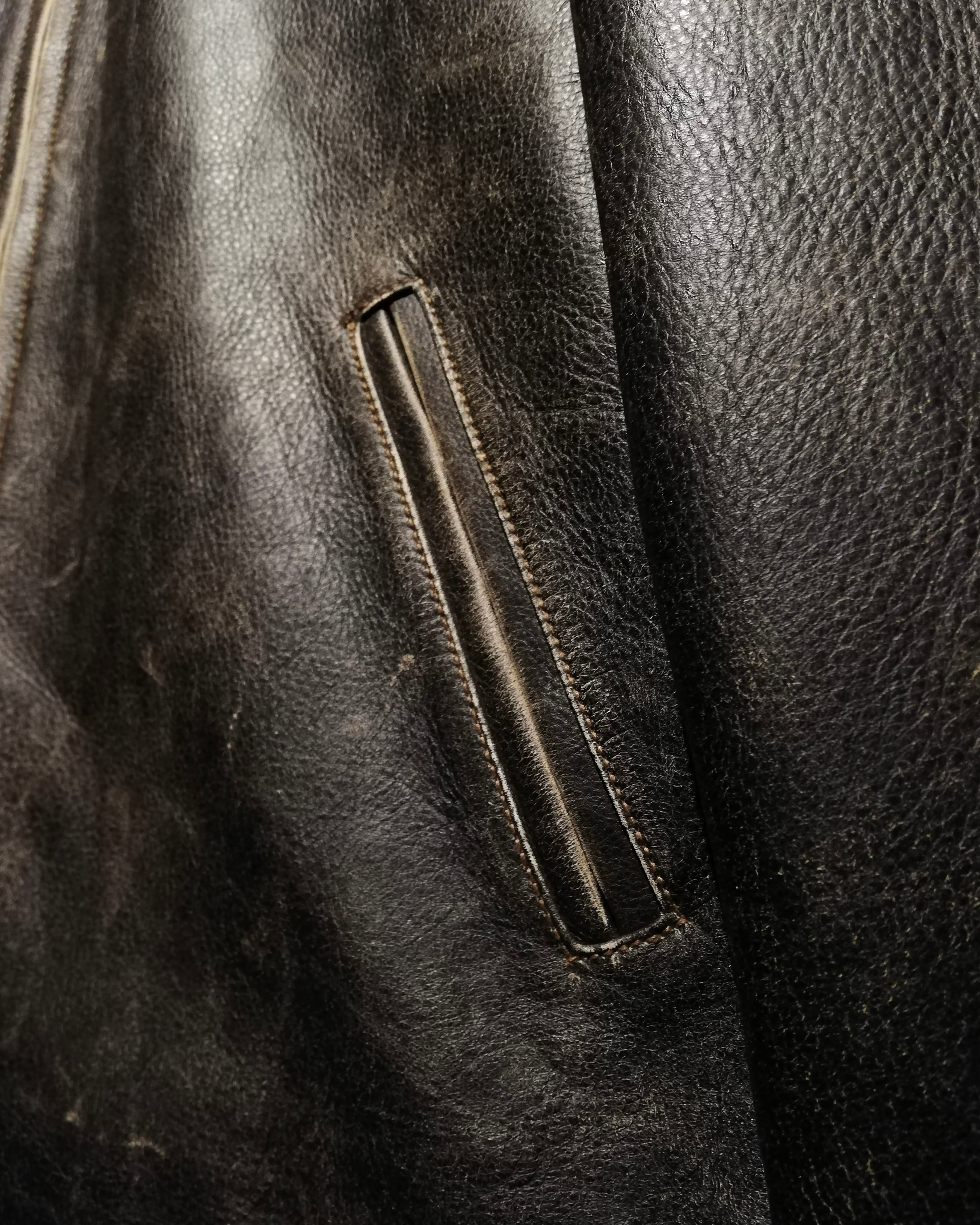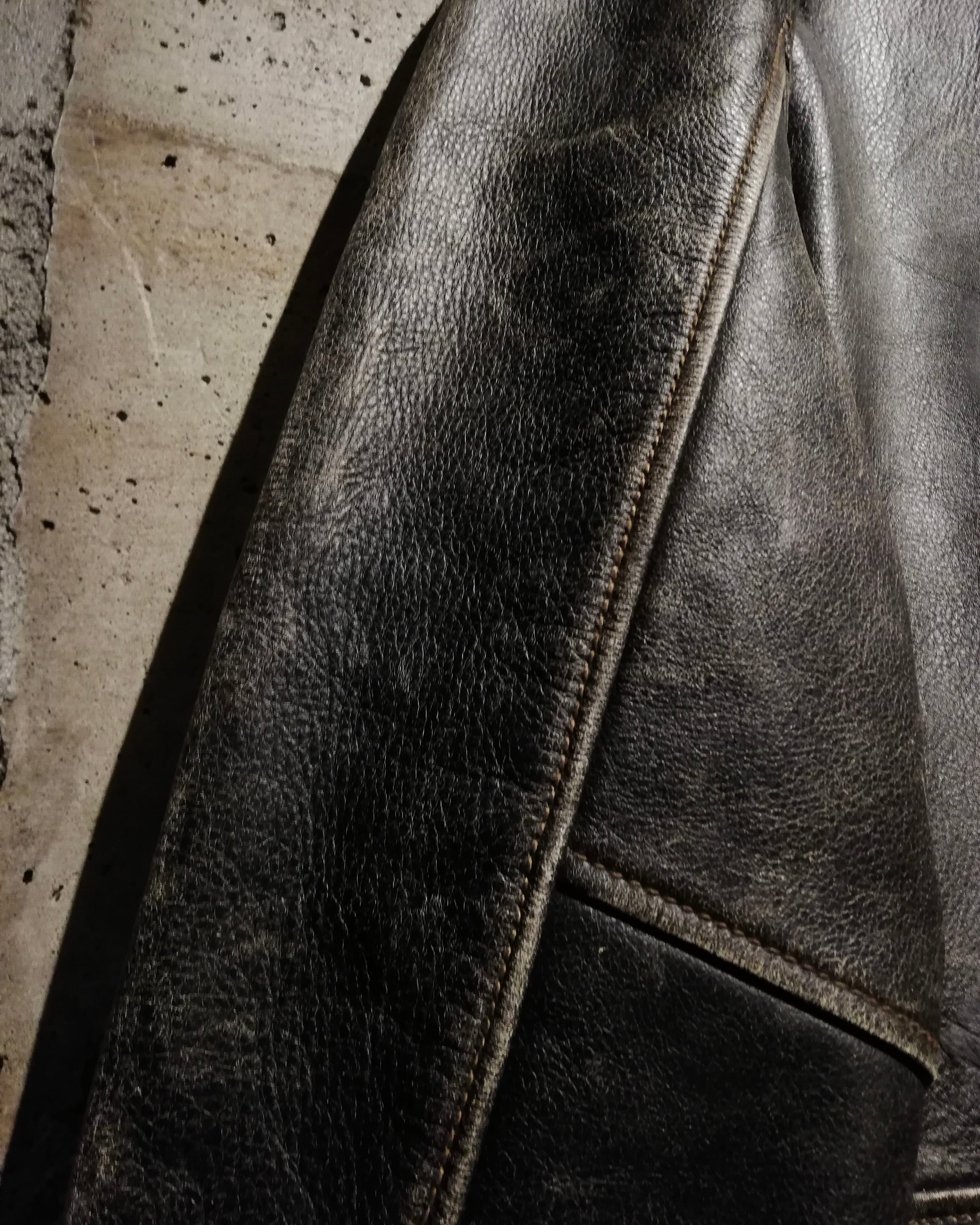 ボディにはしなやかで厚みのあるリアルレザーを使用。長年着込まれたクラッキングと自然な艶が生み出すグラデーションは、人工的には再現できない唯一無二の表情を放ちます。