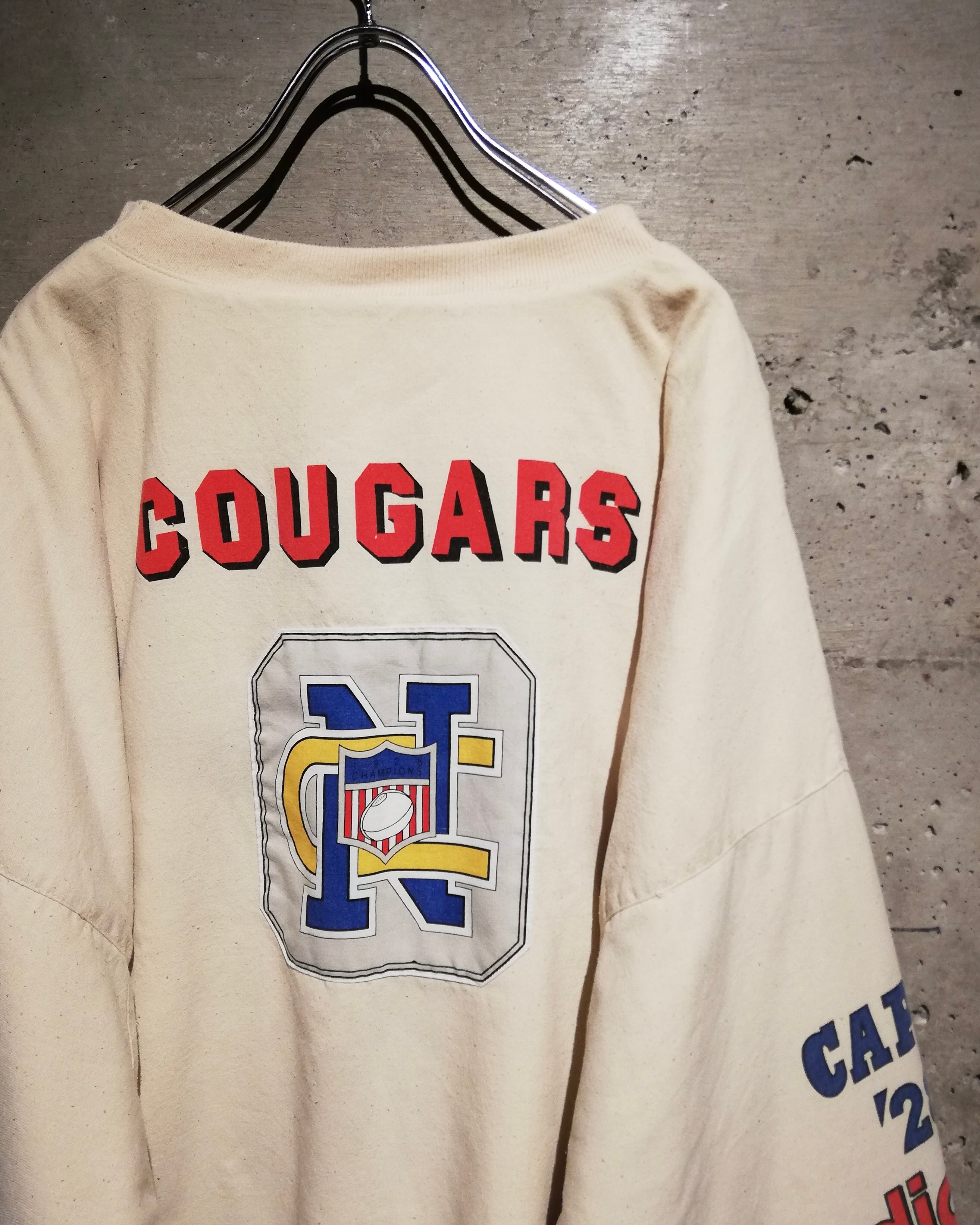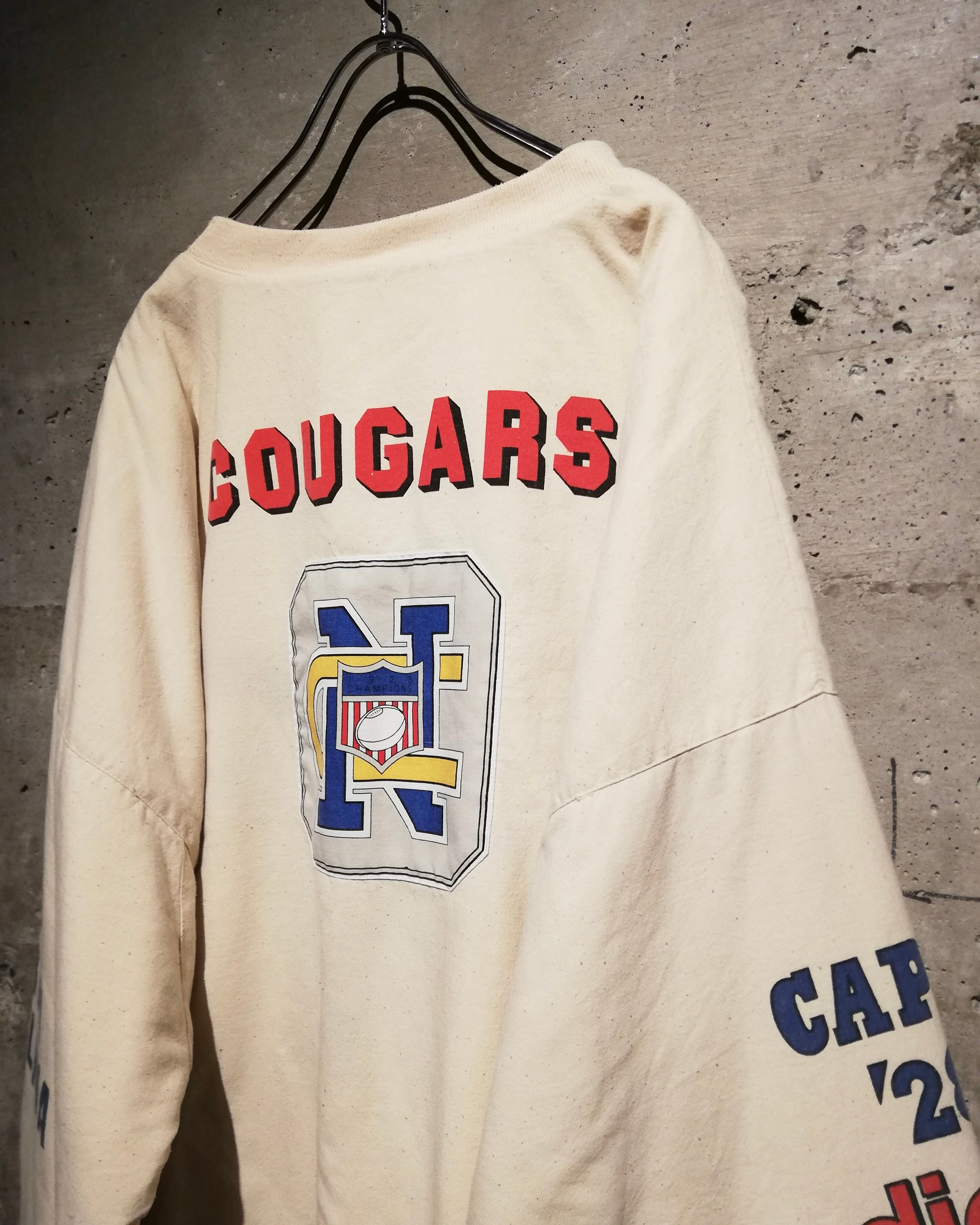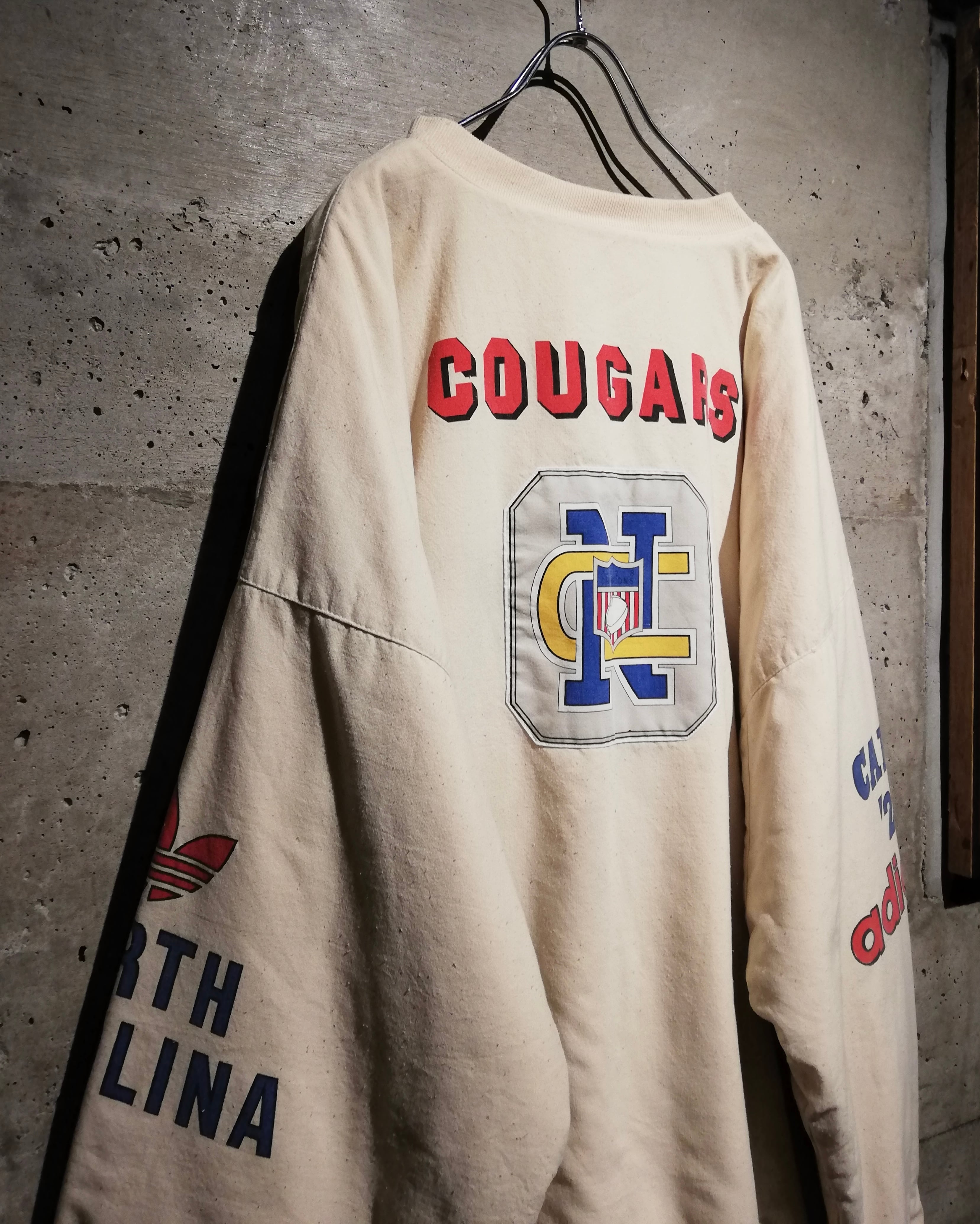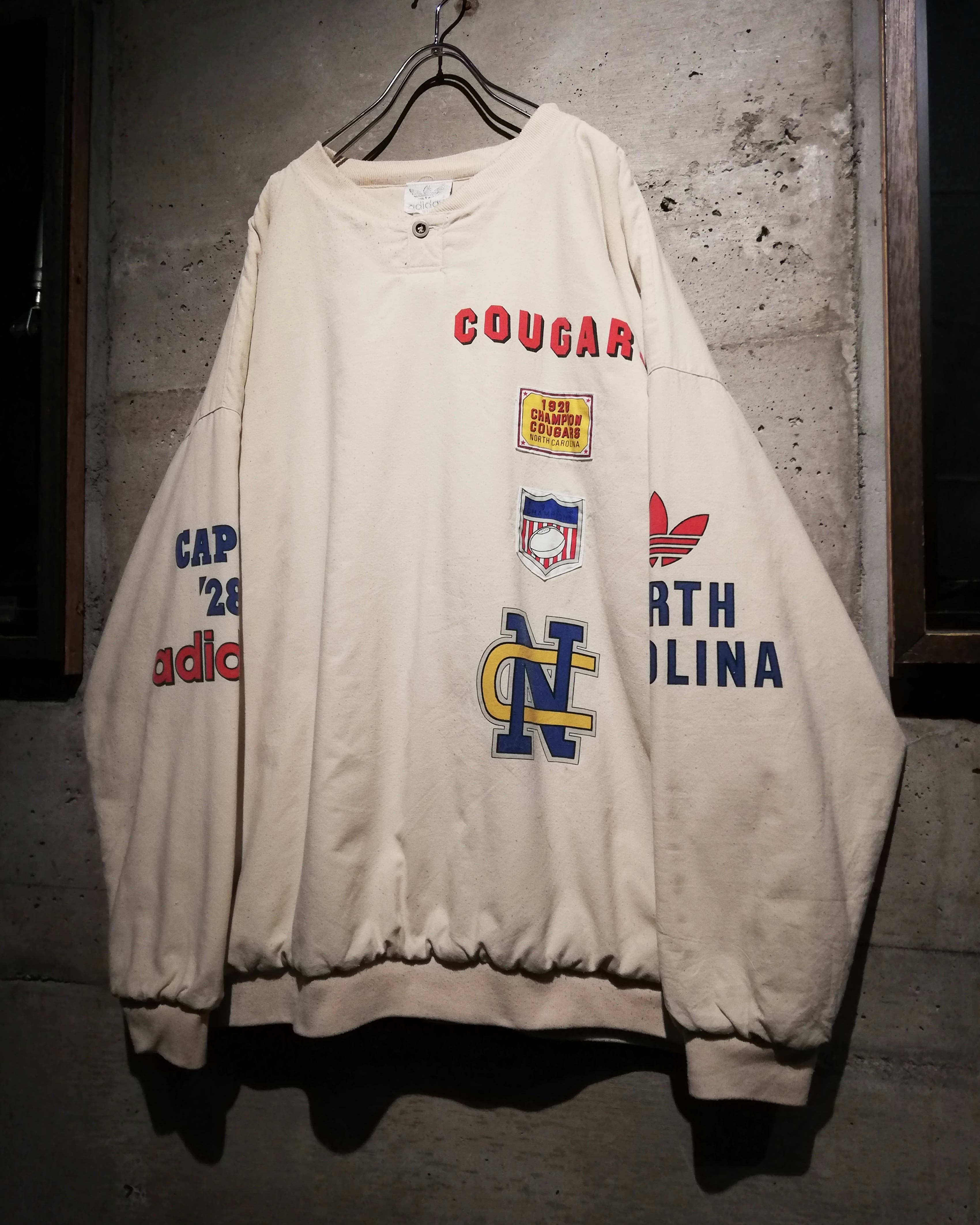 “COUGARS”や“NORTH CAROLINA”のカレッジ、チームのモチーフのプリント&パッチ載せたヘンリーネックプルオーバー。