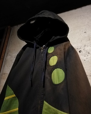 くすんだブラックボディをベースに、鮮やかなグリーンやイエローのサークル&パッチワークでモチーフを大胆に配置。