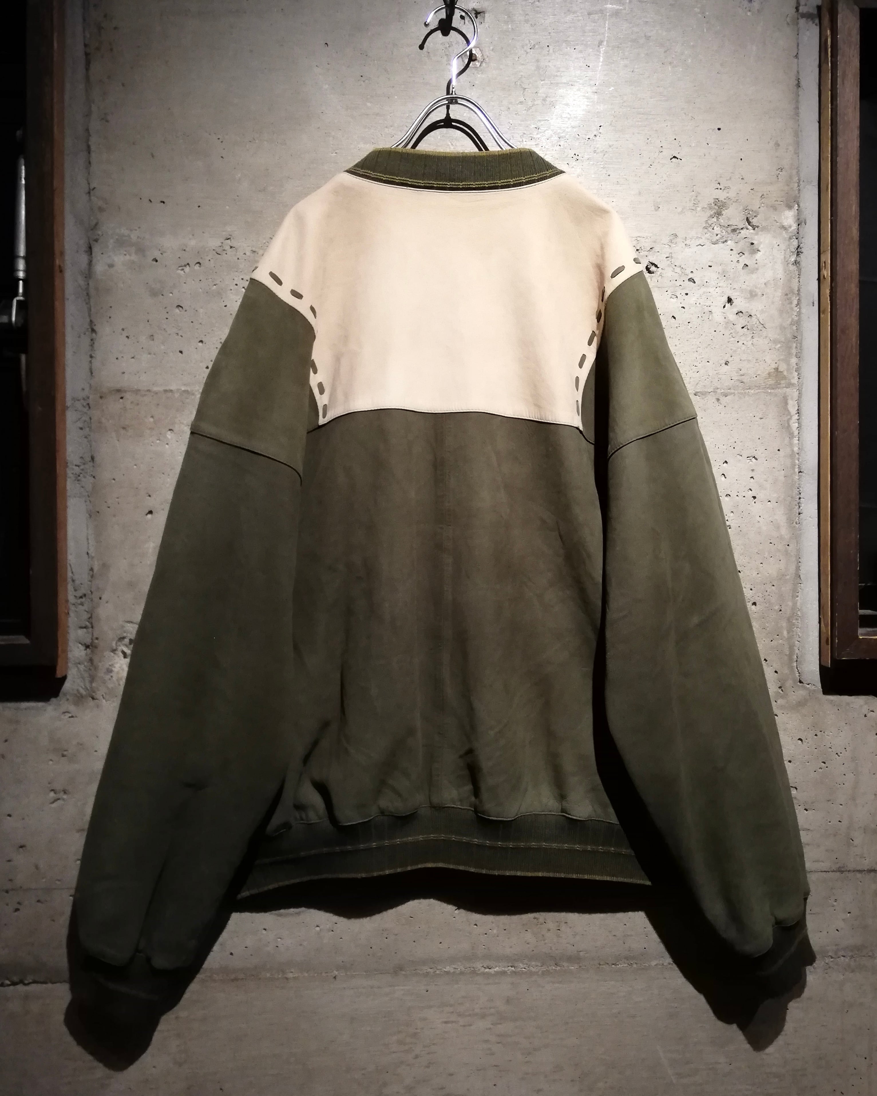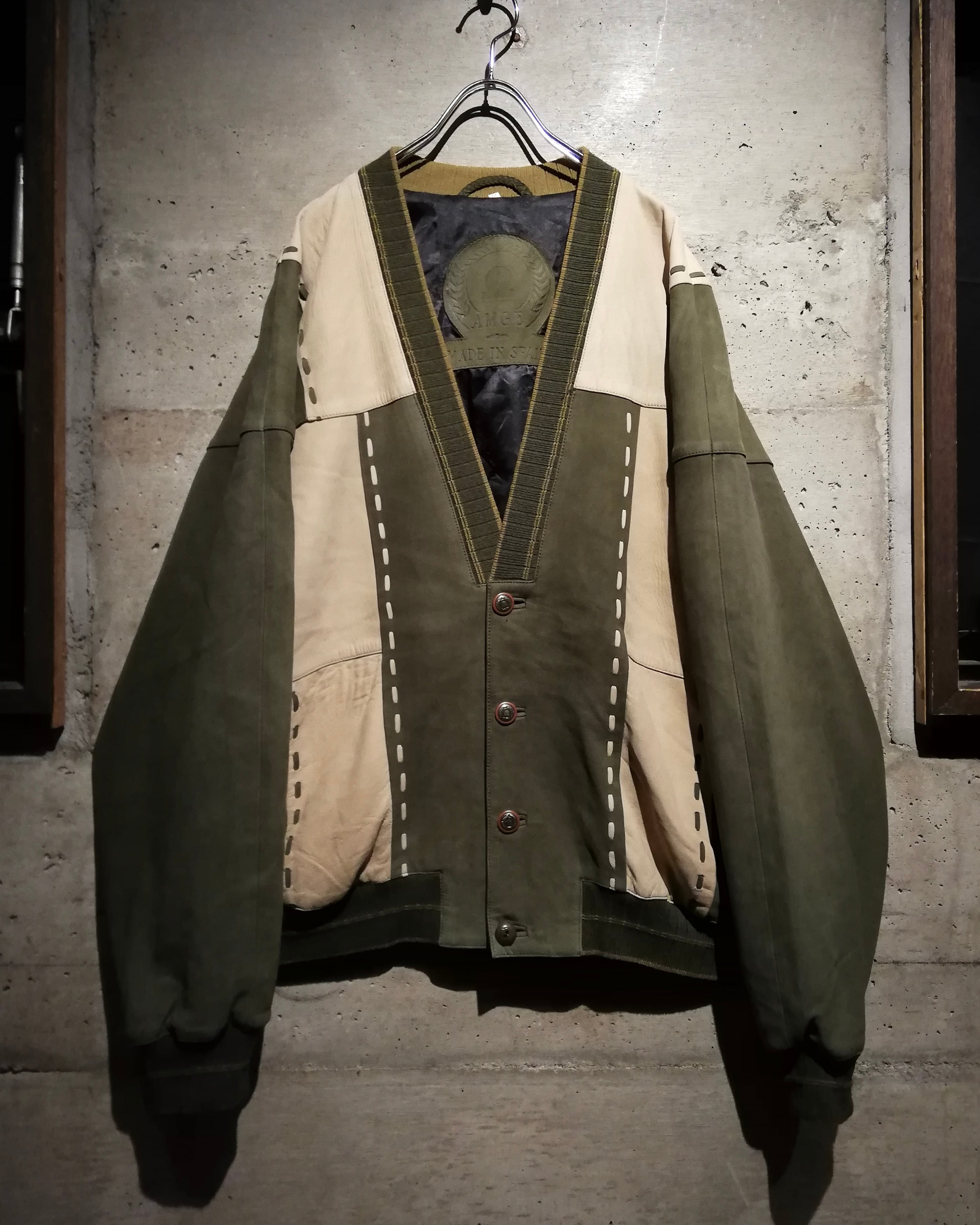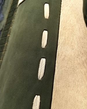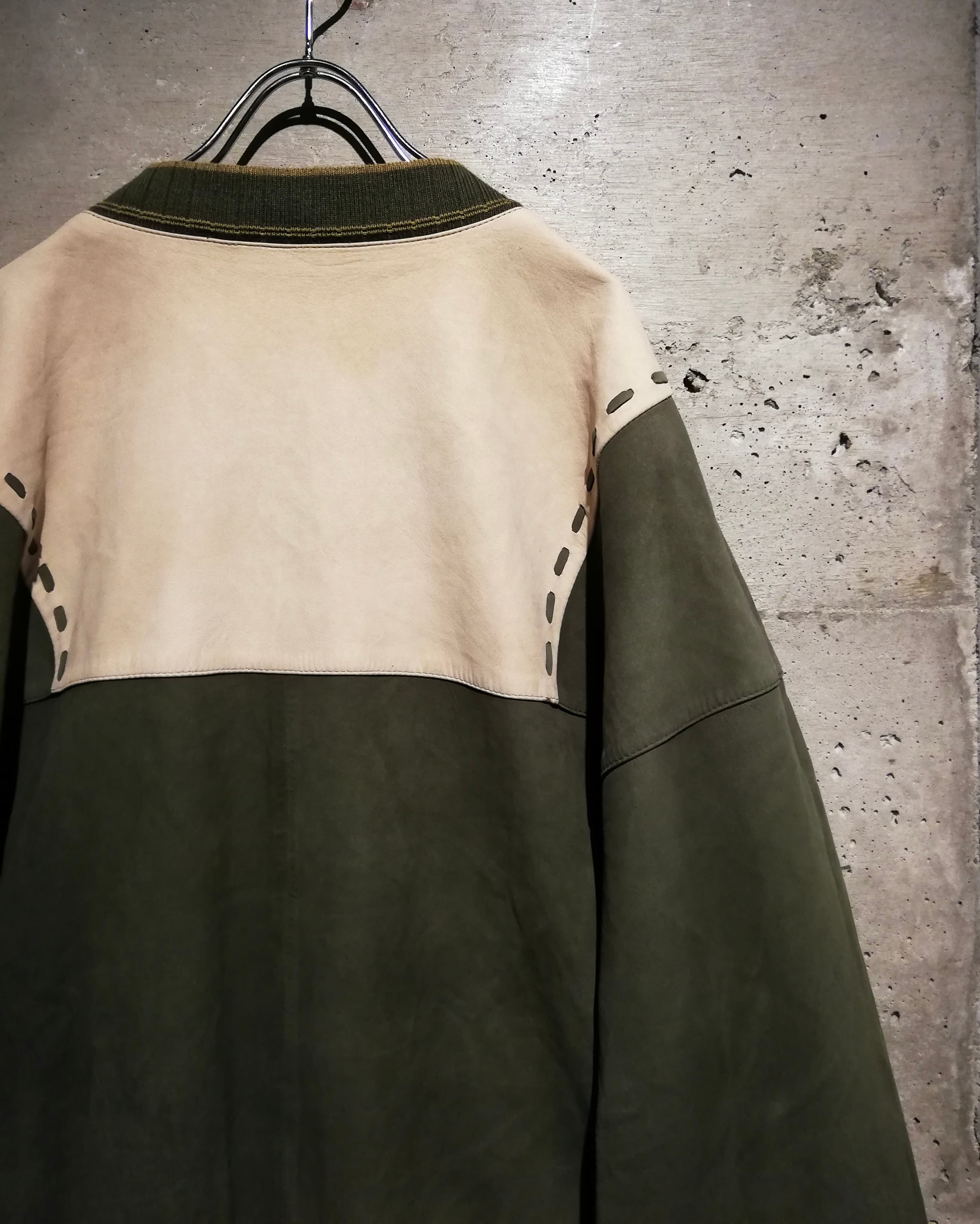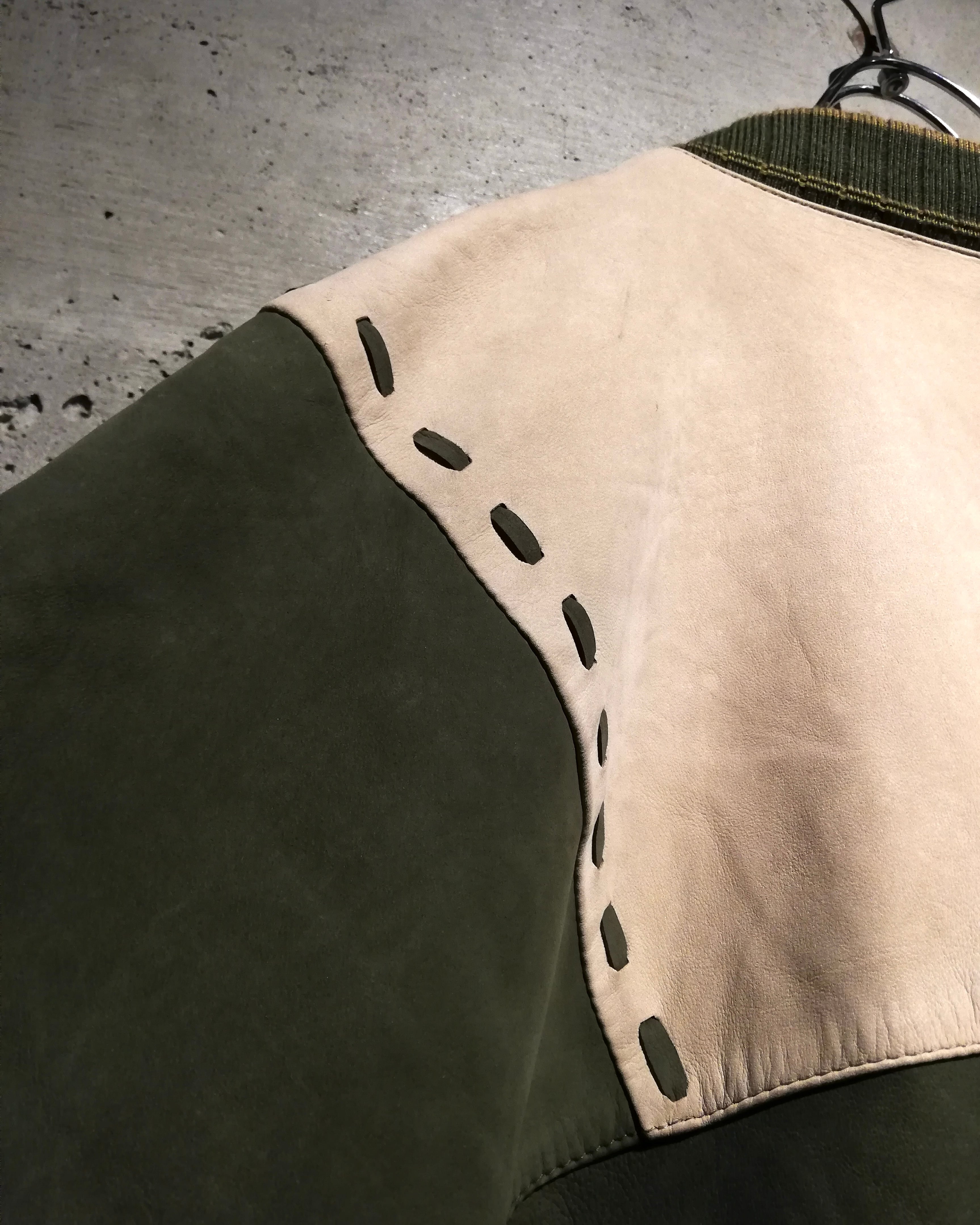 柔らかな質感の上質なヌバックレザーを用いて、オリーブとサンドベージュのツートーン切り替えで構成されたパネルデザインが目を惹きます。