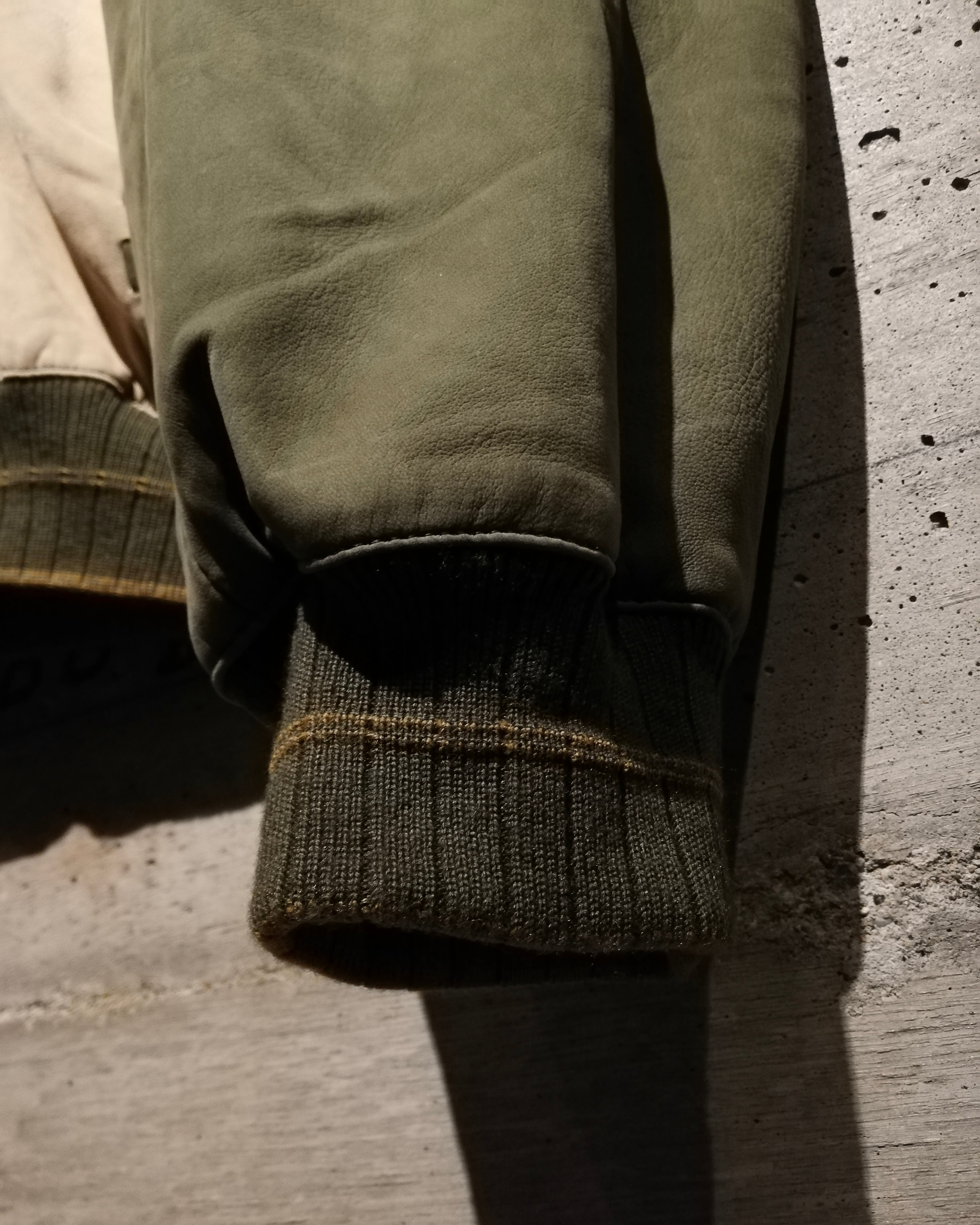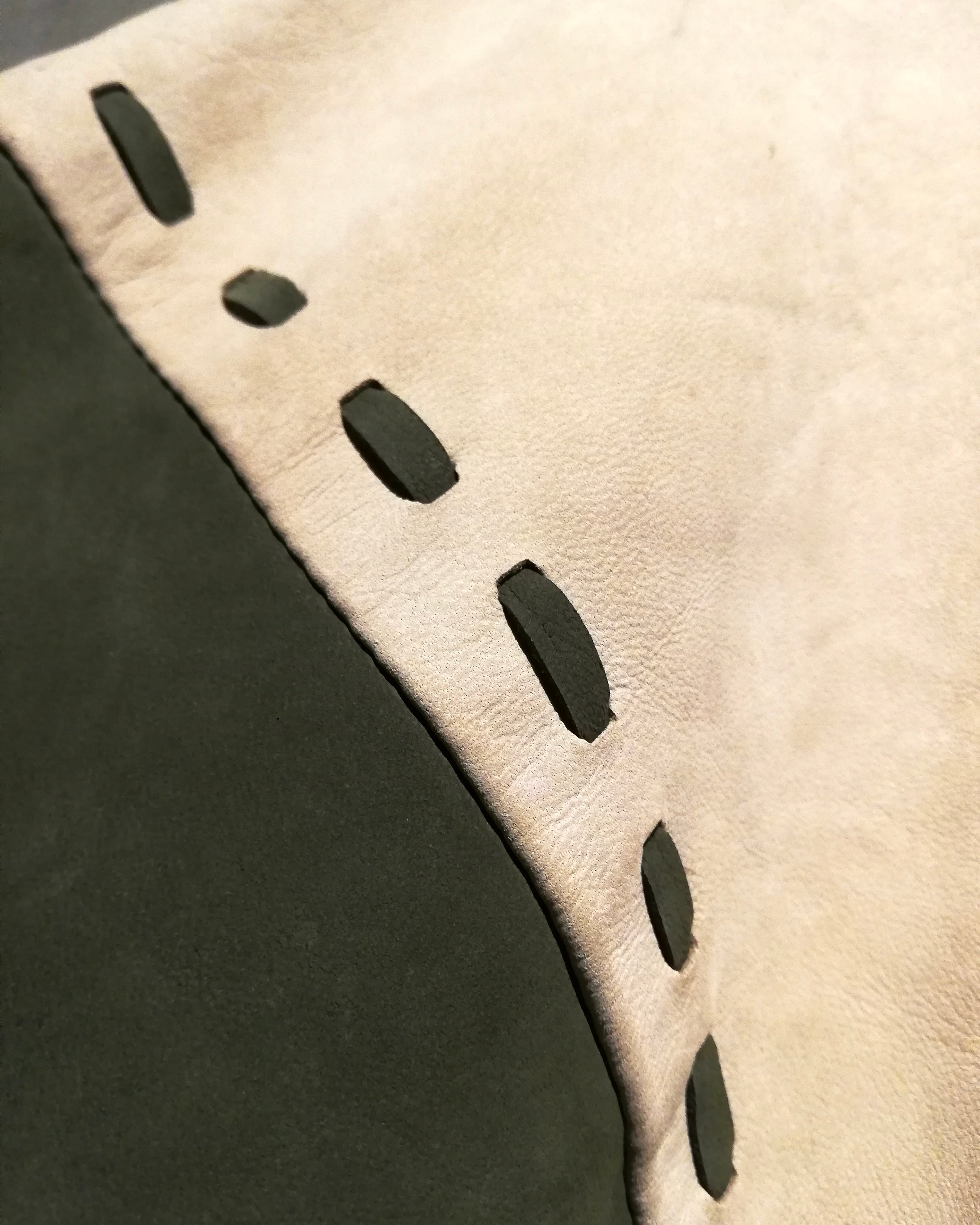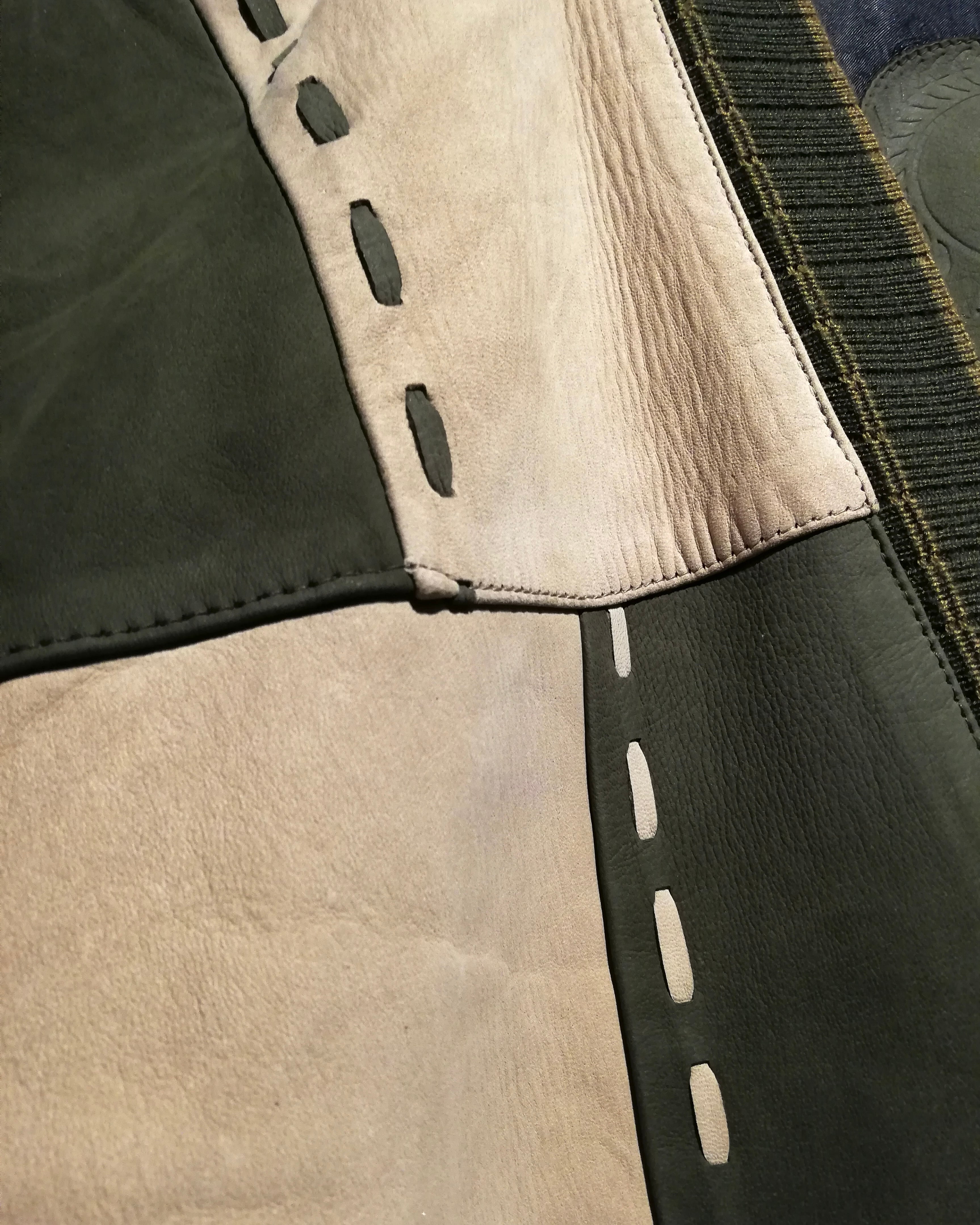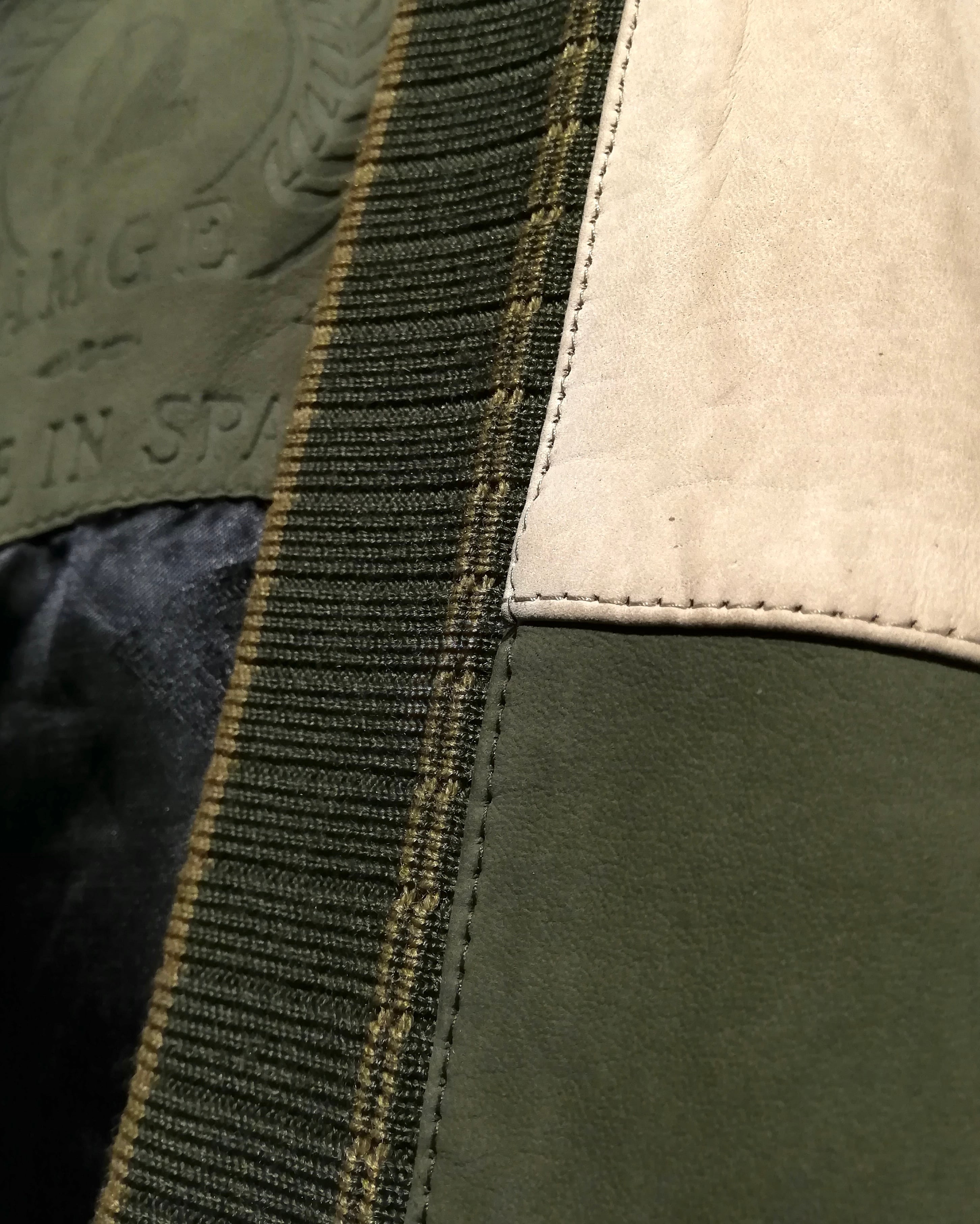 柔らかな質感の上質なヌバックレザーを用いて、オリーブとサンドベージュのツートーン切り替えで構成されたパネルデザインが目を惹きます。