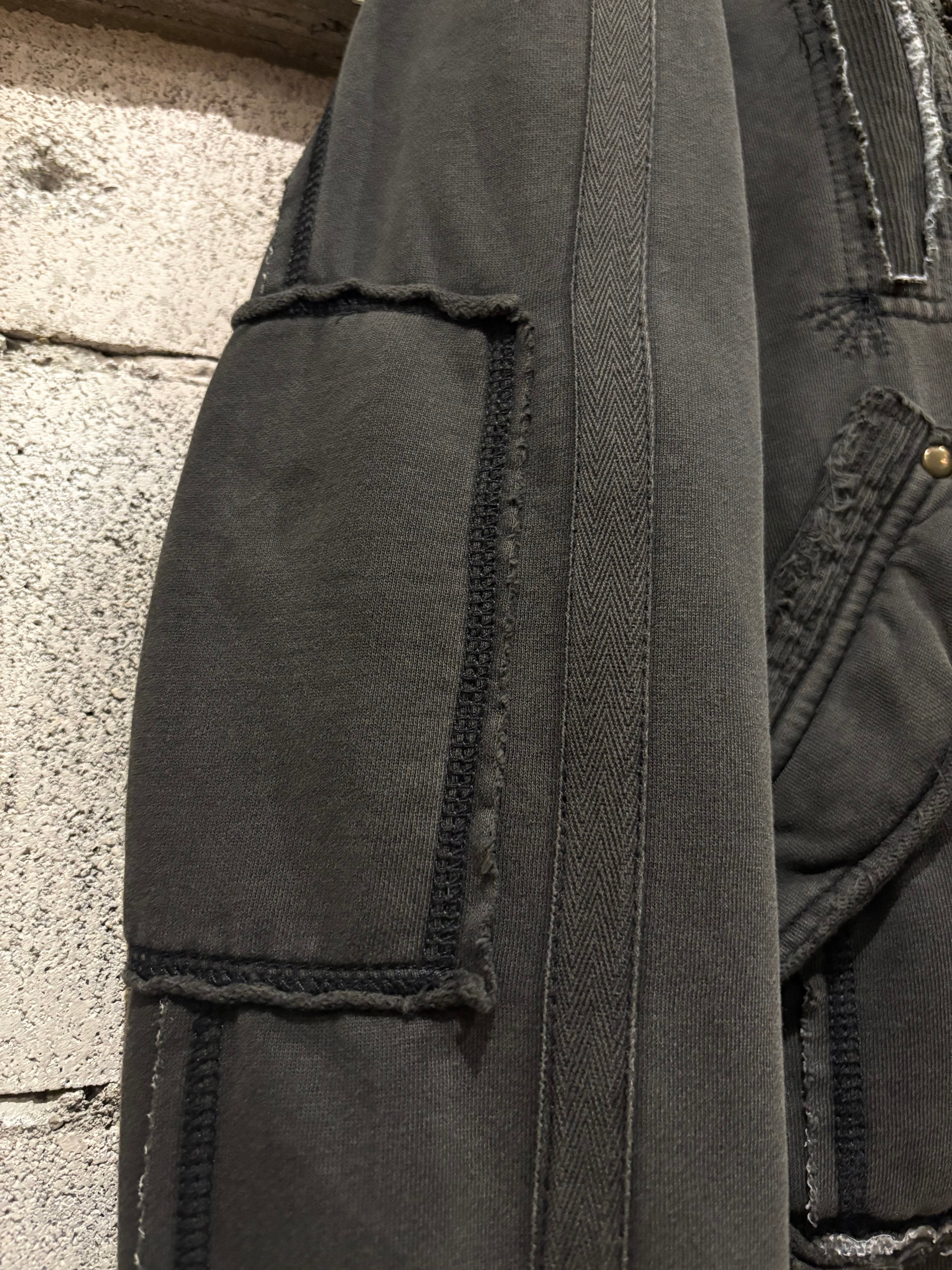 全体に施されたウォッシュ加工がチャコールグレーの色味に奥行きを与え、長年着込んだような自然な風合いを演出。インサイドアウト仕様の縫製によって、ステッチや縫い代がデザインとして際立ち、無骨さとモードさが絶妙に共存する仕上がりに。