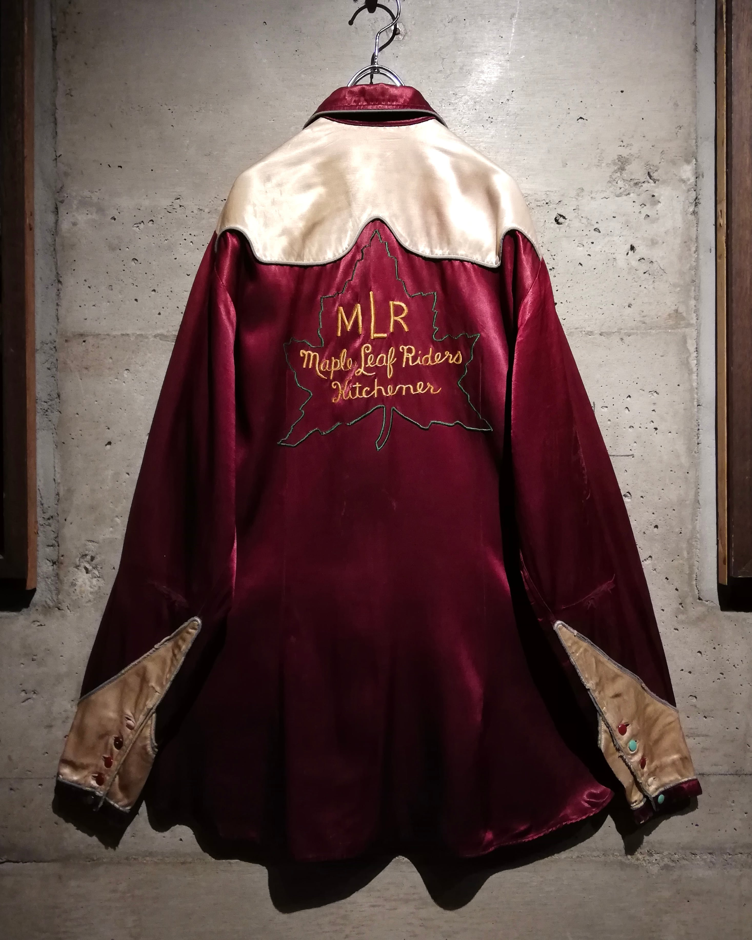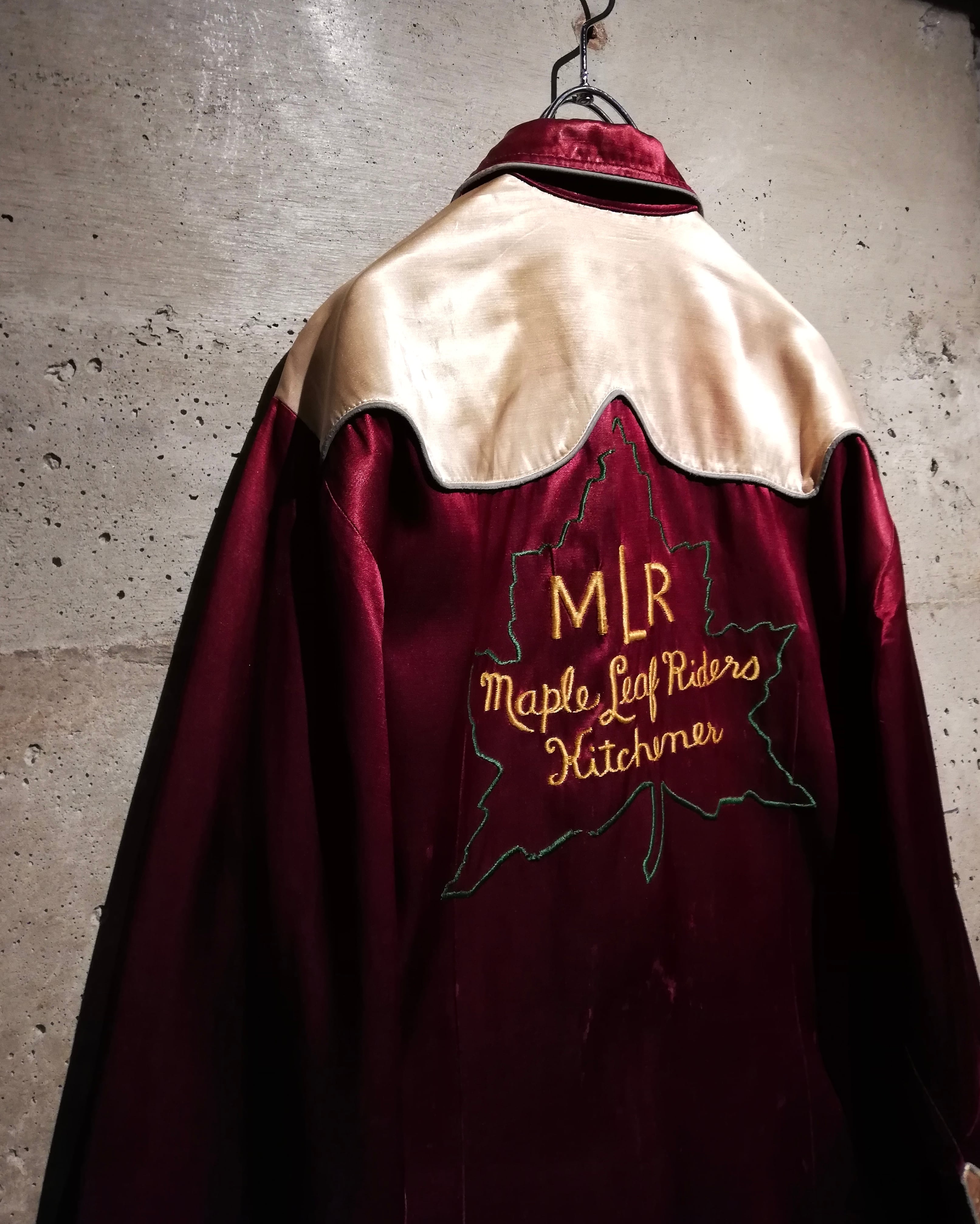 背面にはメイプルリーフをモチーフとした指針が大胆に配され、「MLR Maple Leaf Riders Kitchener」とクラブネームが刺繍で刻まれています。単なるファッションアイテムに留まらず、当時のコミュニティやカルチャーを象徴するユニフォーム的な意味合いを持つ非常に価値の高い一枚かと。