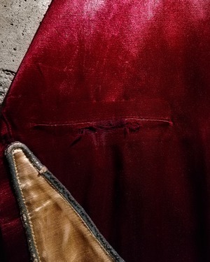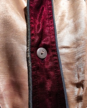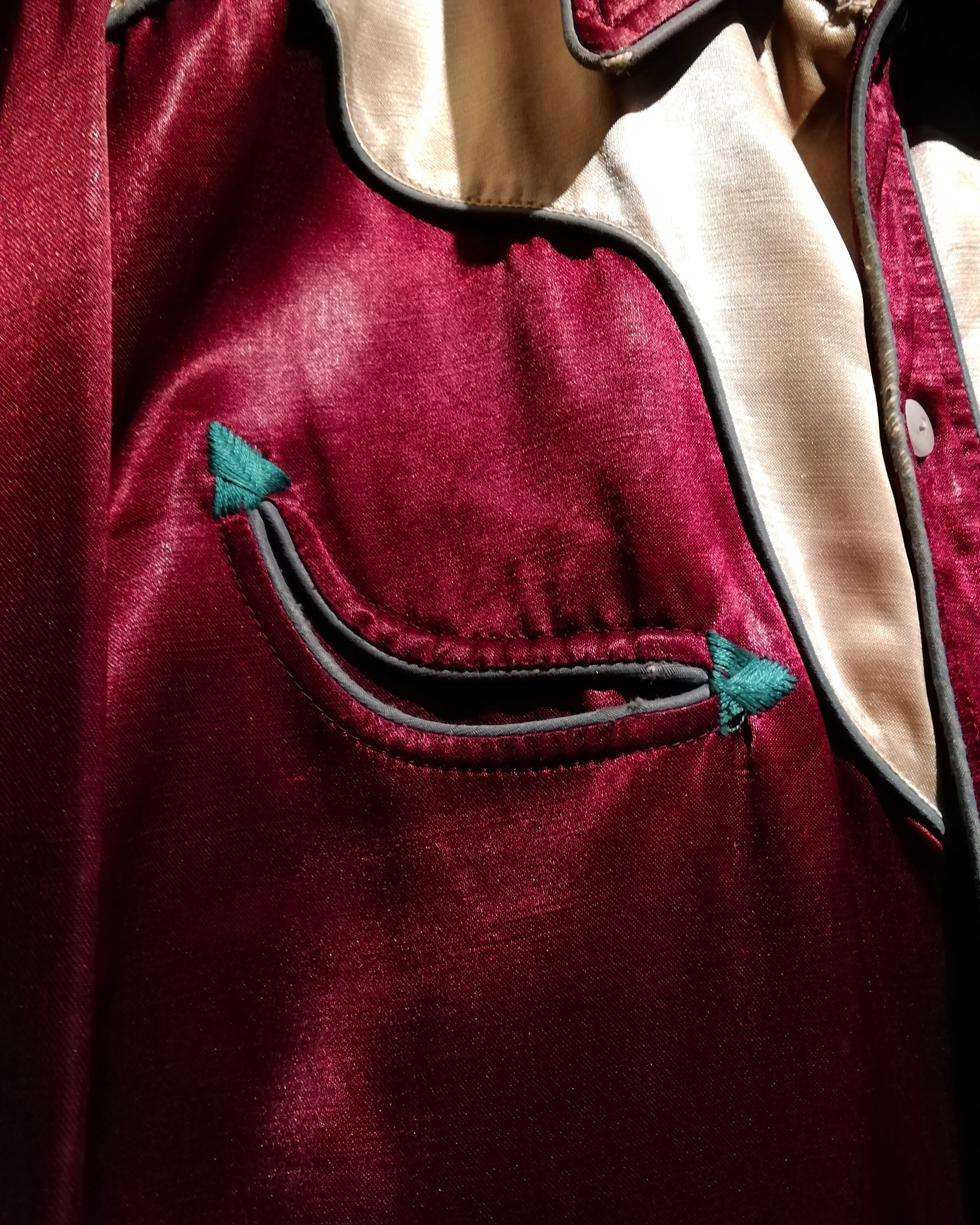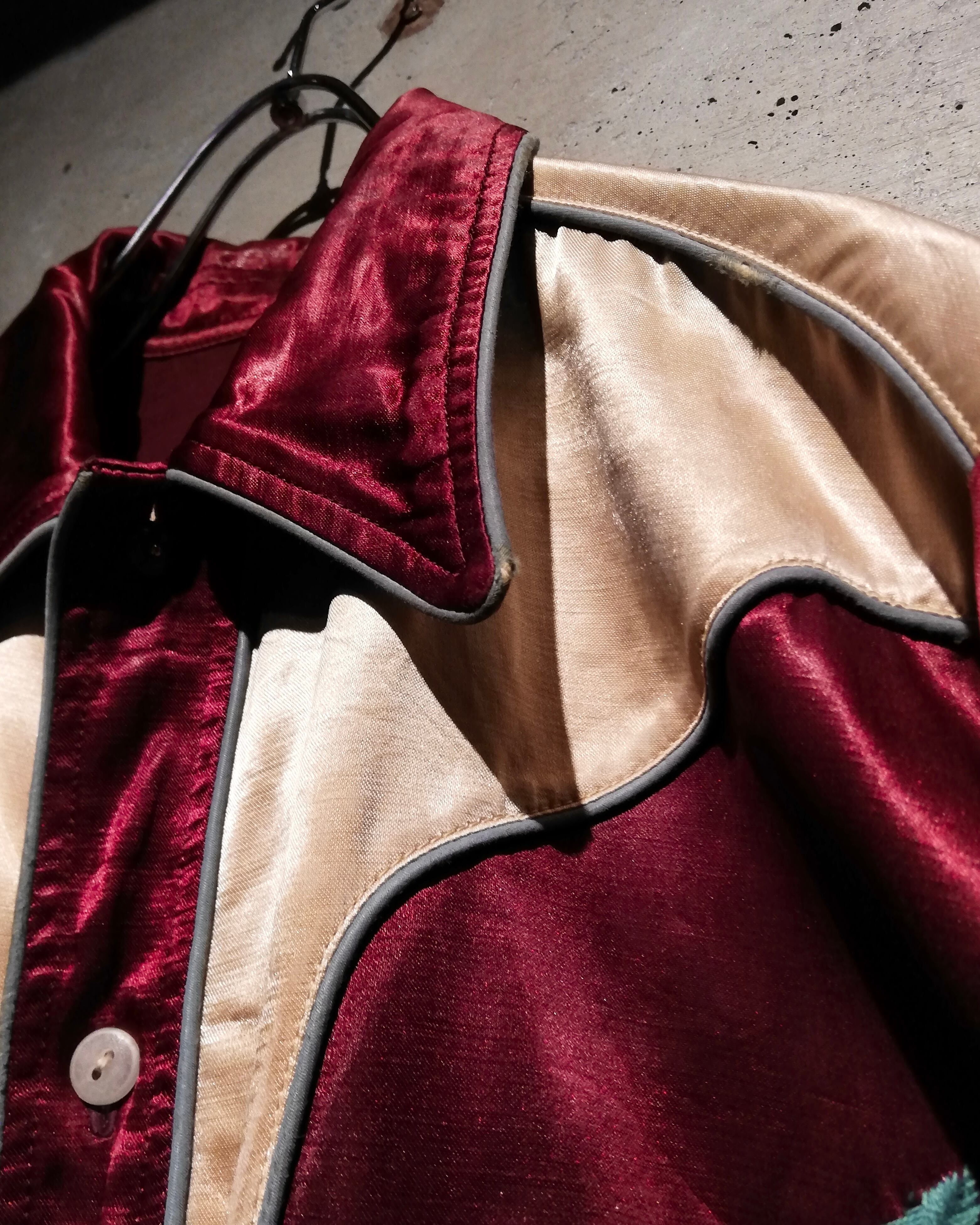 深いバーガンディのサテン生地をベースに、光沢感のある質感と柔らかな落ち感が特徴的で、艶やかな存在感を放っています。ヨーク部分やカフスにはベージュの切り替えが入り、さらに配色パイピングで縁取られた豪華な仕様。アローポケットなスナップボタンとウエスタンウェアらしい遊び心とディテールへのこだわりが強く表れています。
