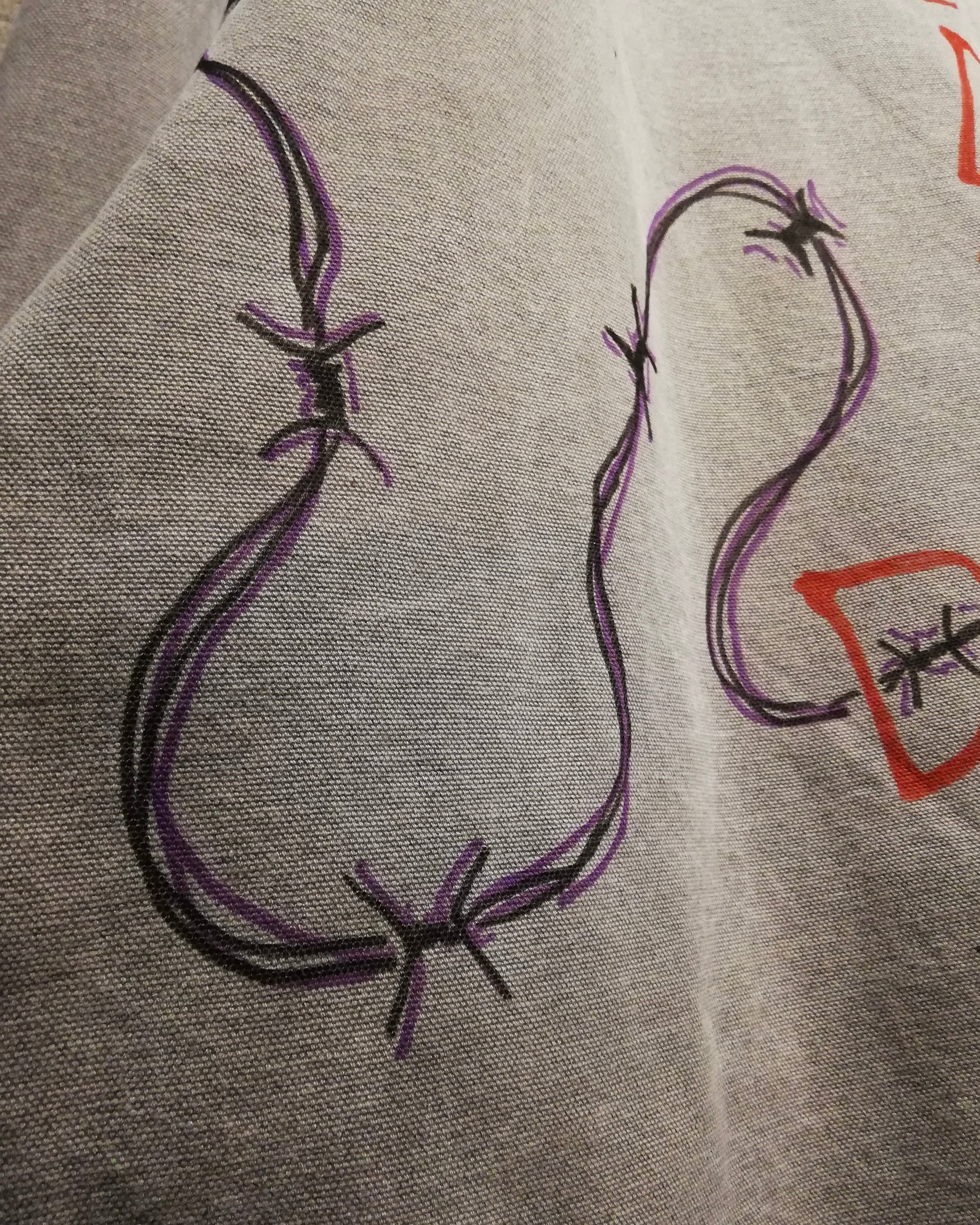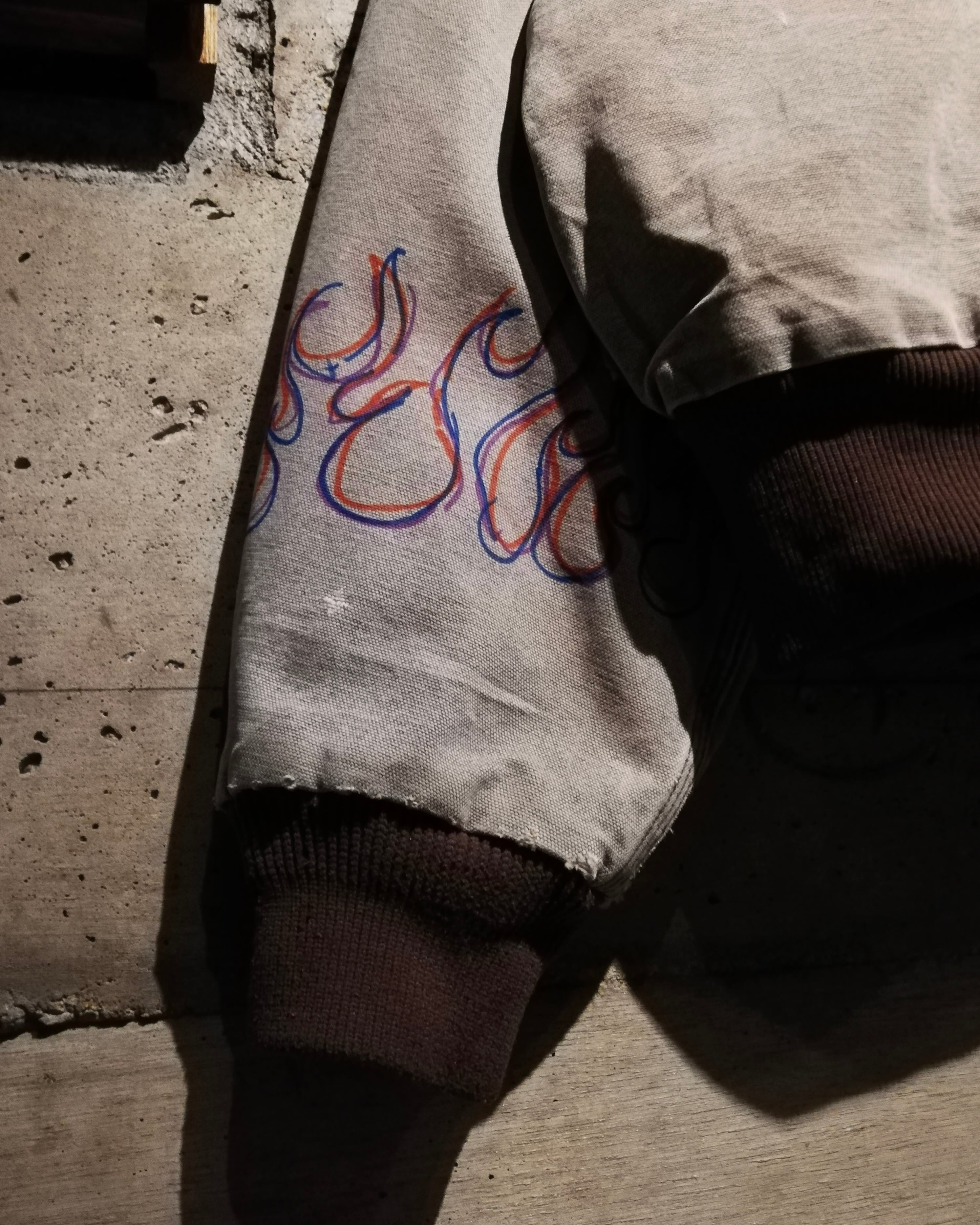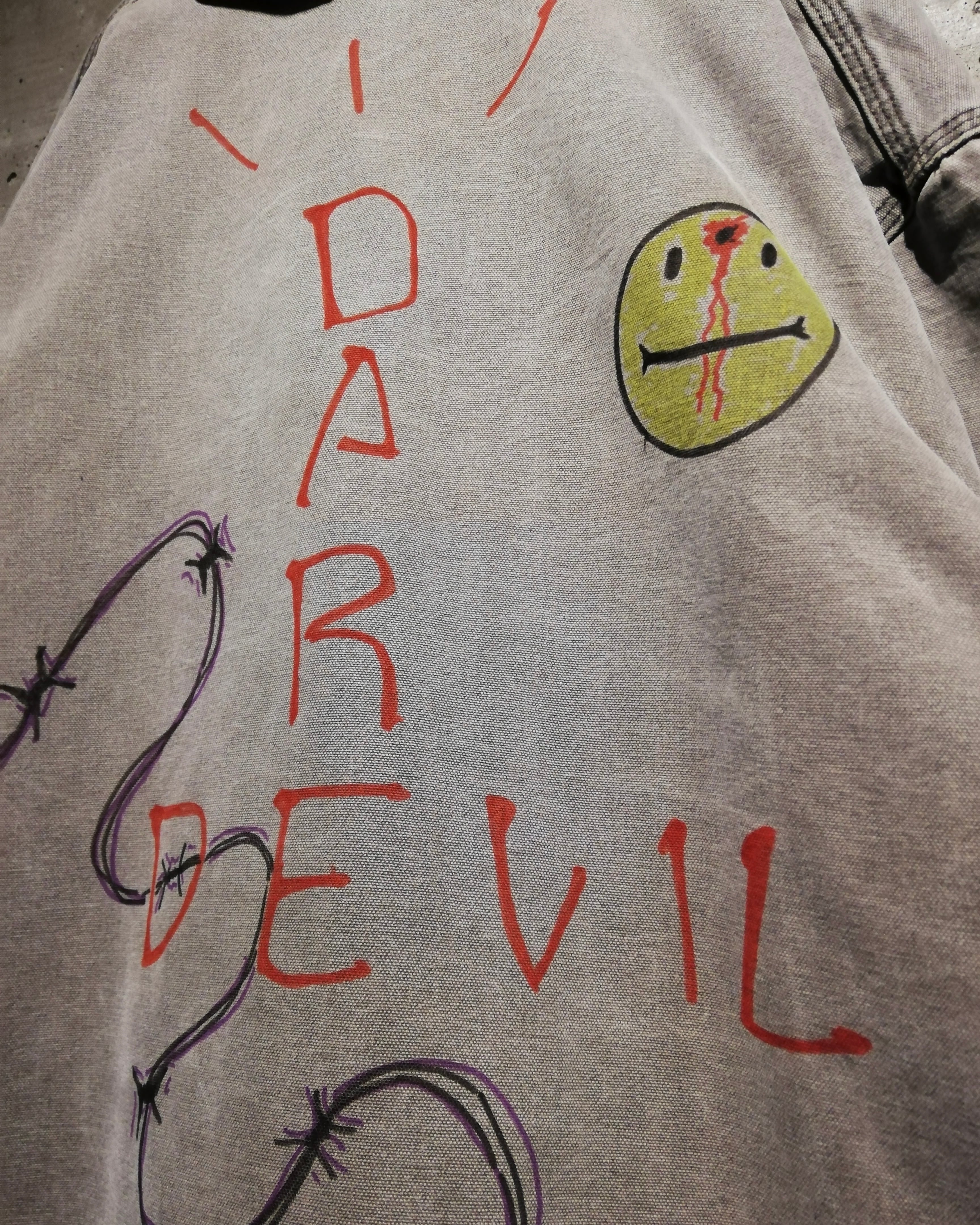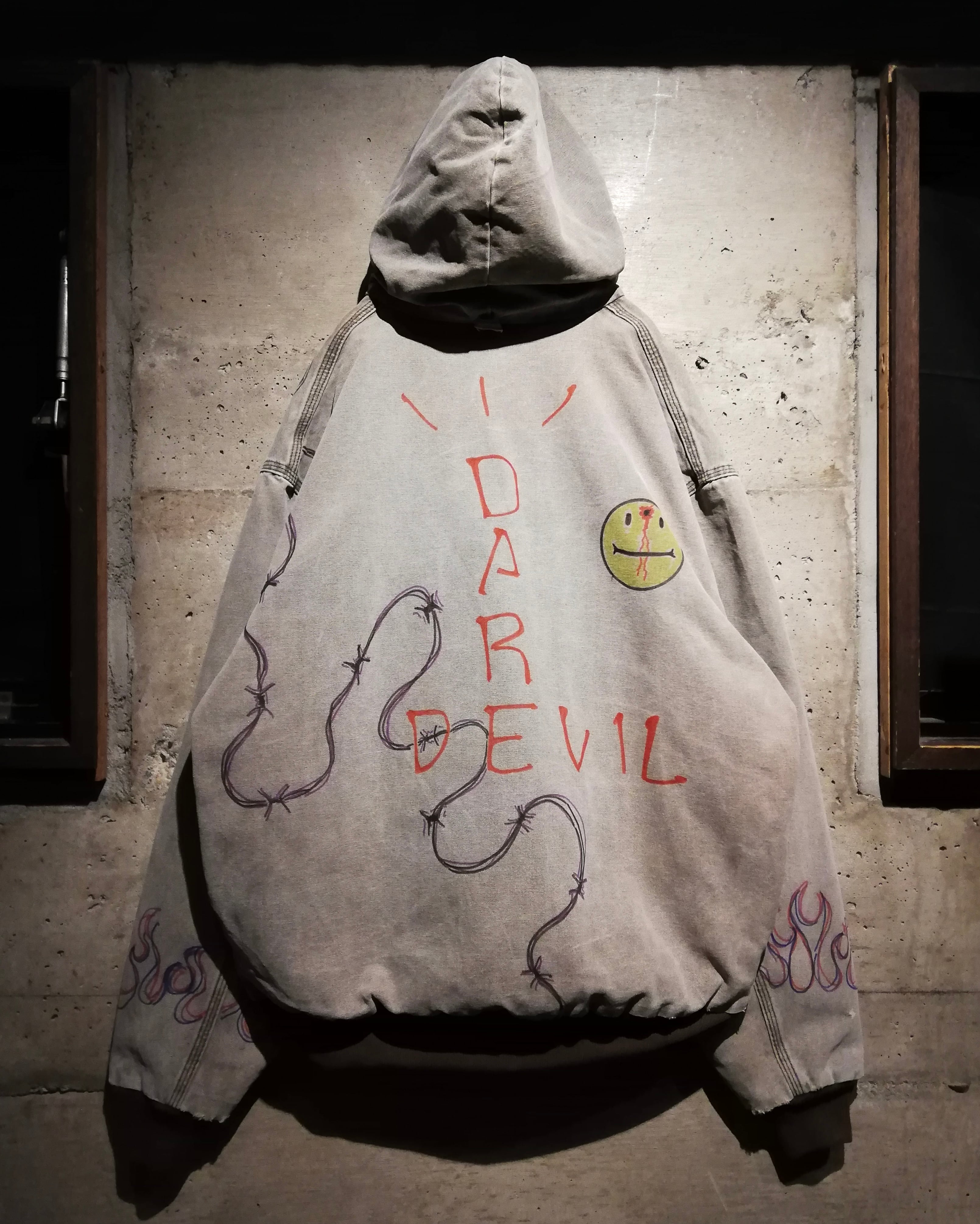 袖口には炎のグラフィック、背面にも描かれた「DAREDEVIL」のロゴ、どこか反骨的でストリートアートの香りを纏うスマイルモチーフと、まさに一点制作のアートウェアと言っても過言ではありません。