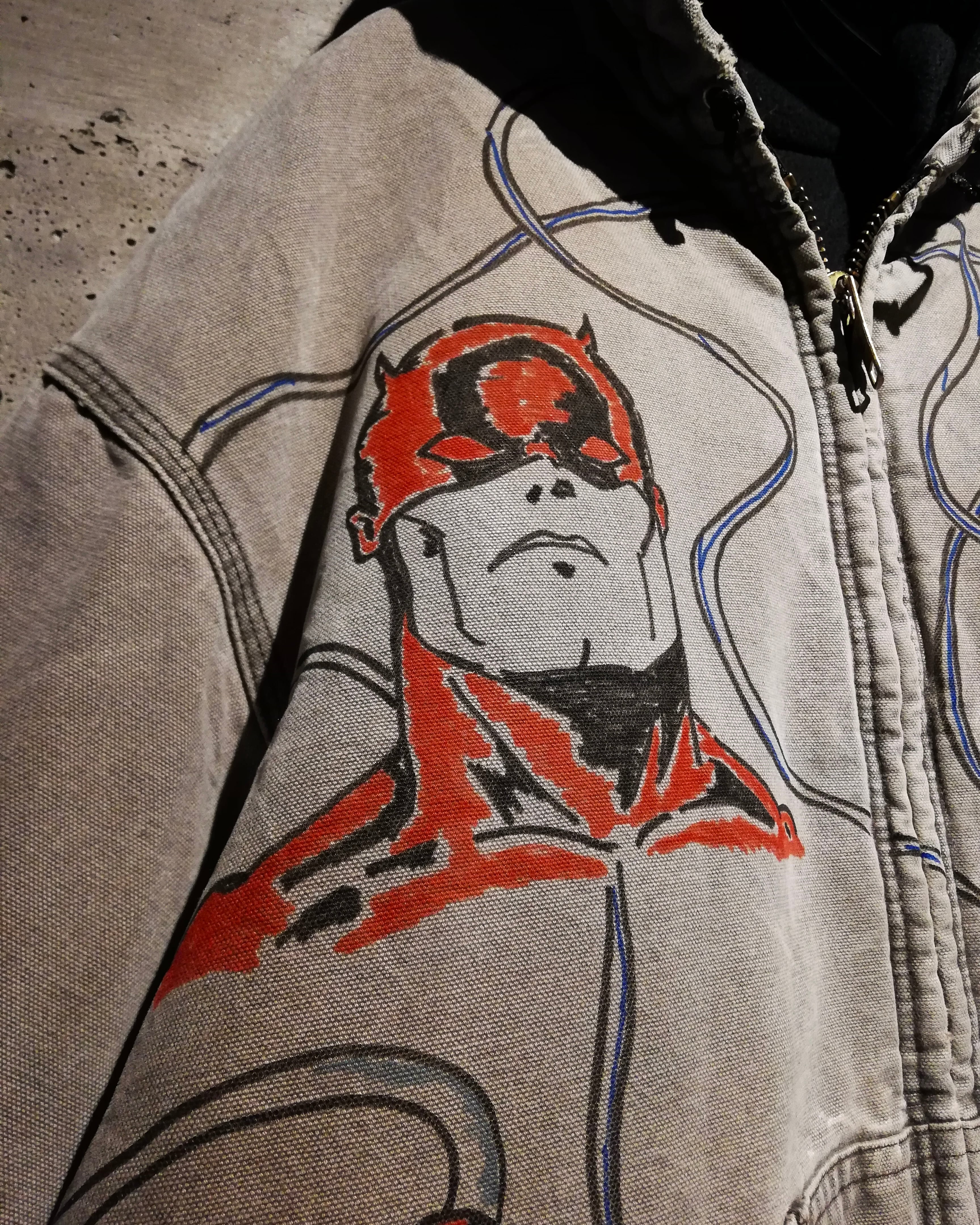 ヘヴィーオンスのコットンダックに、経年変化によるフェード感やアタリが現れた表情豊かなボディ。その上から大胆に描かれたのは、MARVELの人気キャラクター “DAREDEVIL”。