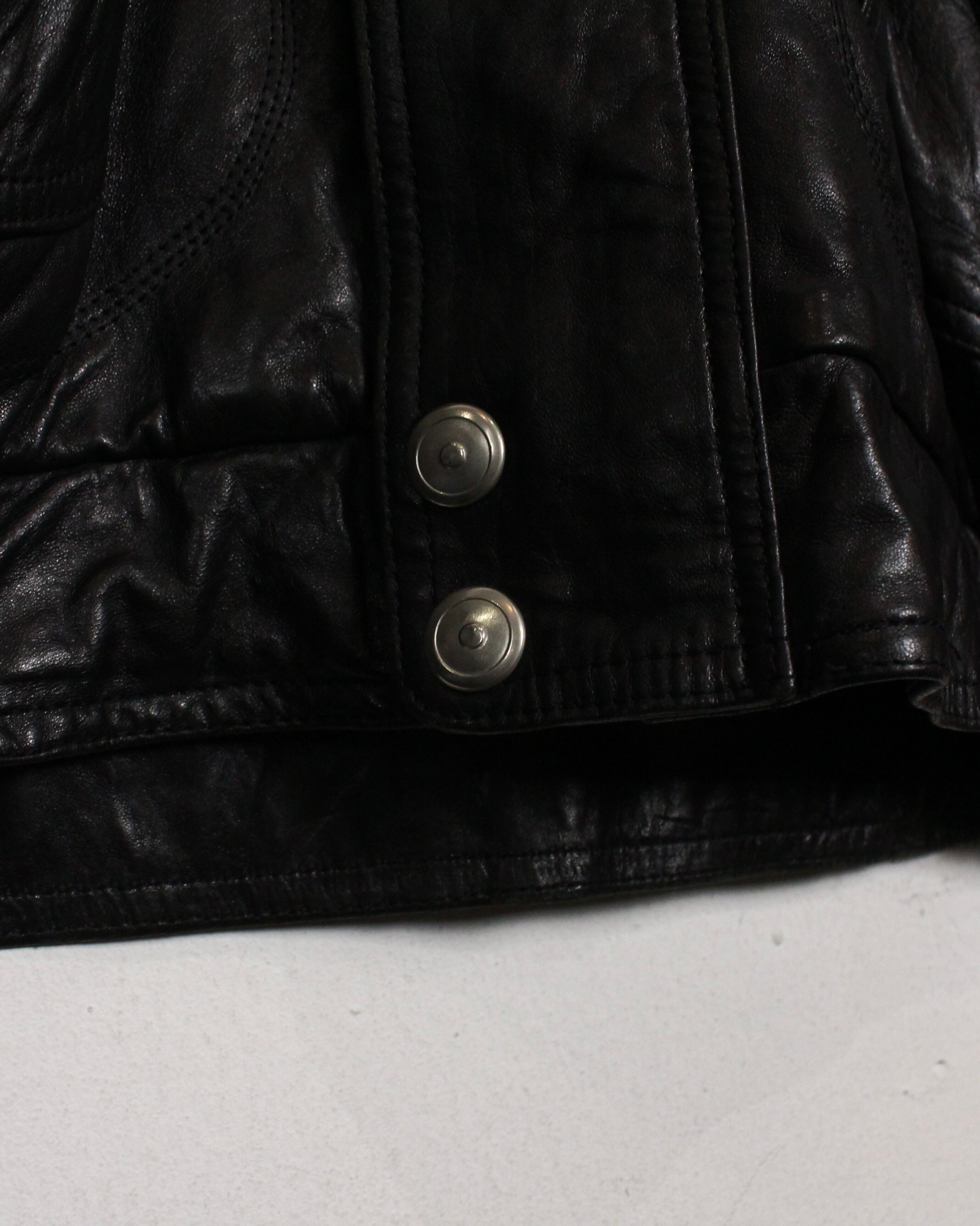 しなやかで厚みのあるリアルレザーを採用し、長年の着用により生まれた艶とシボ感が唯一無二の表情を生み出しています。着込むほどに身体に馴染む柔軟性を持ち、レザー本来の魅力を存分に堪能できます。