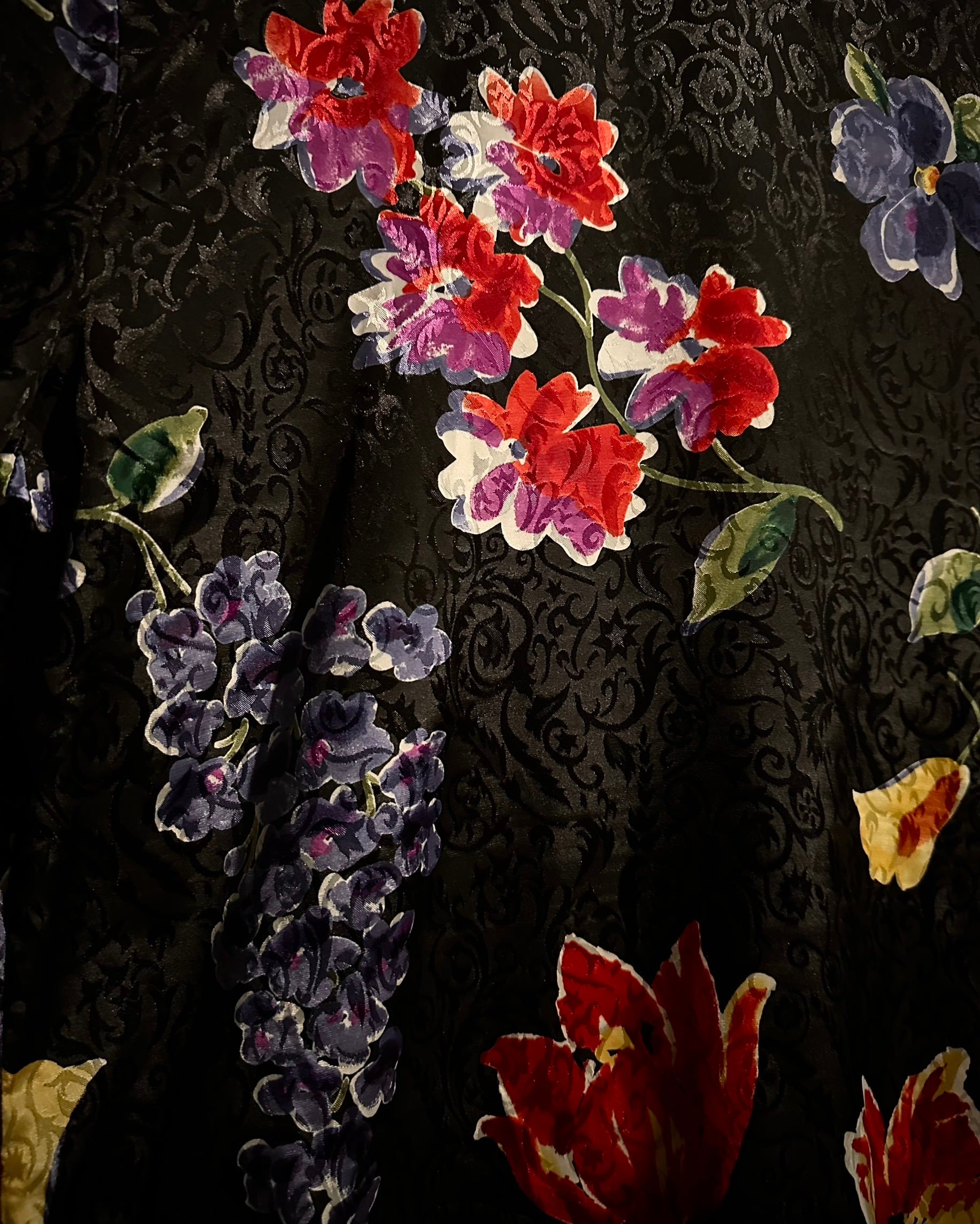 黒のベースに立体的なジャカード織りのアラベスク模様を施し、その上を赤・紫・ブルーグリーンの花々が彩ります。艶感のあるボディと相まって、高級感溢れる佇まいに。