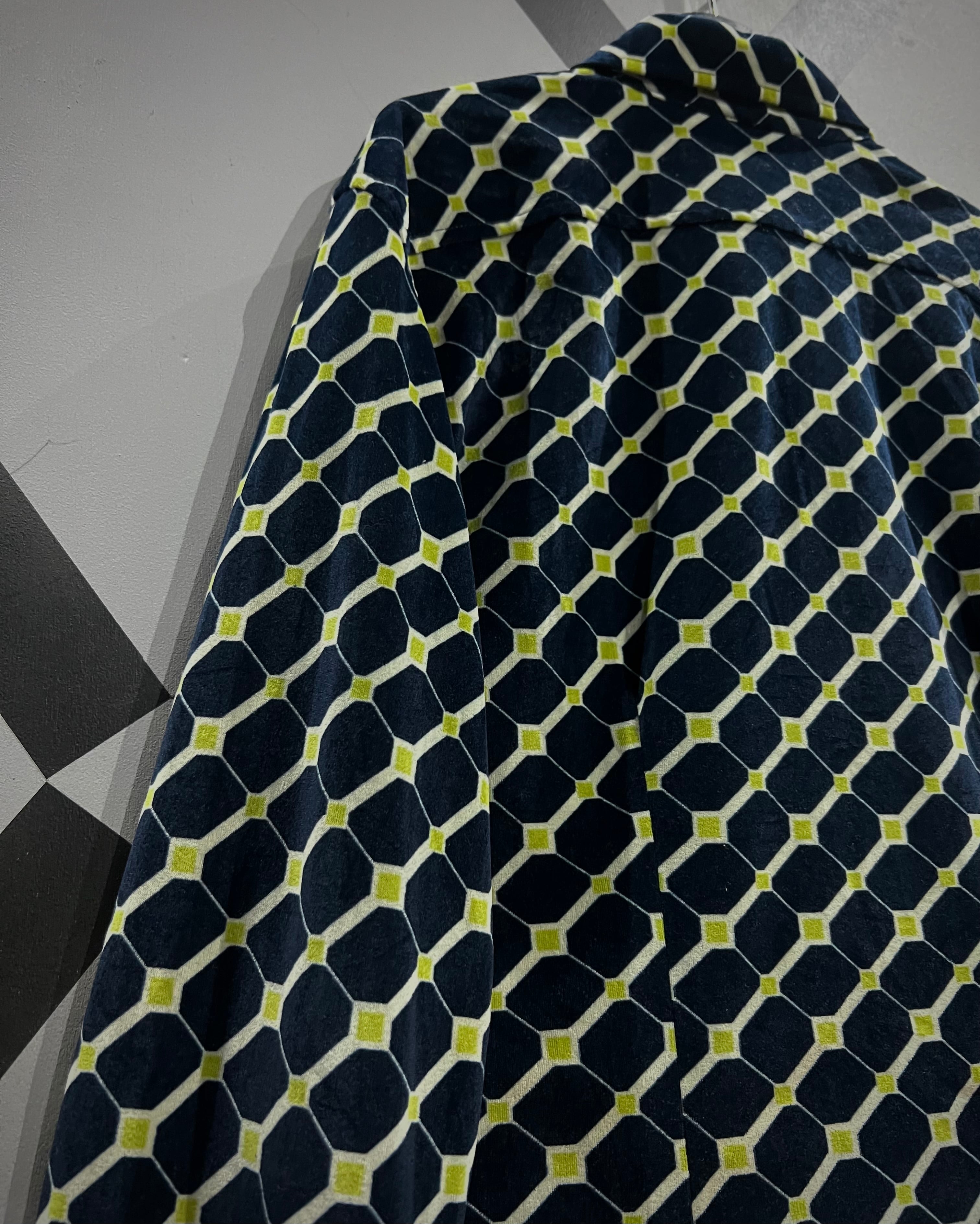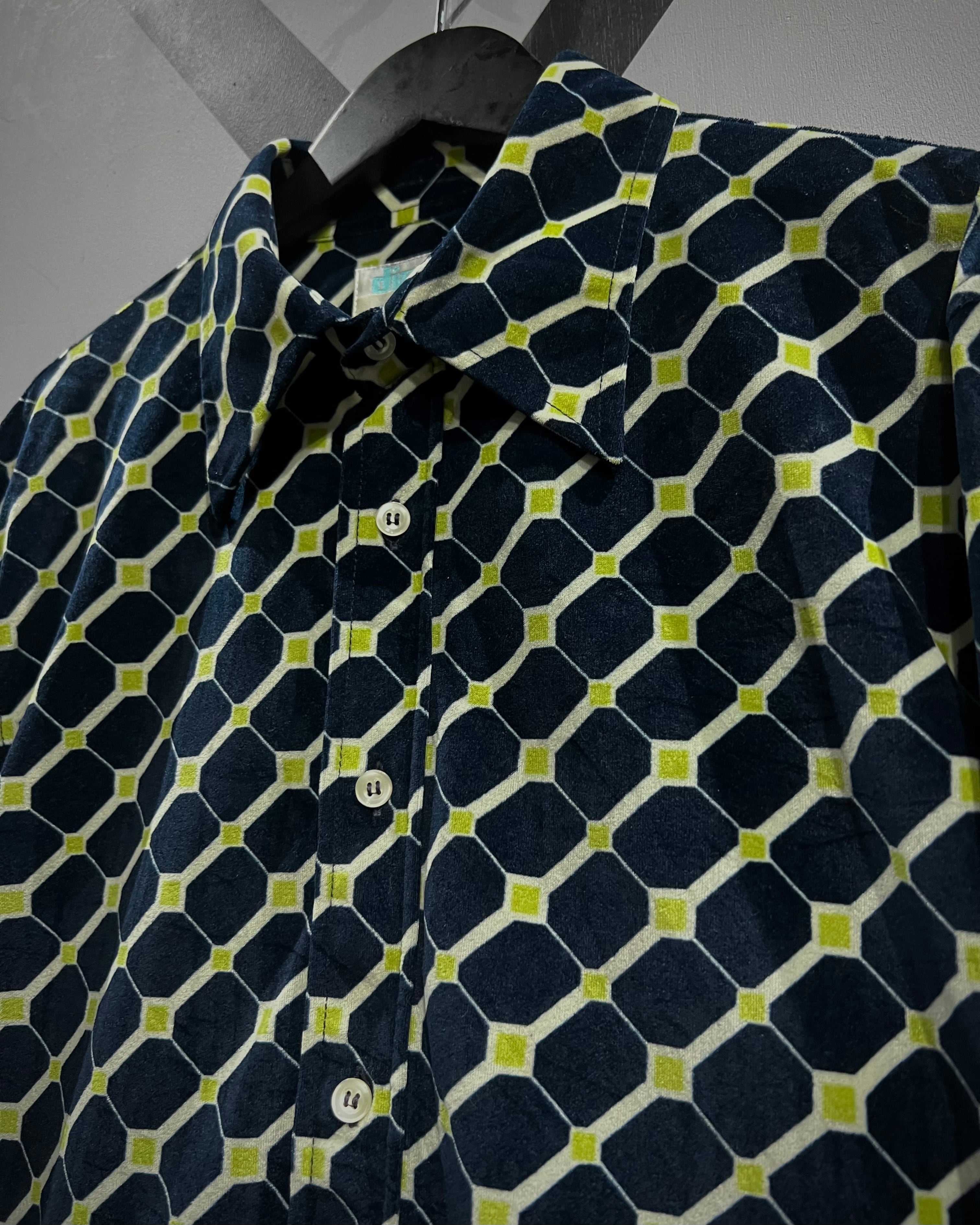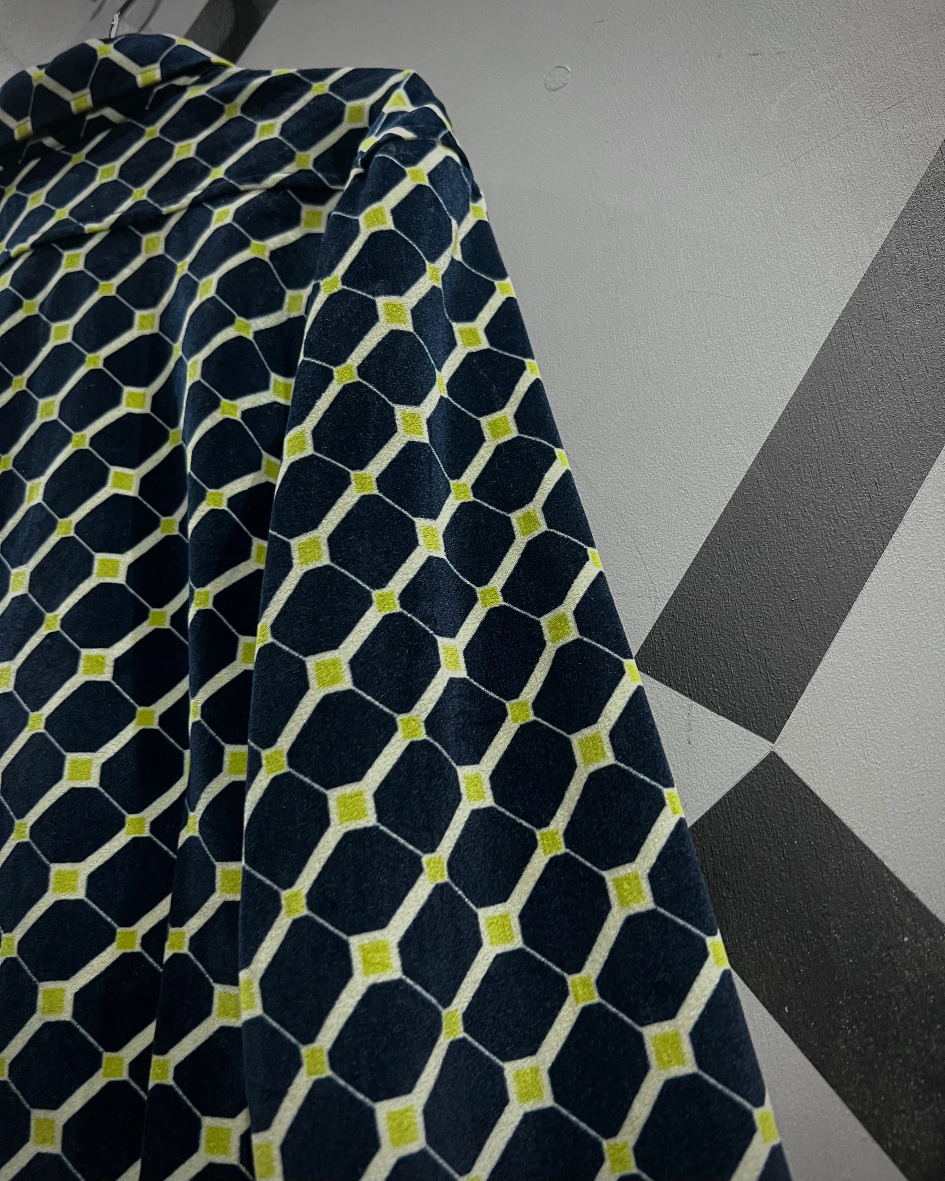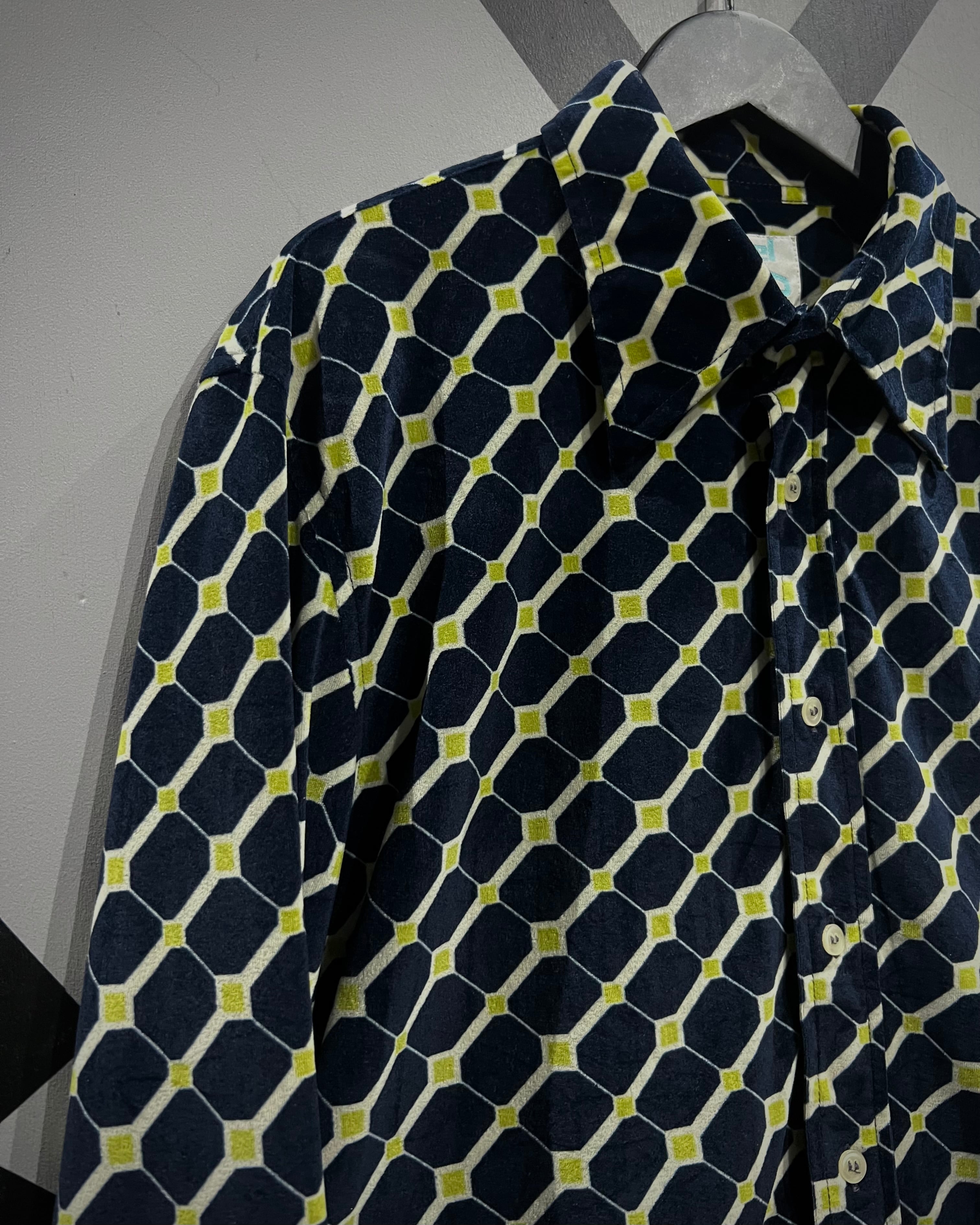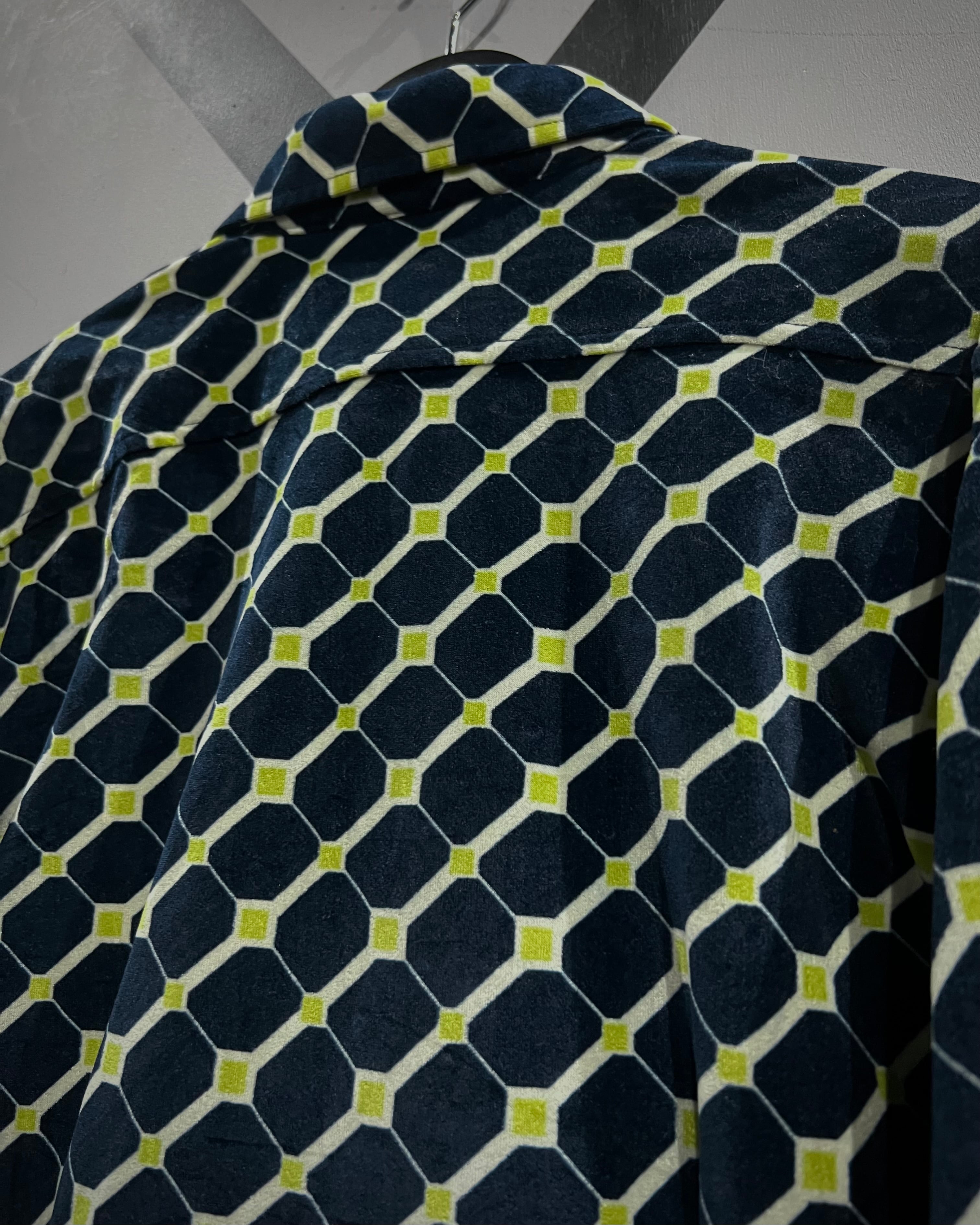 ベロア素材の滑らかな質感と、独自のジオメトリックパターンが目を引く長袖ベロアシャツ。