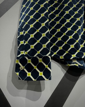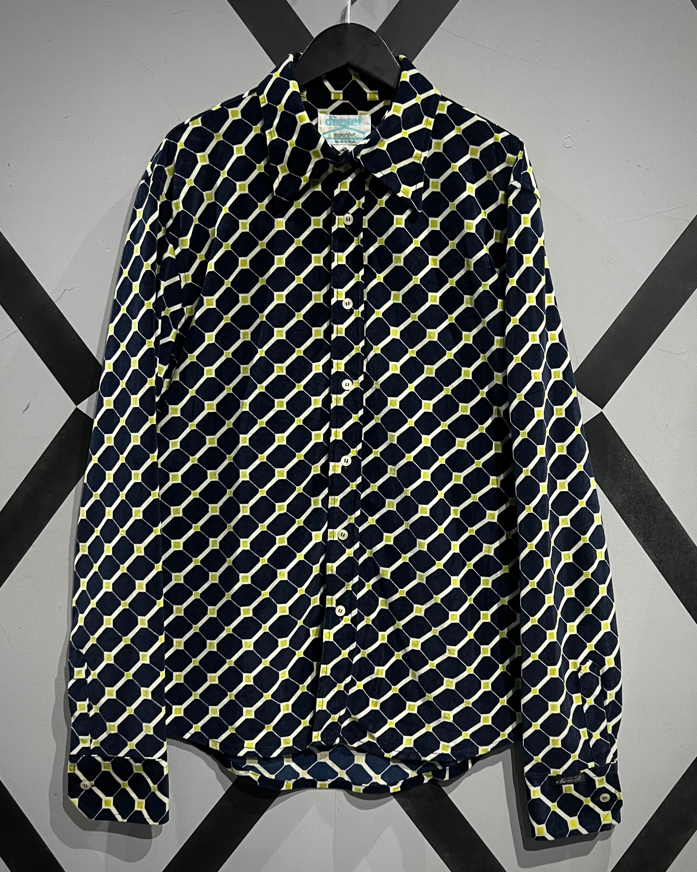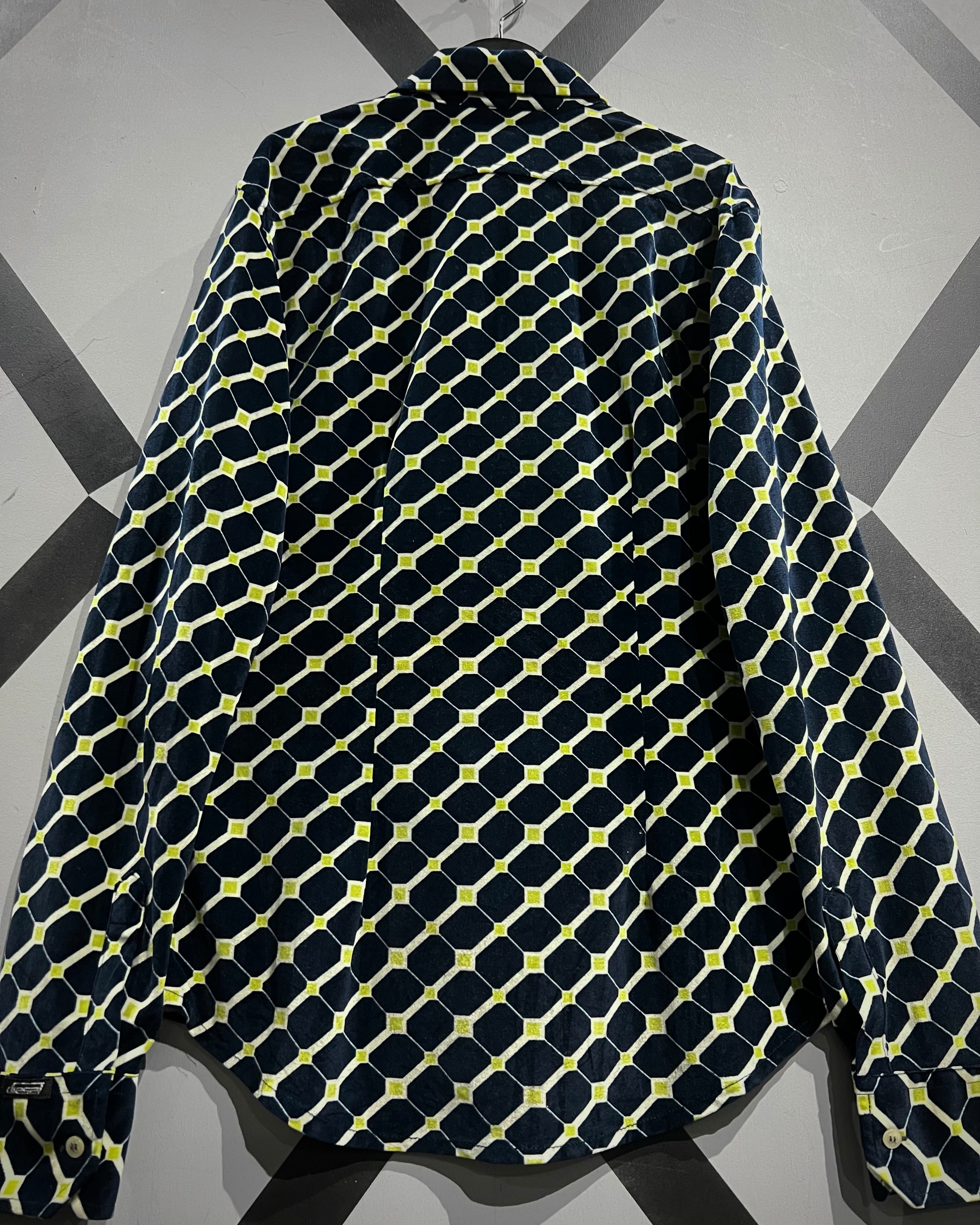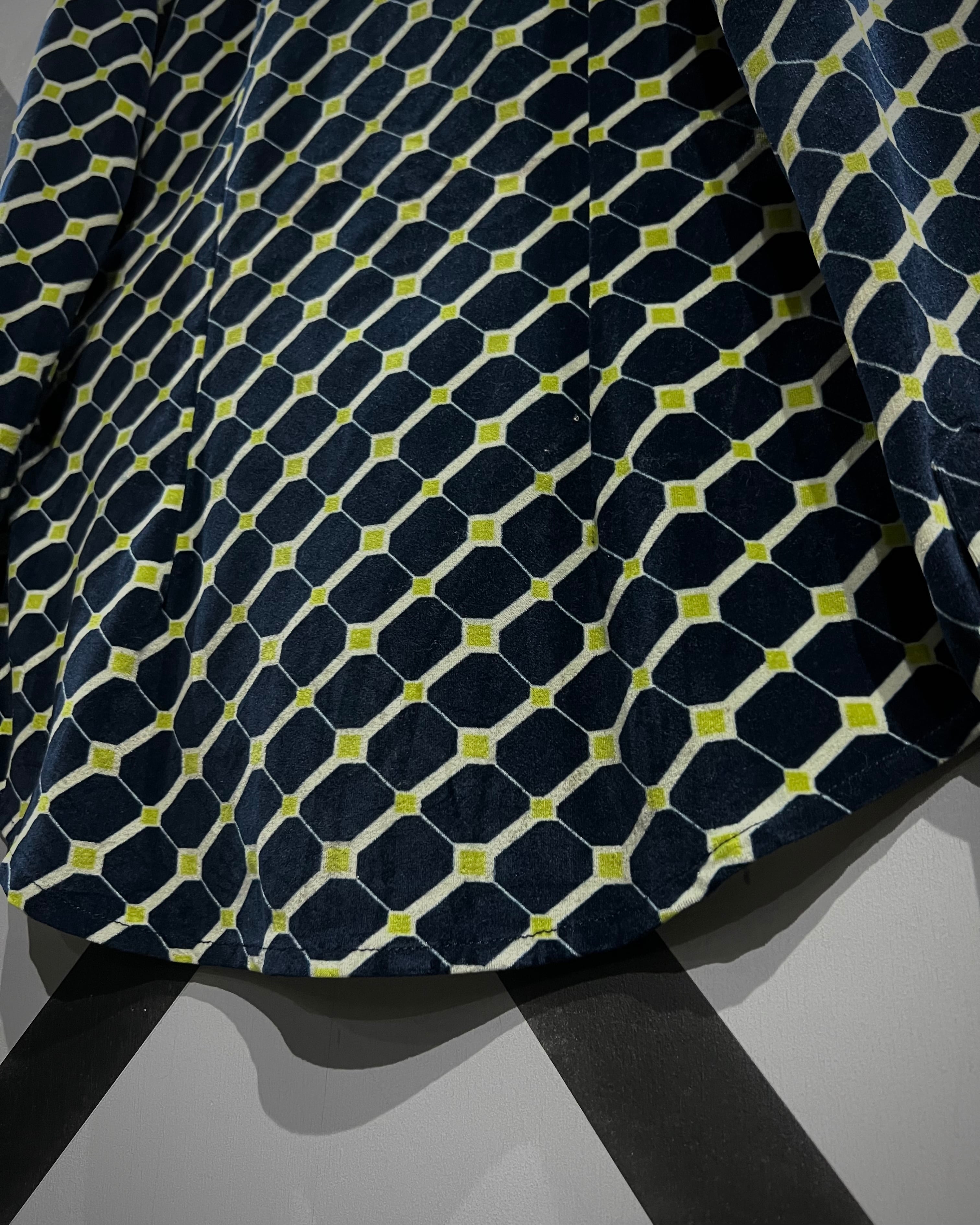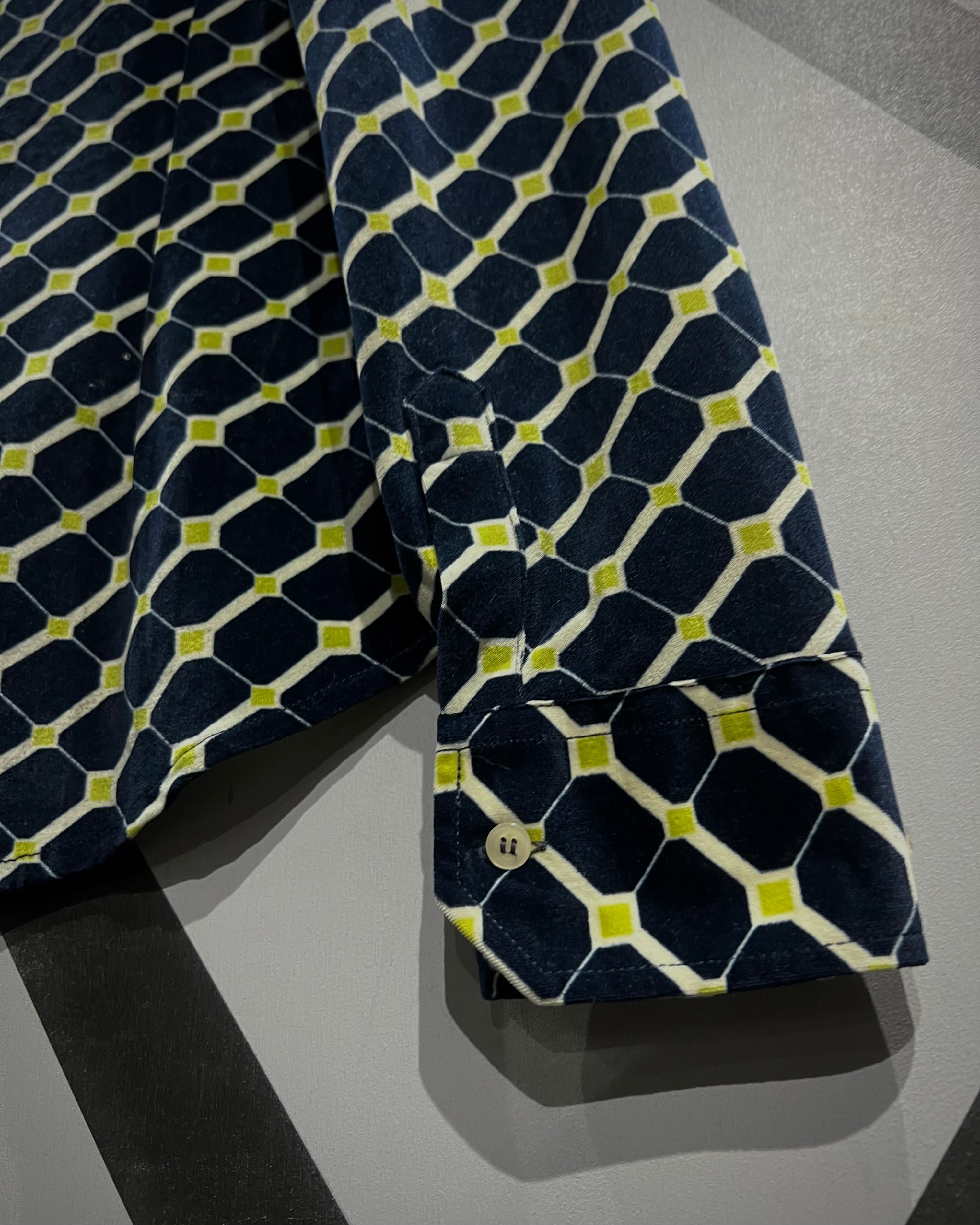 ベロア素材の滑らかな質感と、独自のジオメトリックパターンが目を引く長袖ベロアシャツ。