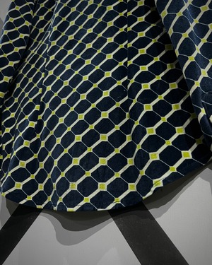 ボディはネイビーを基調に、ホワイトとイエローで構成されたリズミカルな幾何学模様。柔らかく起毛したベロア生地が光を受けることで、角度によって艶と陰影を生み出し、シンプルなスタイリングでも存在感を放ちます。