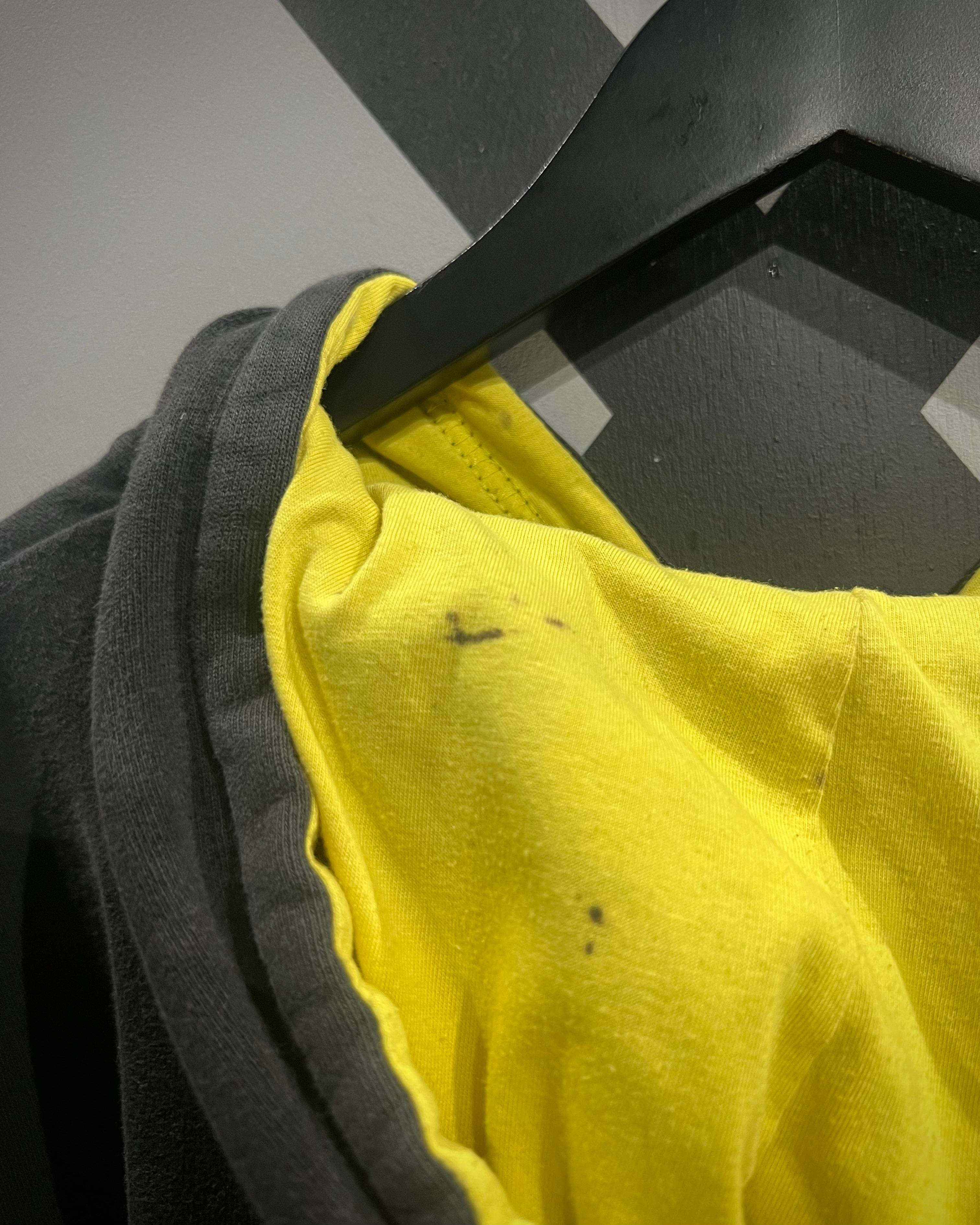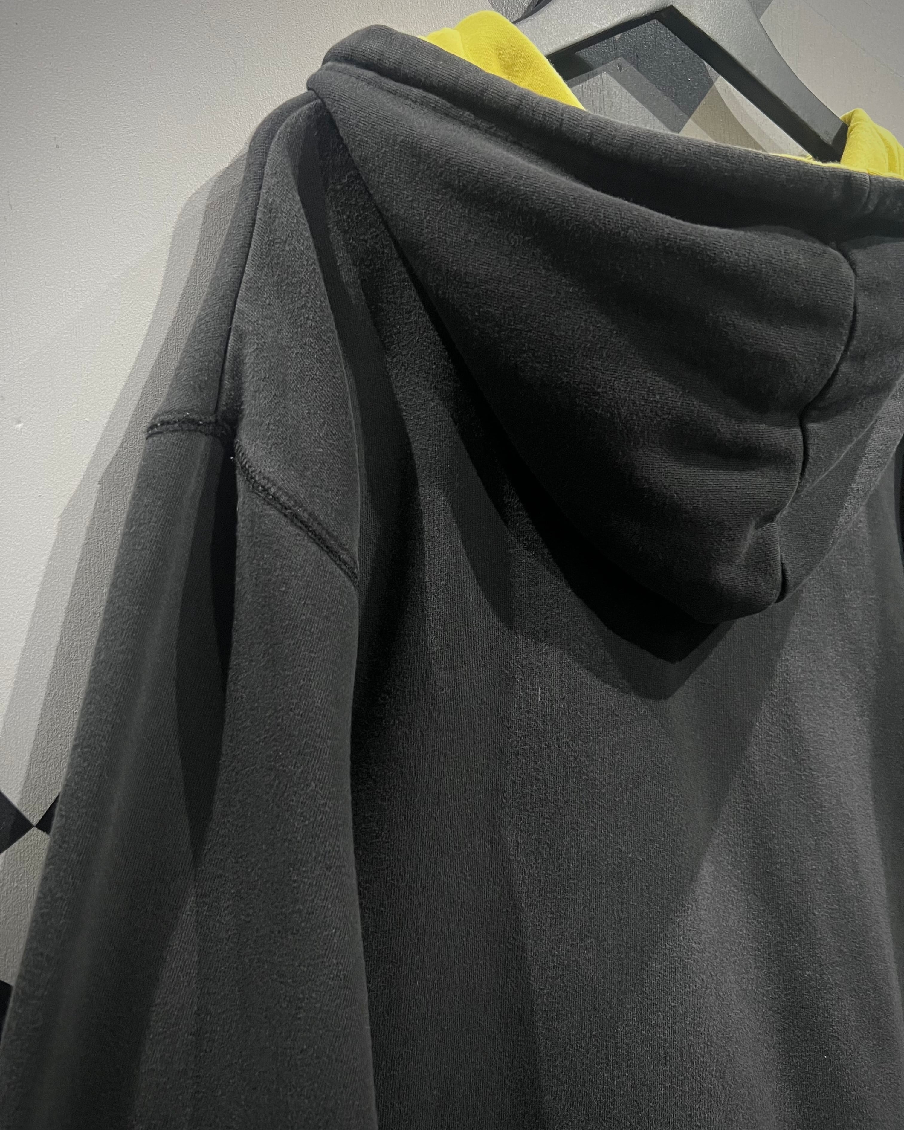 イエローのジップラインとドローコードが映える2トーン仕様のフードは、裏地までしっかり配色され、ストリートのエナジーを感じさせる仕上がり。袖にもブランドロゴのプリントを配置し、全方位からの存在感を確立しています。