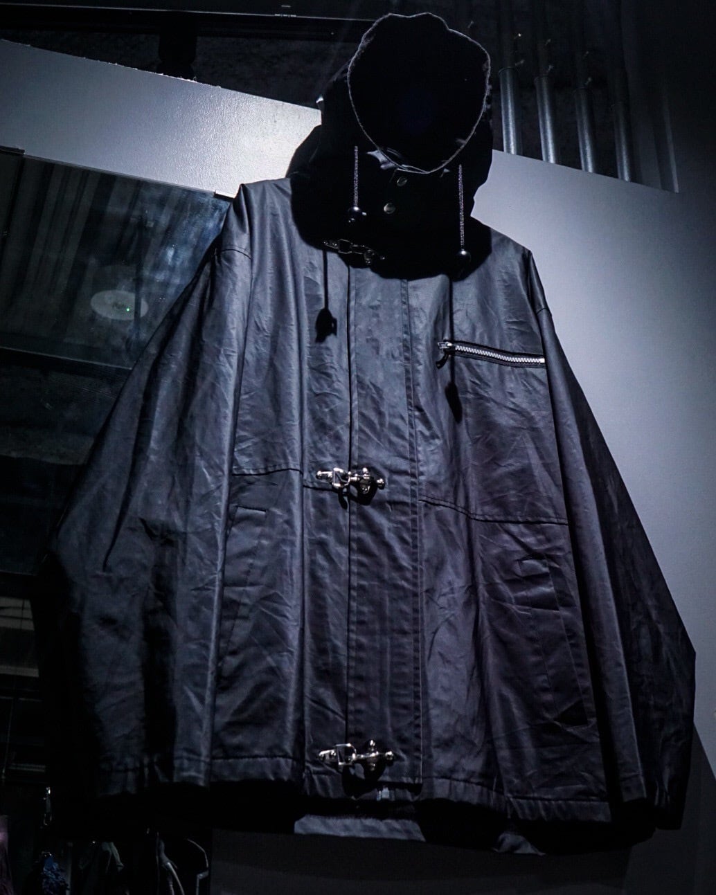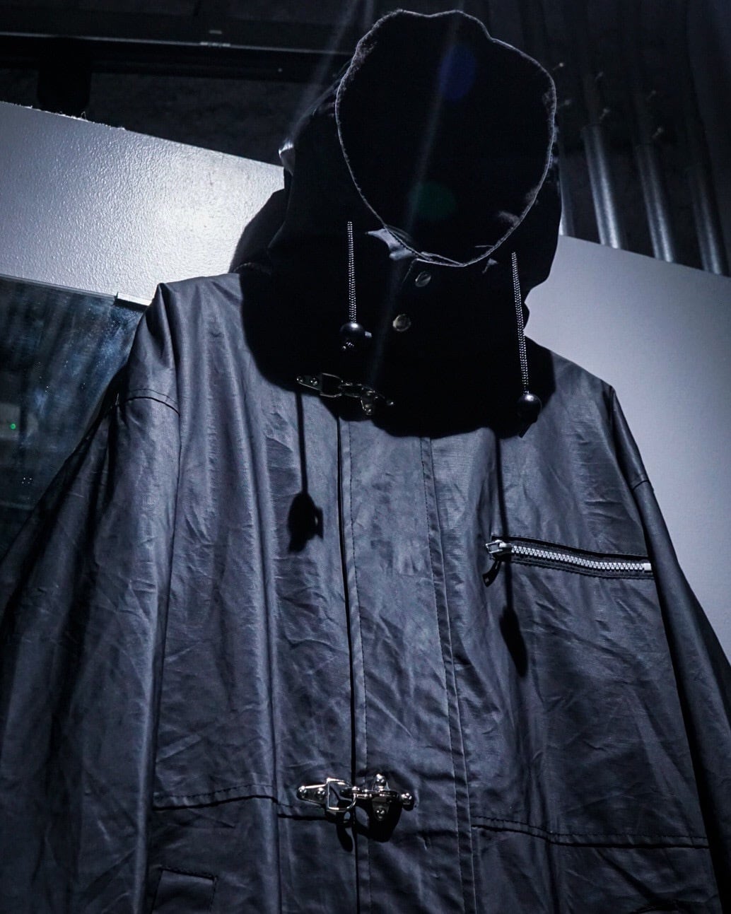 ややマットな質感を持つブラックのボディは、PVC特有のハリと艶を活かした仕上がり。ボリュームあるシルエットながら、軽量で風を通さない構造が特徴的。胸元のメタルジップポケットや両サイドのスラッシュポケットなど、デザインと機能が緻密に融合しています。