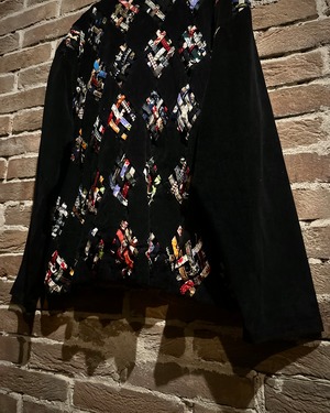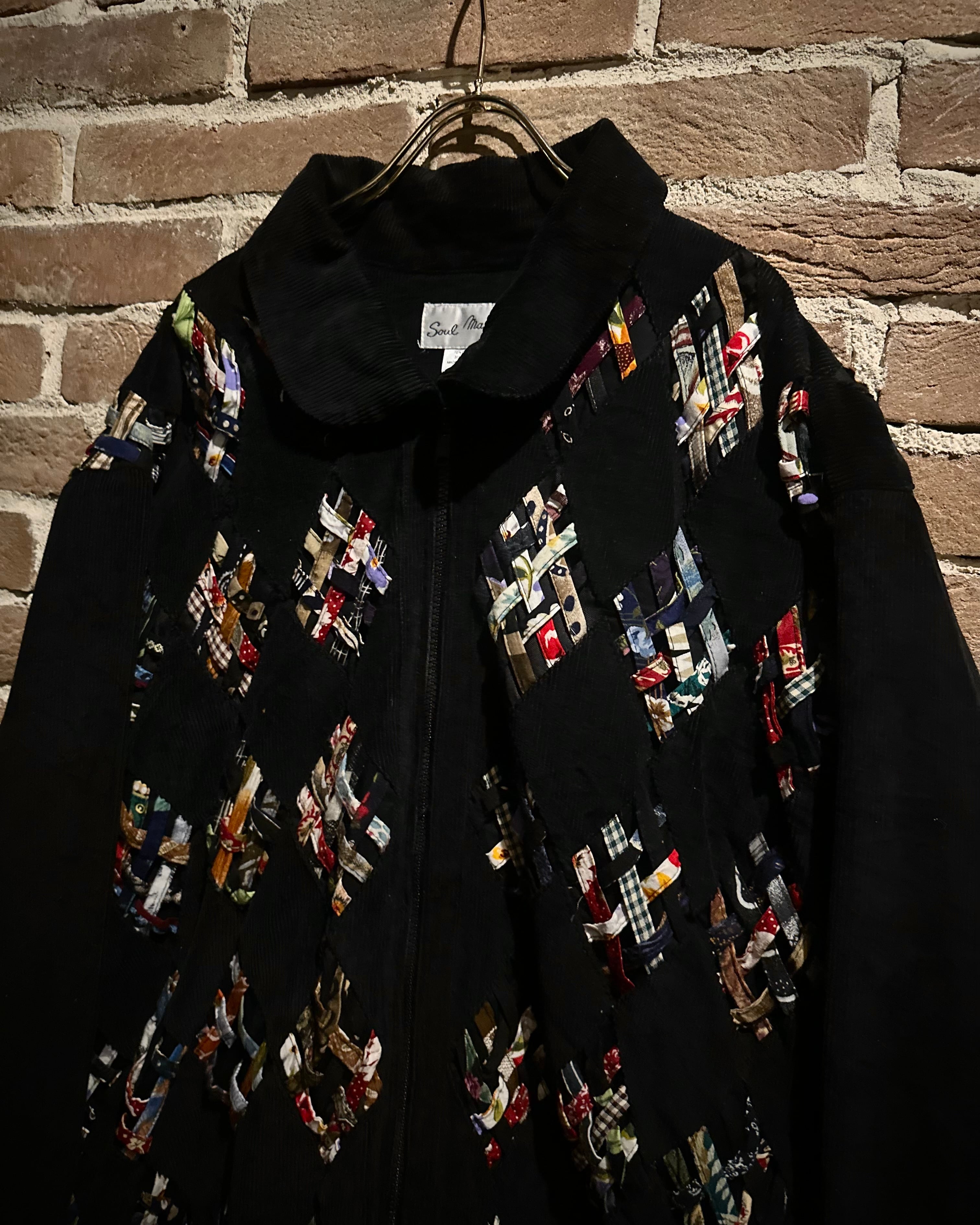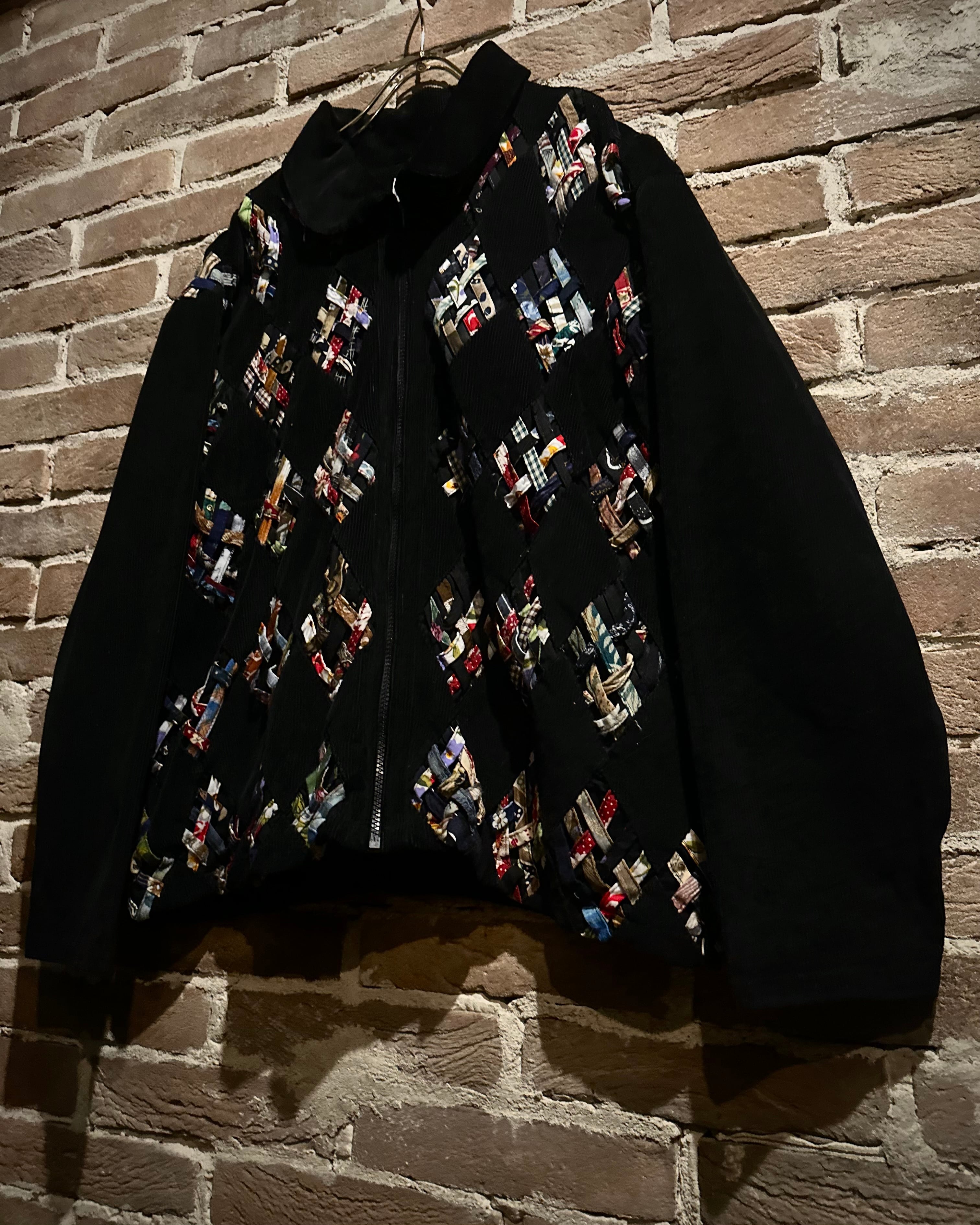 編み部分にはチェック、フラワー、ドット、ペイズリーなど多様な柄がランダムに配置されており、全体のトーンをブラックで引き締めることでアート性と統一感を両立。ジップアップ仕様のフロントデザインにより、ブルゾン感覚での着用も可能です。