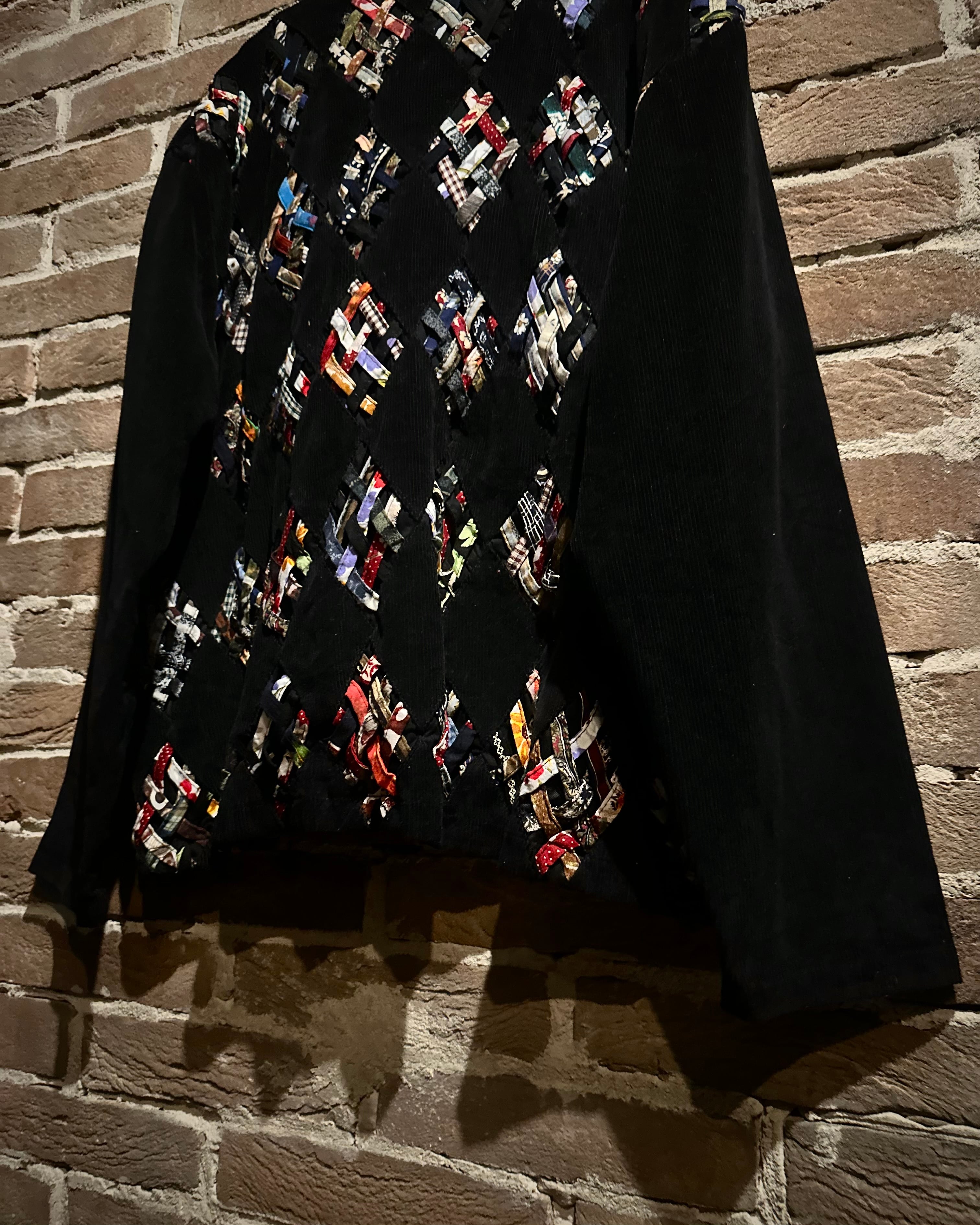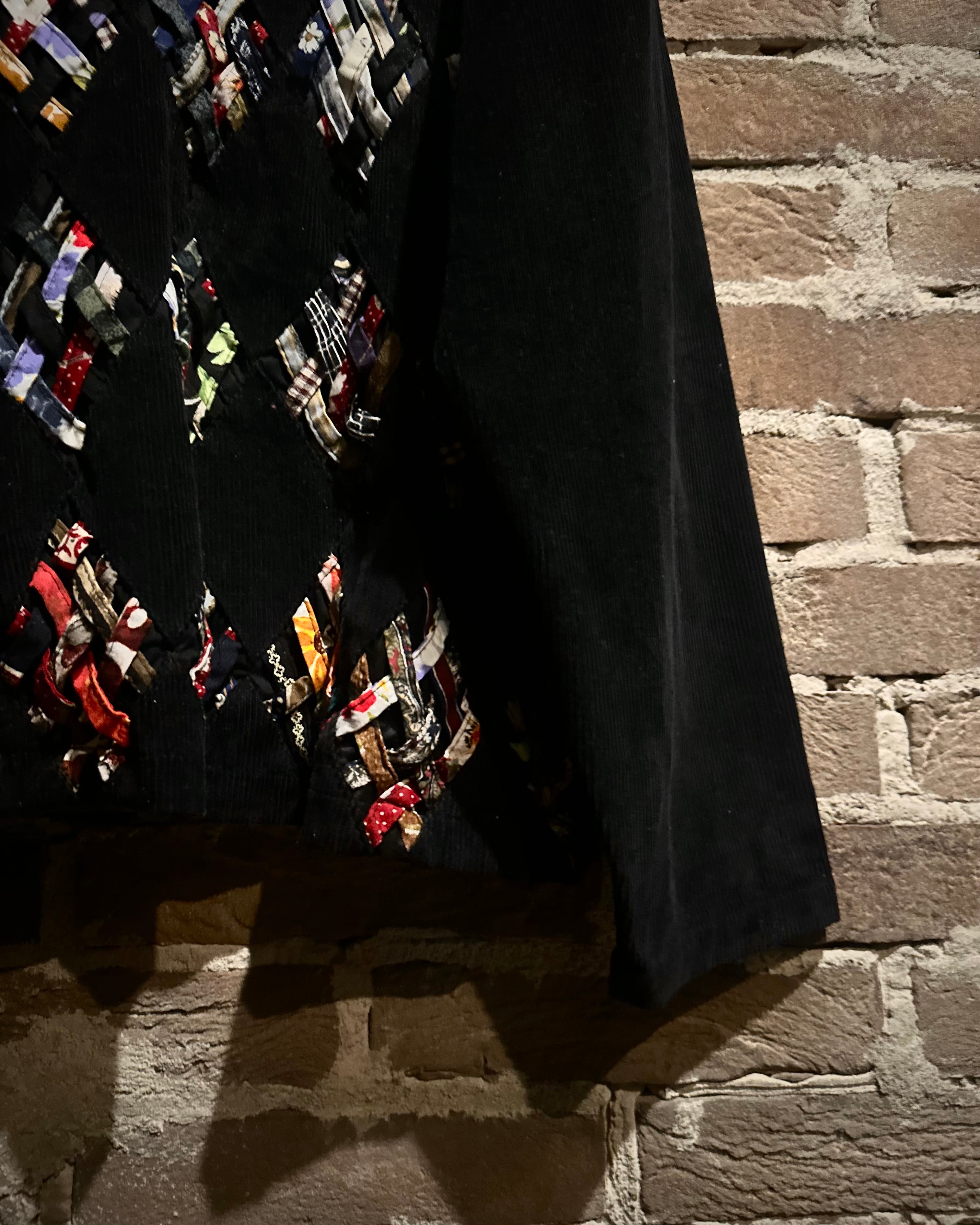 ベースには柔らかなブラックコーデュロイを使用し、その上に異なるファブリックをクロス状に編み込むことで、まるで一点ずつ手仕事で仕上げられたような独特の存在感を放ちます。