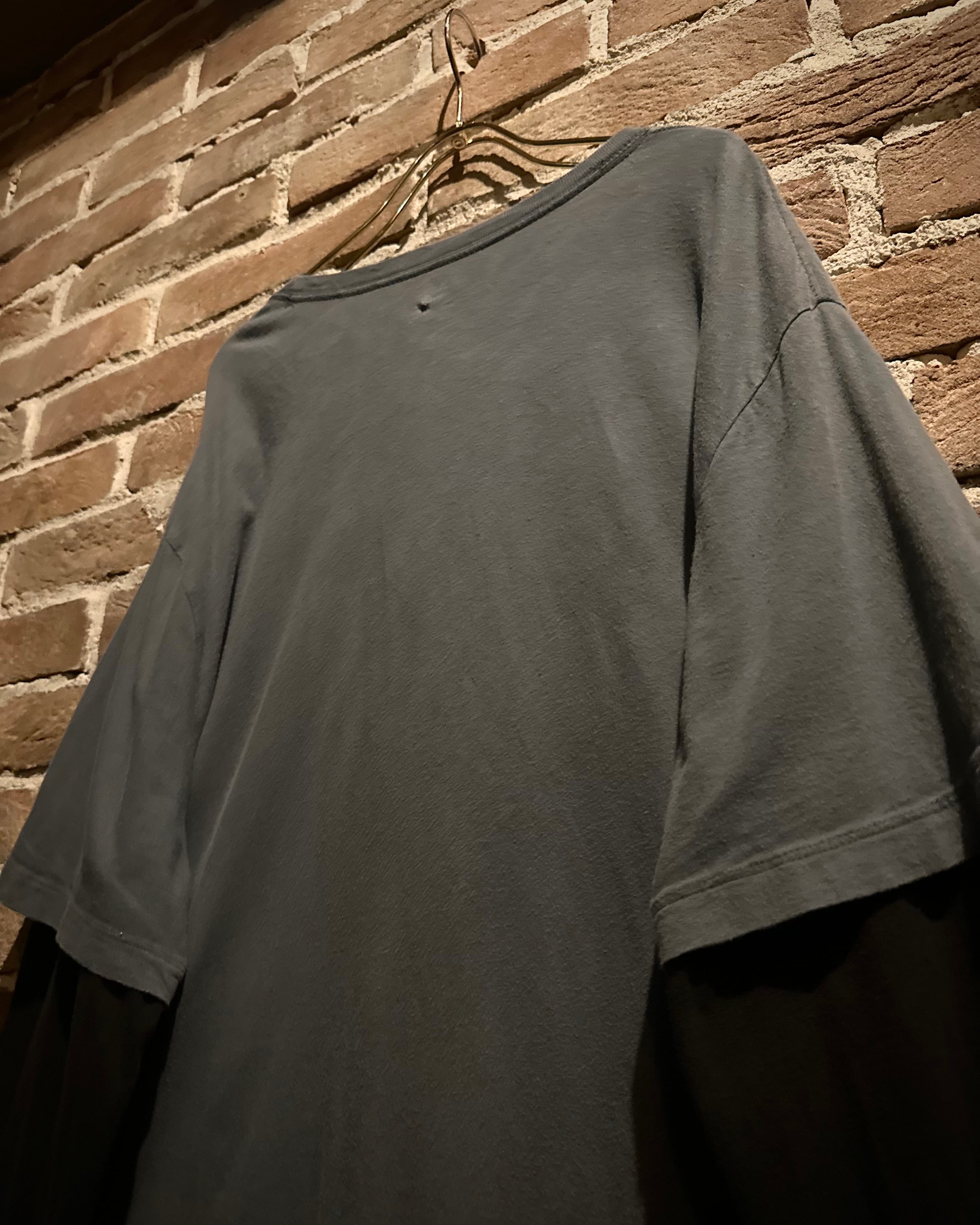 全体をくすんだチャコールトーンでまとめ、モードでありながらストリートにも落とし込めるバランス感。ルーズなシルエットと広めのネックラインが生む抜け感が、一枚着でも雰囲気を作れる存在感を発揮します。重ね着せずとも奥行きのあるスタイルを演出でき、シーズンを問わず活躍する万能なデザインです。