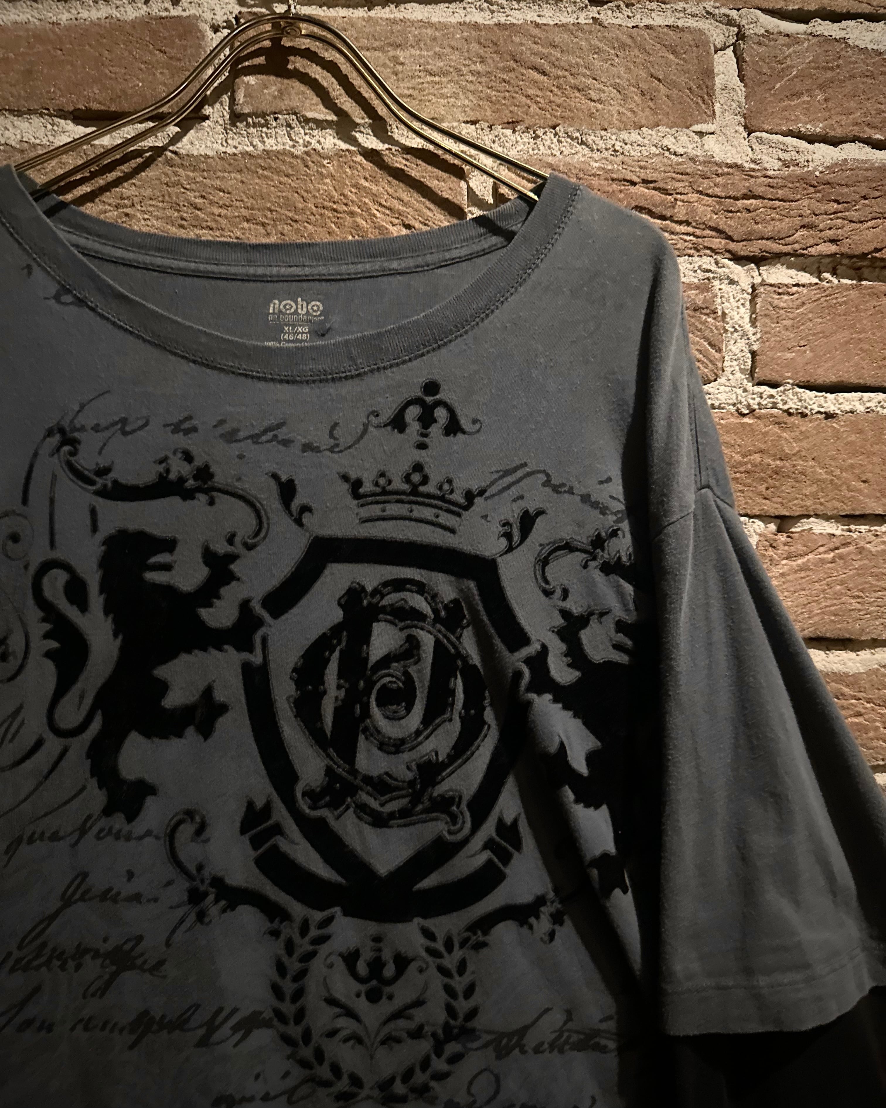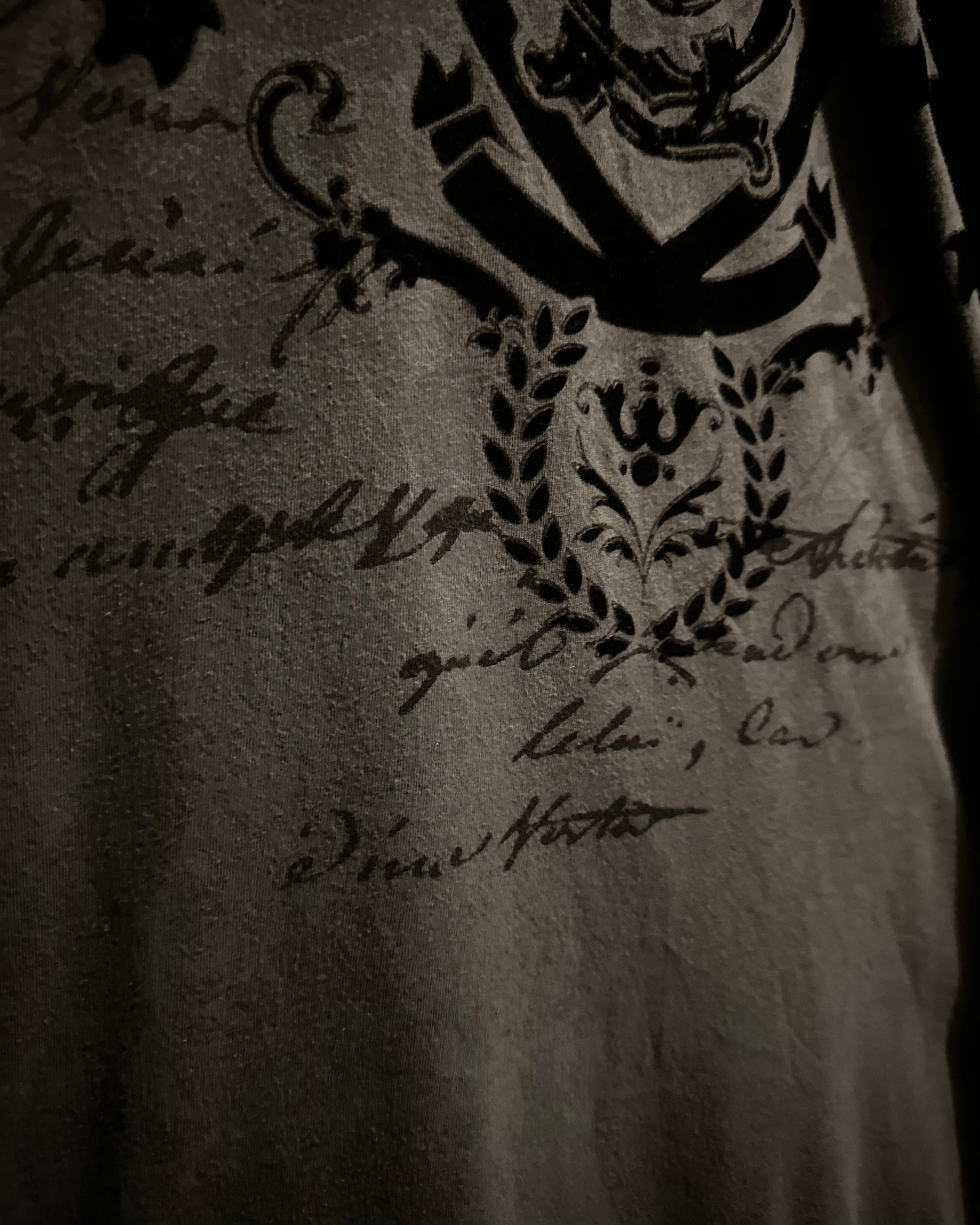 フロントにはクラウンと盾、獅子をモチーフにしたゴシック調のグラフィックを配置。フロッキープリント特有の立体的でベルベットのような質感がプリントデザインに深みを与え、光の当たり方で陰影が変わる表情豊かな仕上がりとなっています。