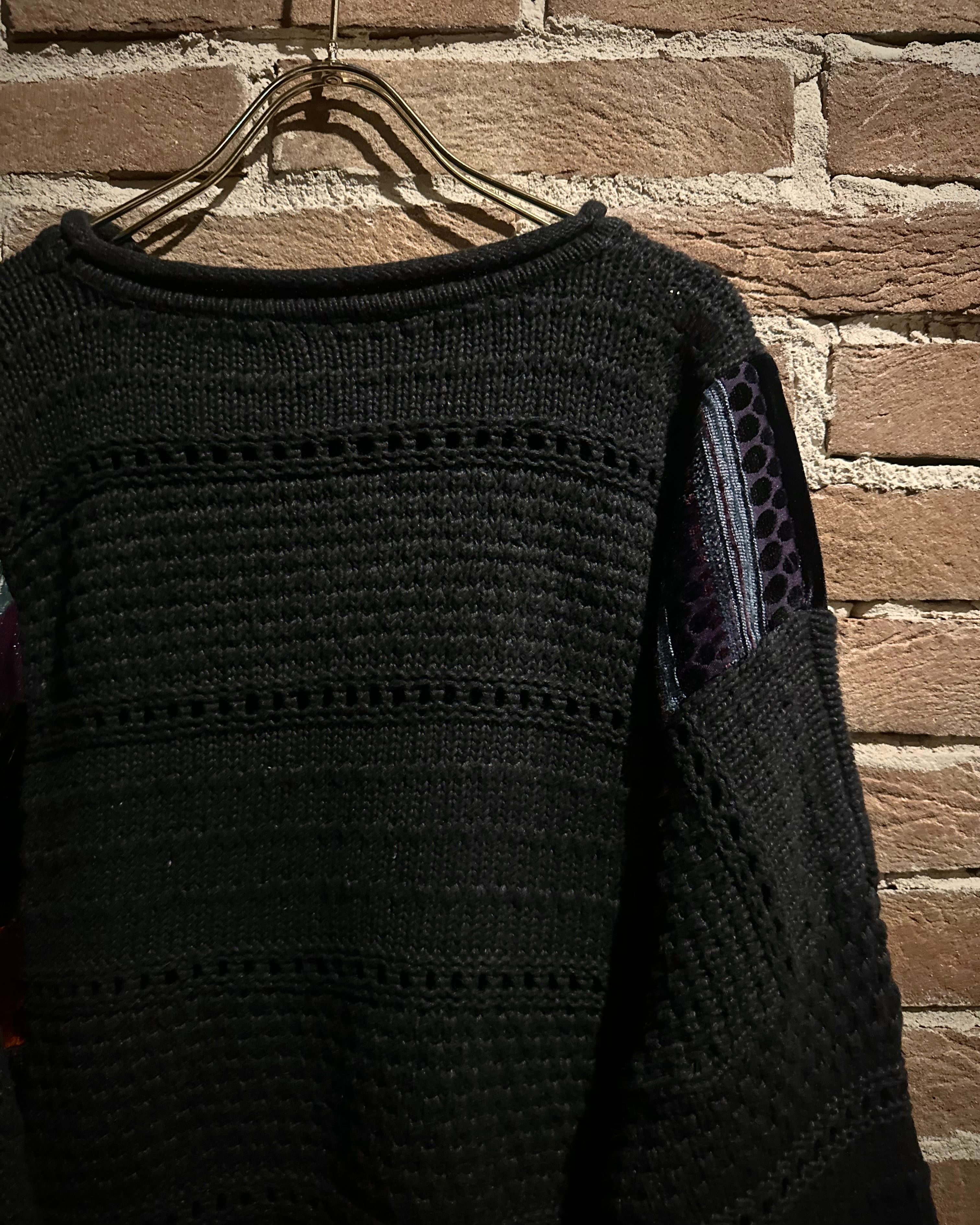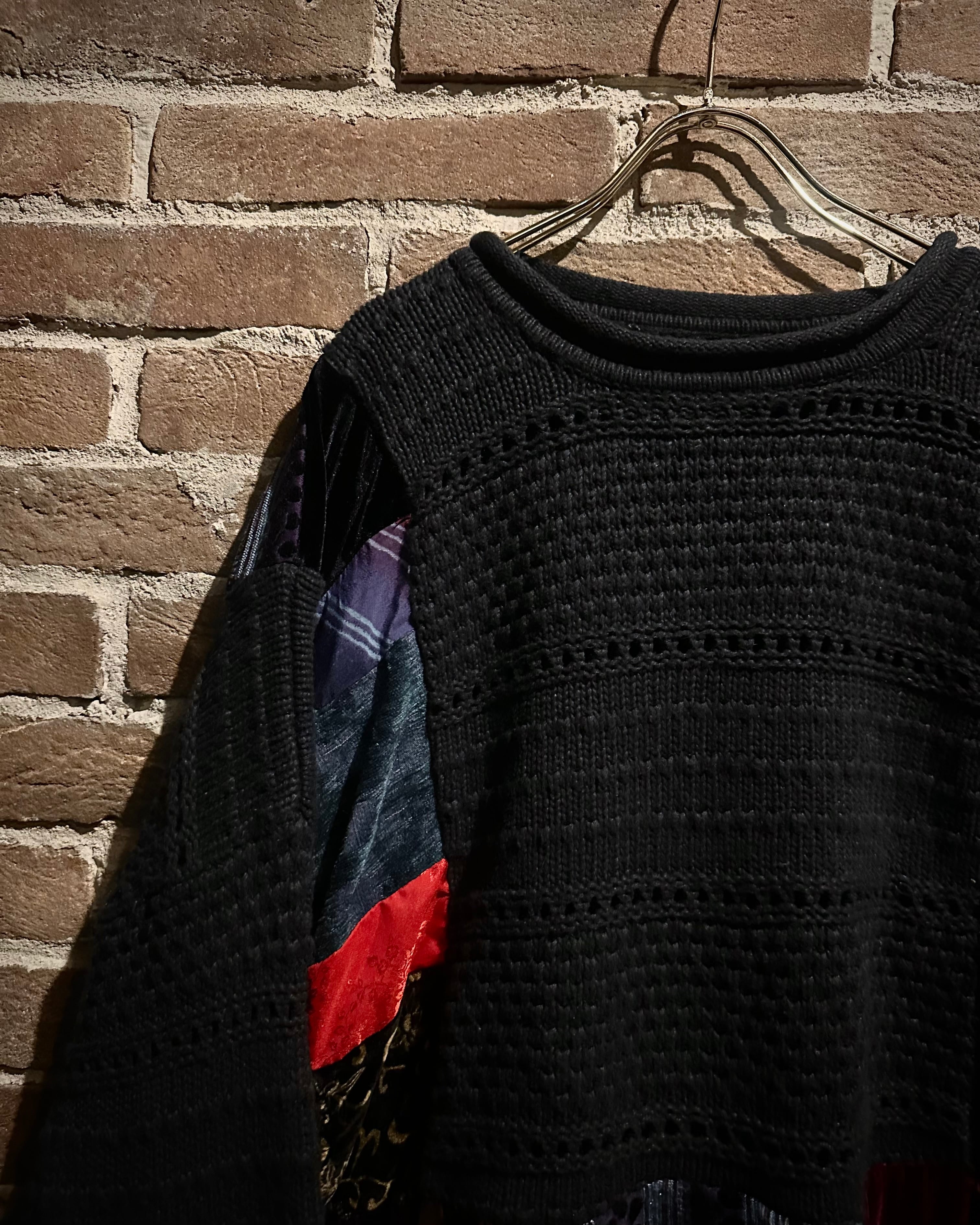 ブラックのニットボディをベースに、ベロアなど質感の異なる生地を大胆に繋ぎ合わせた、リメイクのニット。