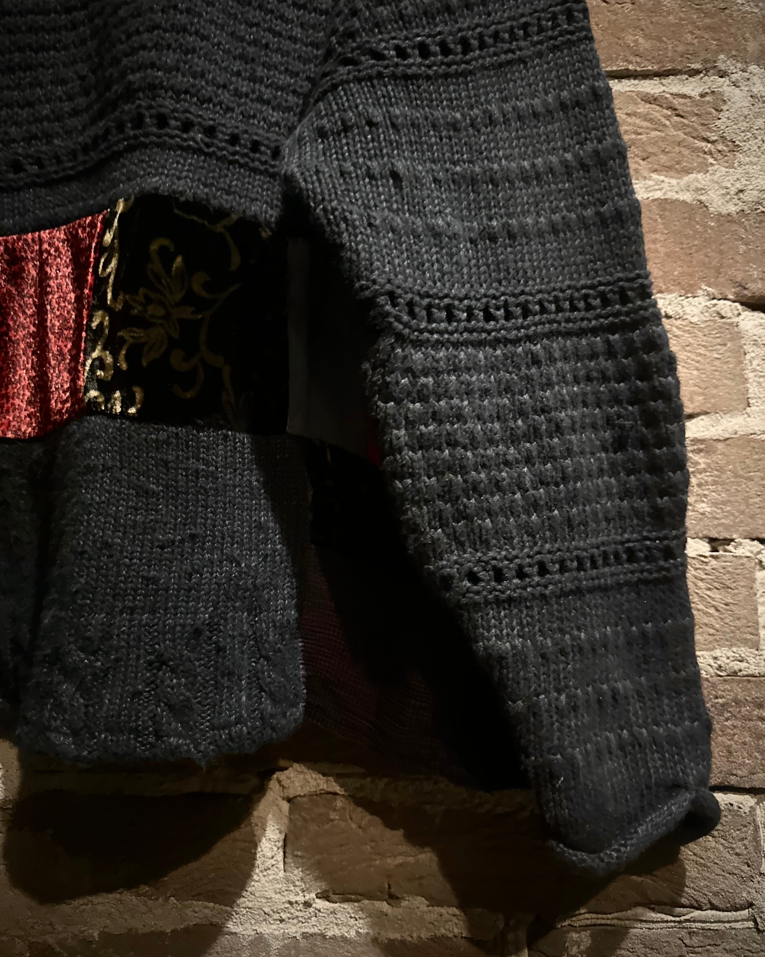 ヴィンテージニットをベースに、異素材のパッチワークで再構築された一点モノのリメイクの稀有な1着です。