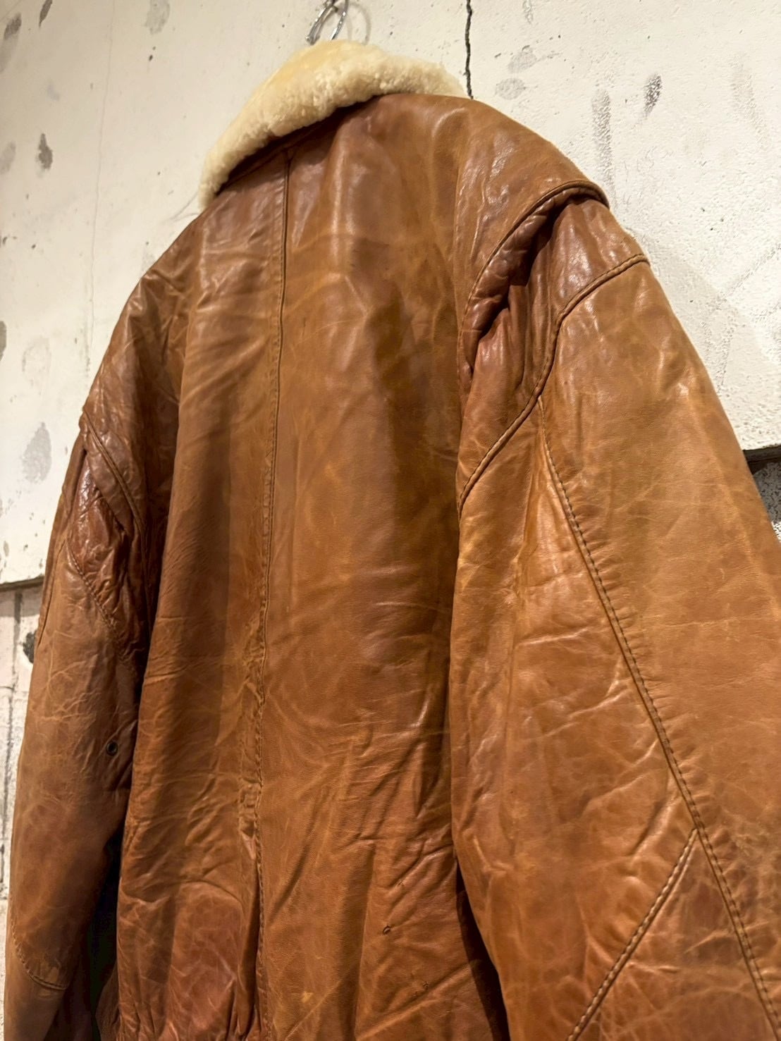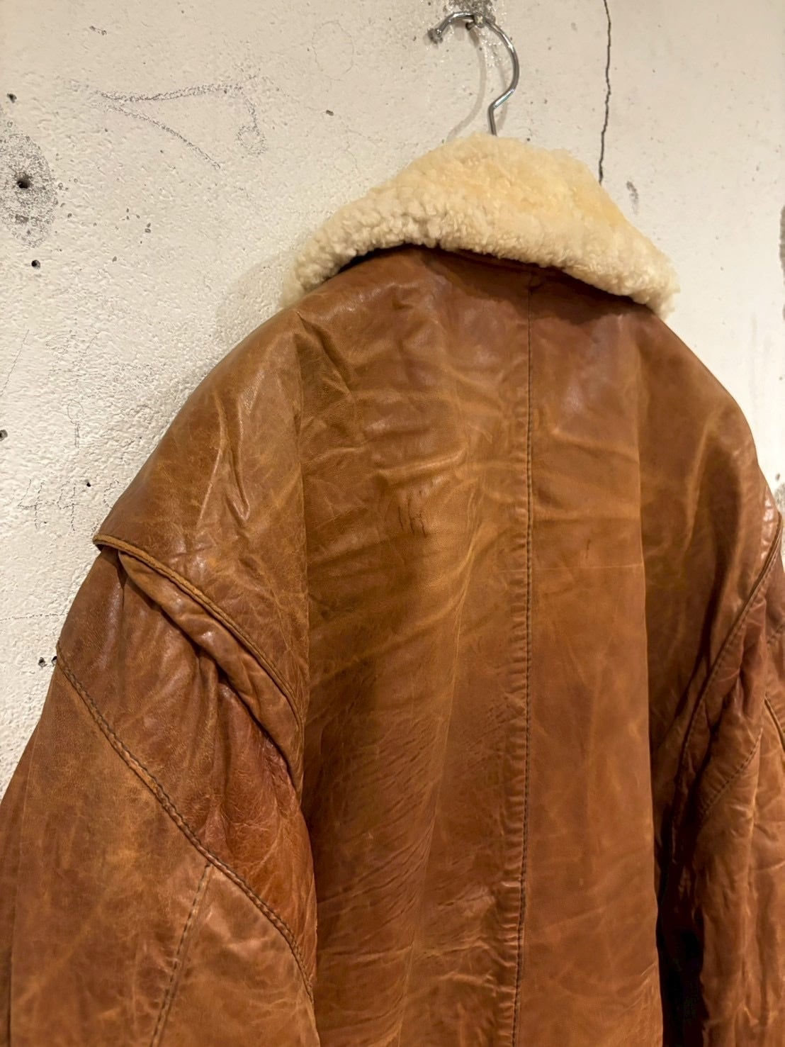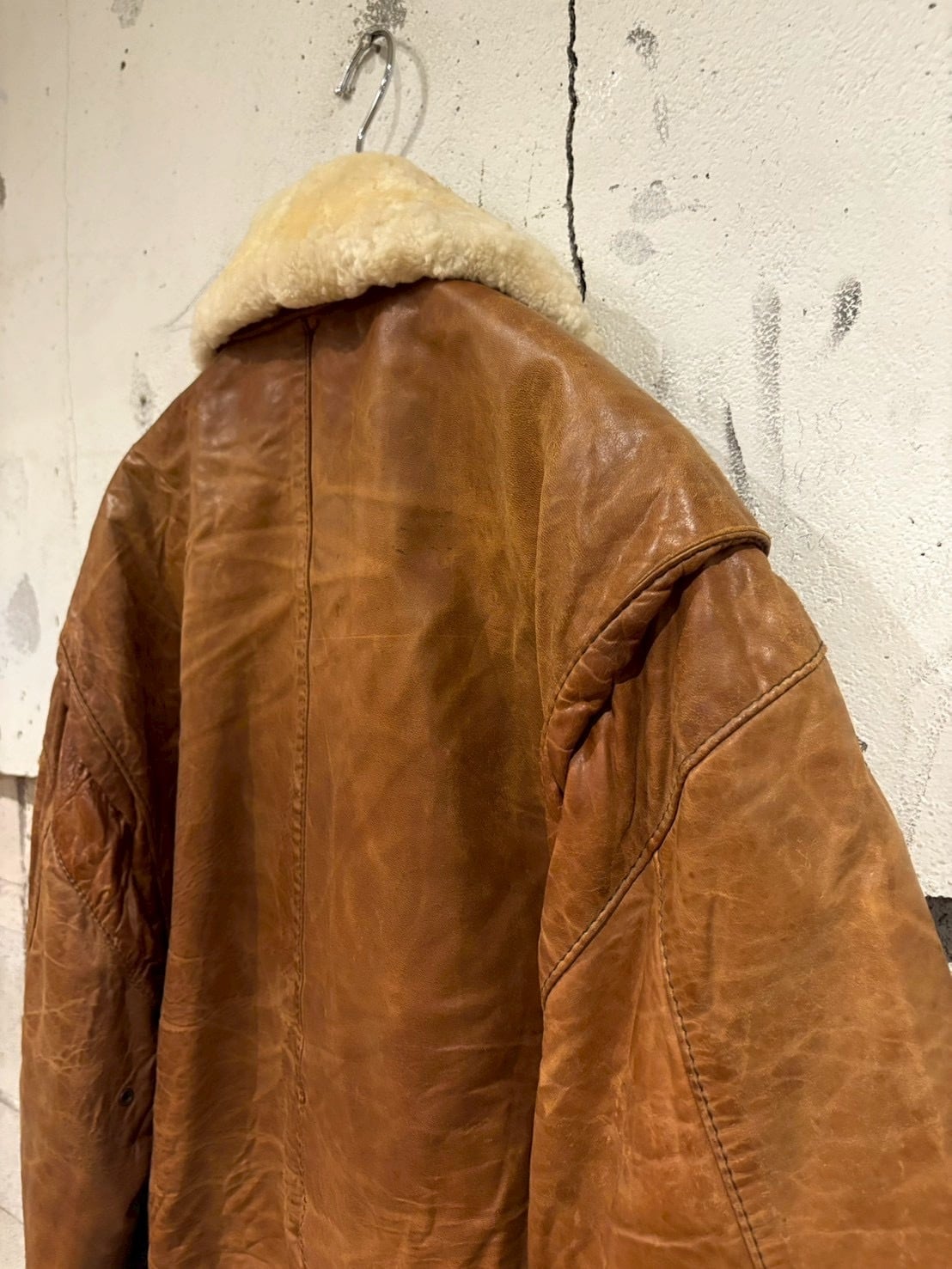 柔らかくも厚みのある上質なレザーを採用し、長年の経年変化による深いシワや艶が圧倒的な存在感を放ちます。襟にはふっくらとしたムートンファーを搭載し、ボタンで着脱可能な仕様。季節やスタイリングに合わせて表情を変えられるのも魅力的なポイントです。