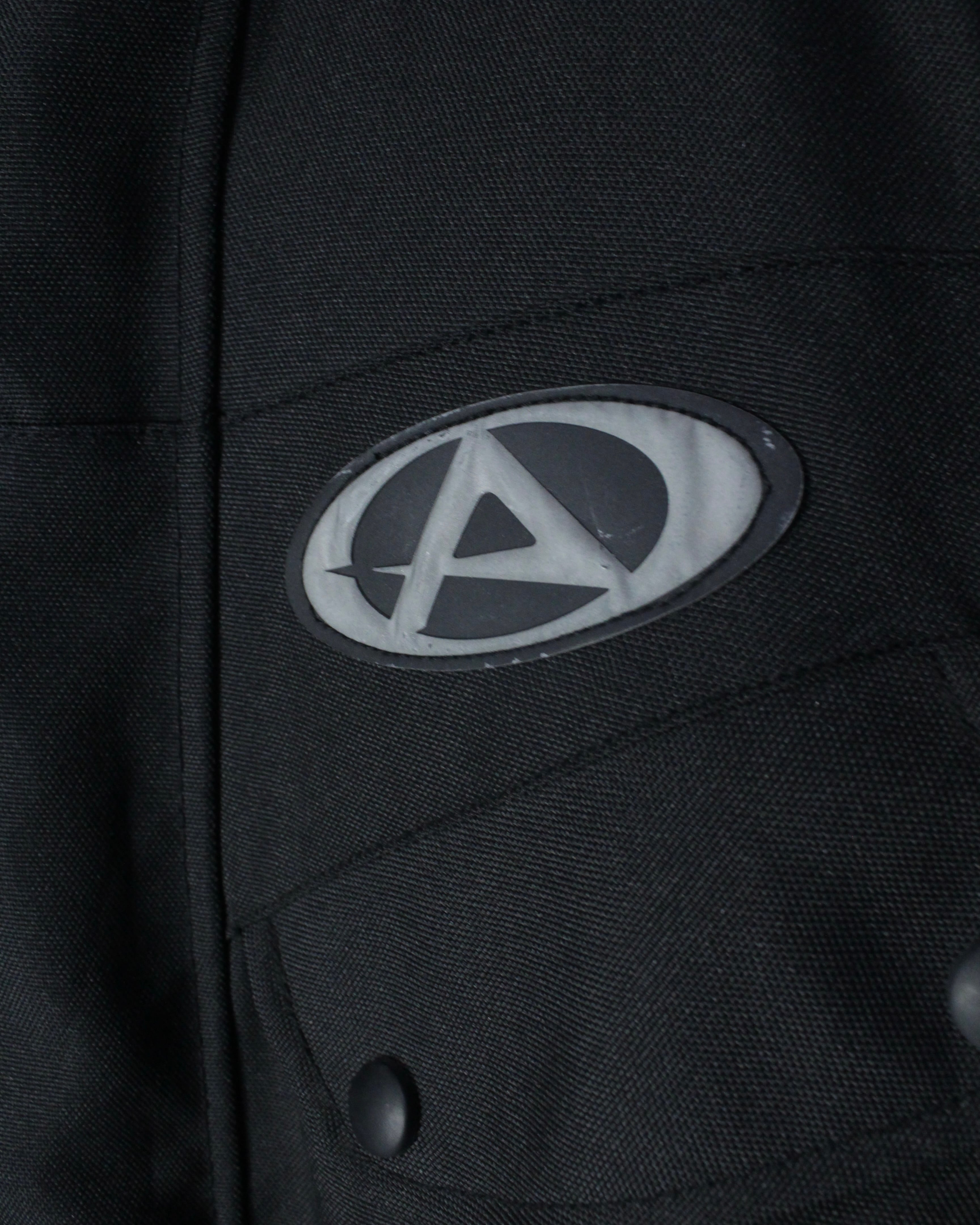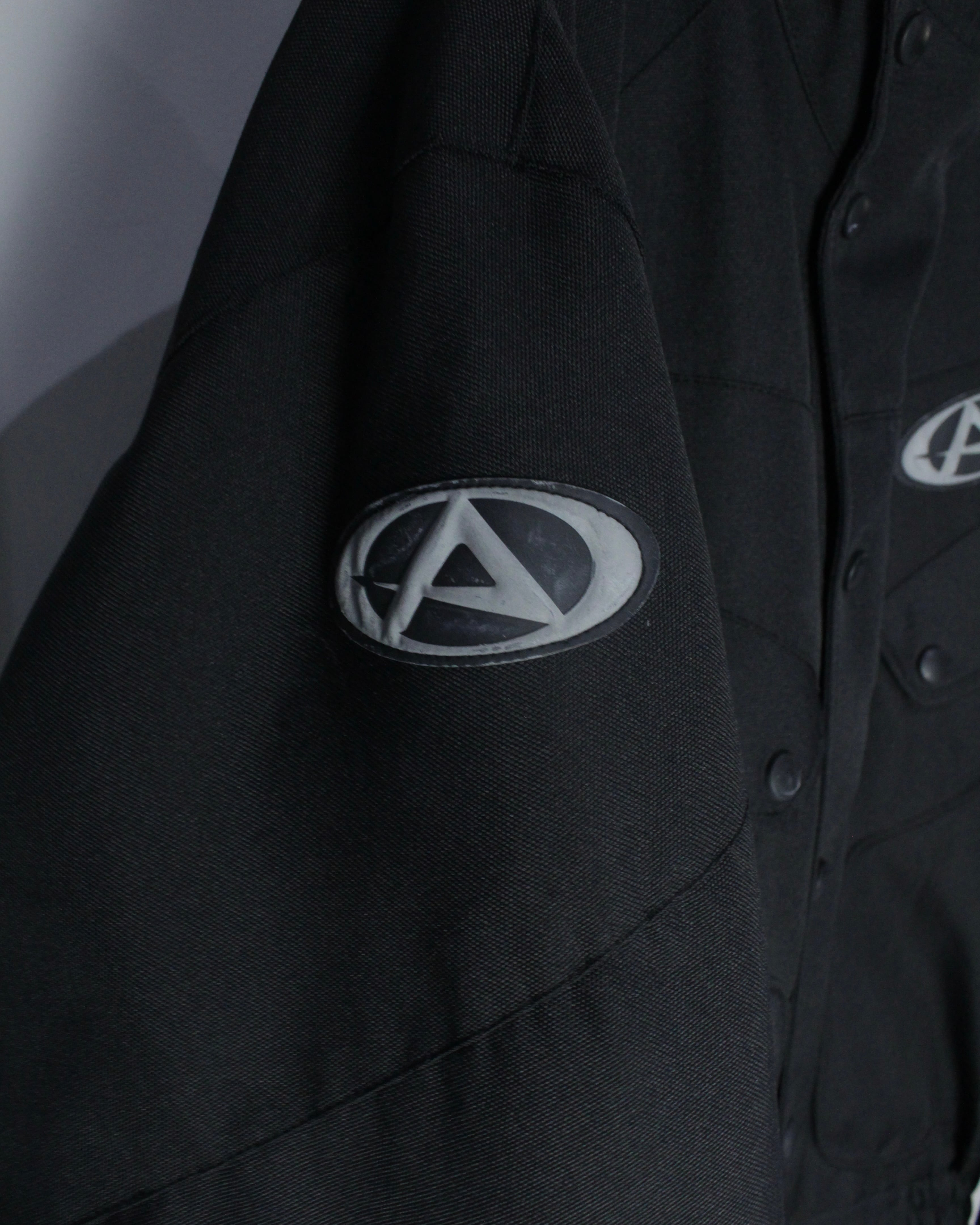 ショート丈ながらウエストにしっかりとしたテンションを持たせ、バイカーウェア特有のボリューム感を強調。袖先やスタンドカラーのディテールも相まって、プロテクションウェアの重厚さとファッション性を見事に両立させています。