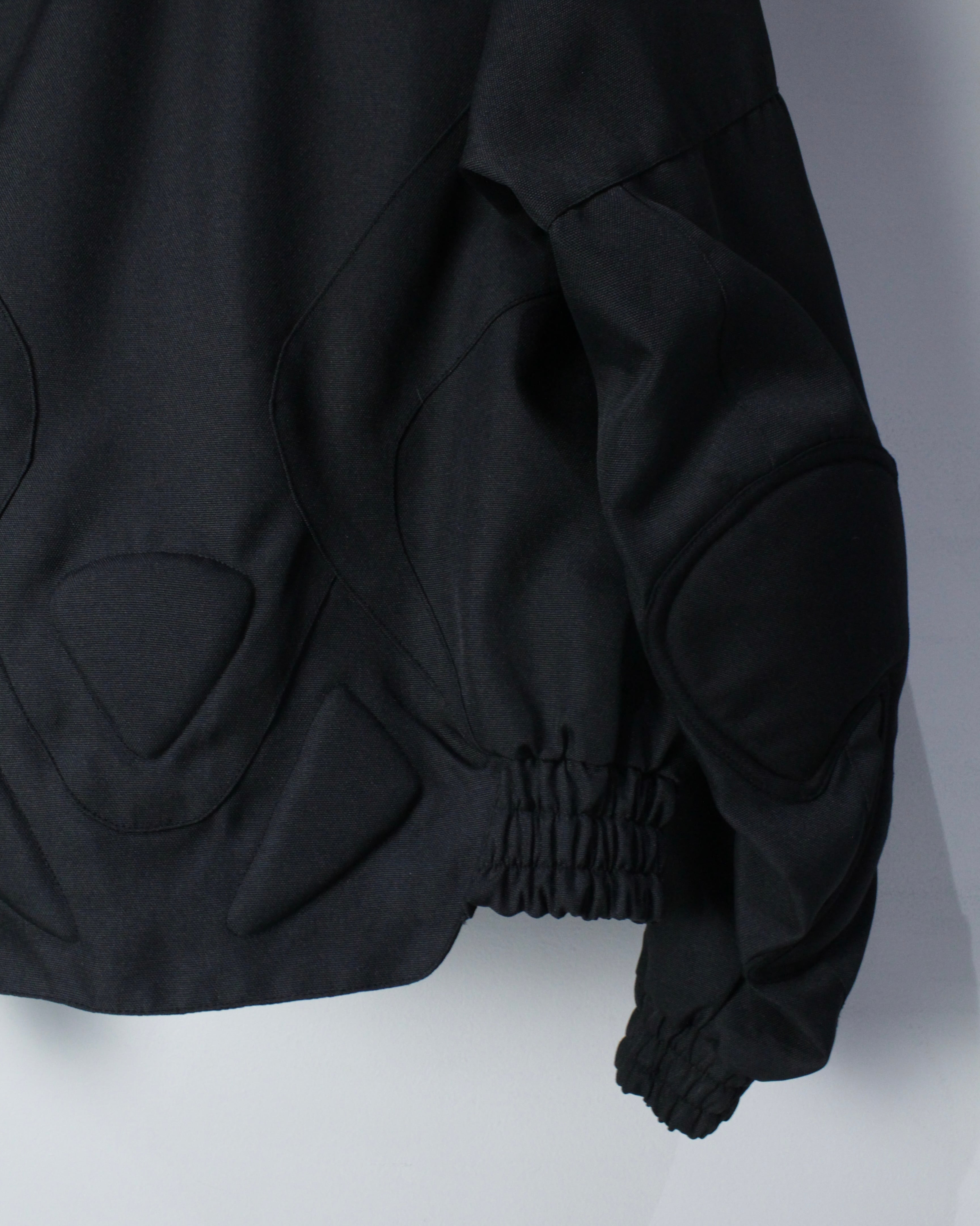 フロントのフラップポケットやファスナーポケット、エルボーやバックの立体的なステッチワークが、近未来的なフォームを描きながら構築的なシルエットを形成。
