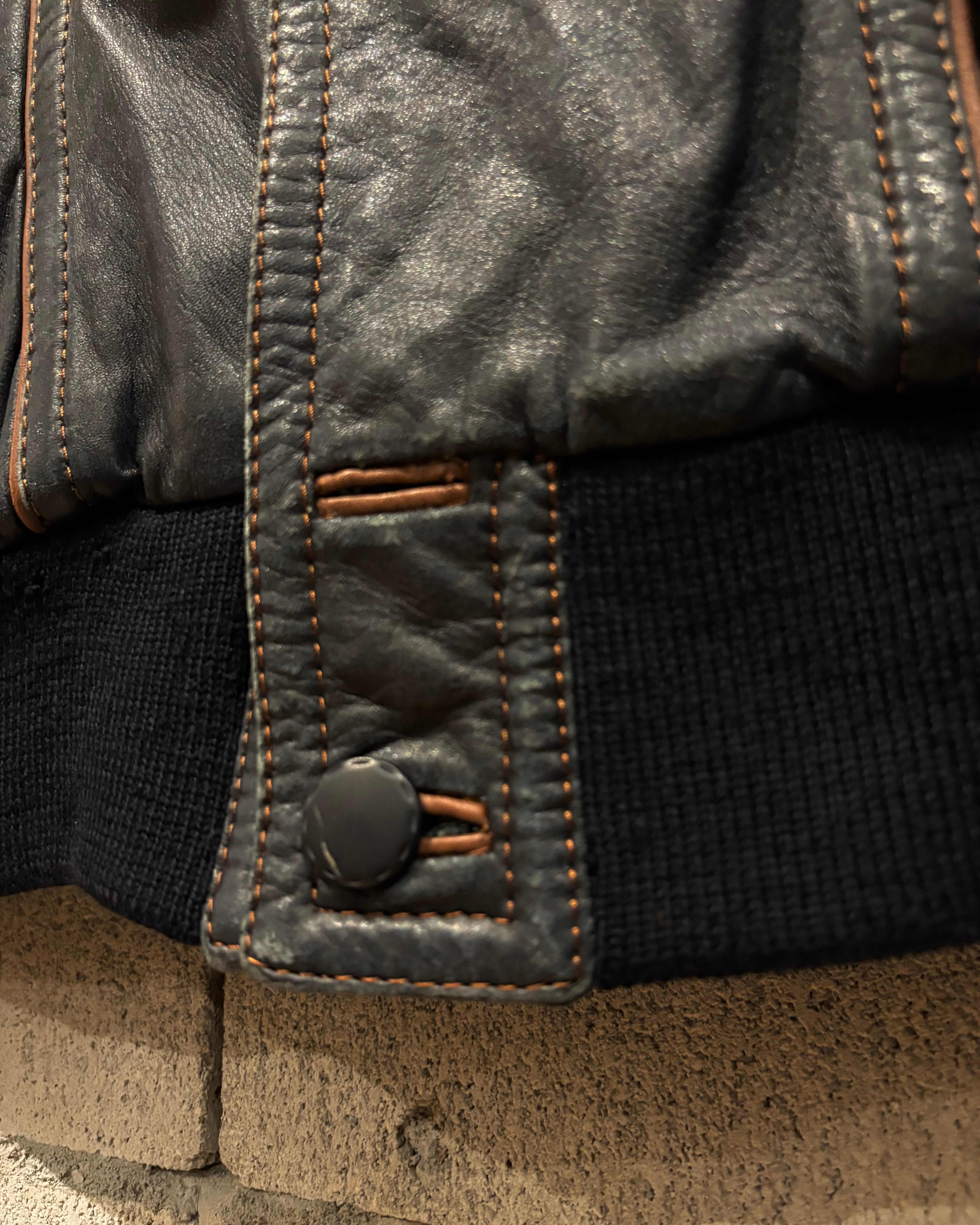 素材には極上のイタリアンレザーを使用。滑らか、柔らかな質感と、深みのあるダークネイビーのボディに走るキャメルのパイピングと、無骨さがありながらも気品を漂わせます。
