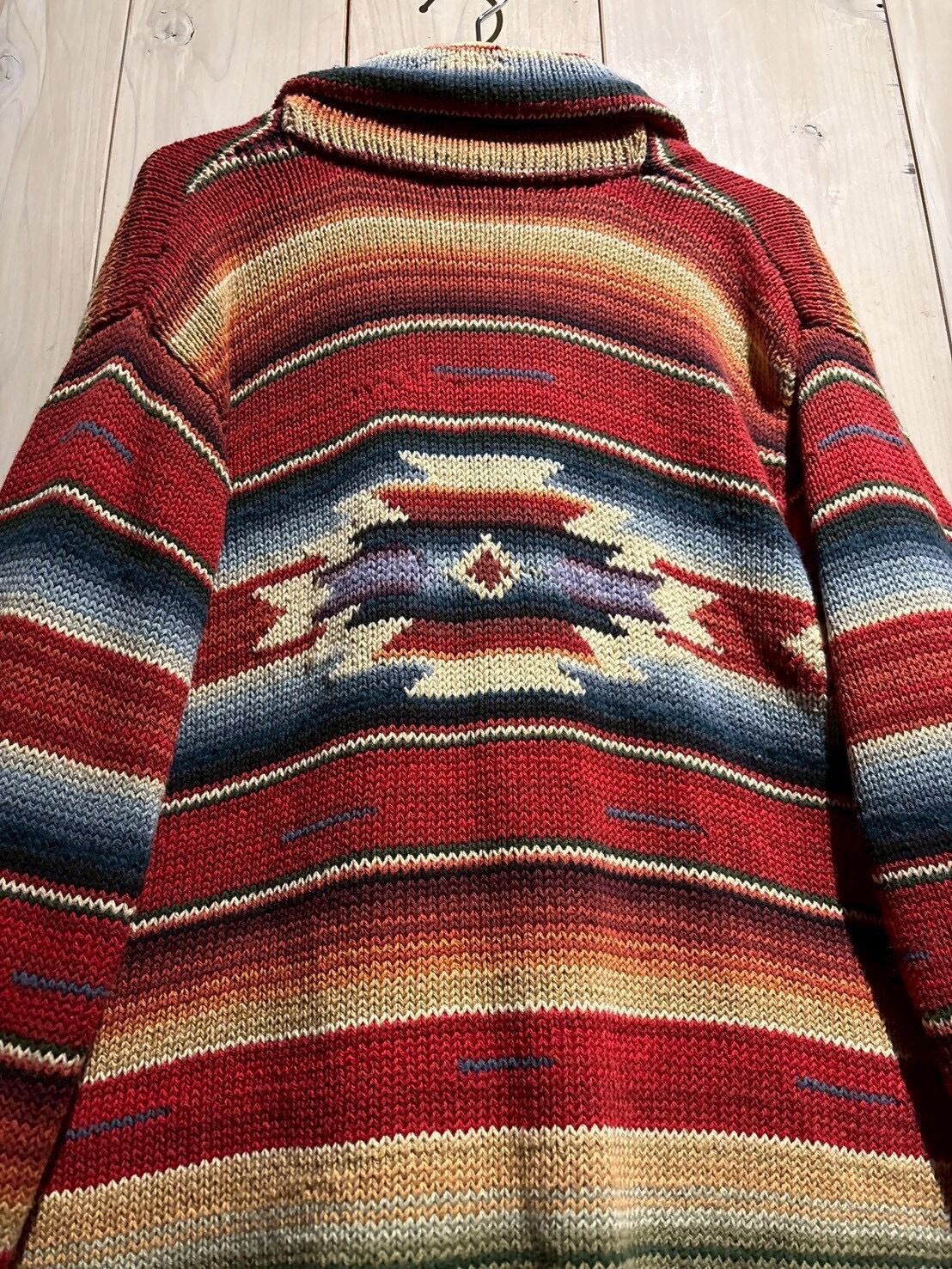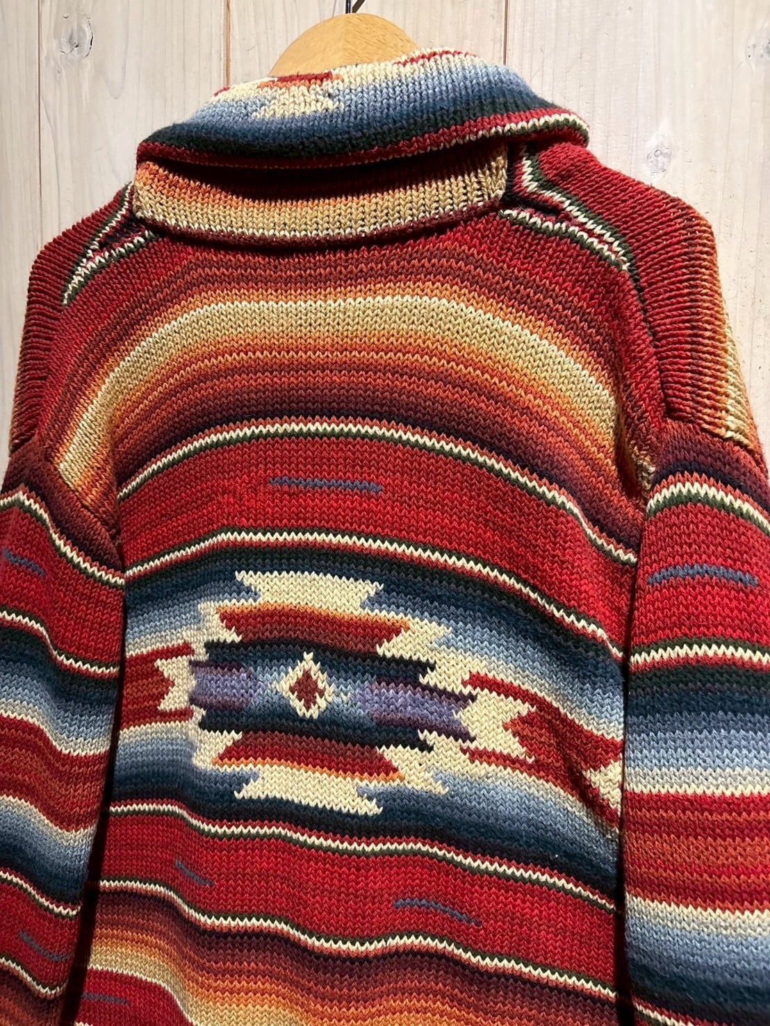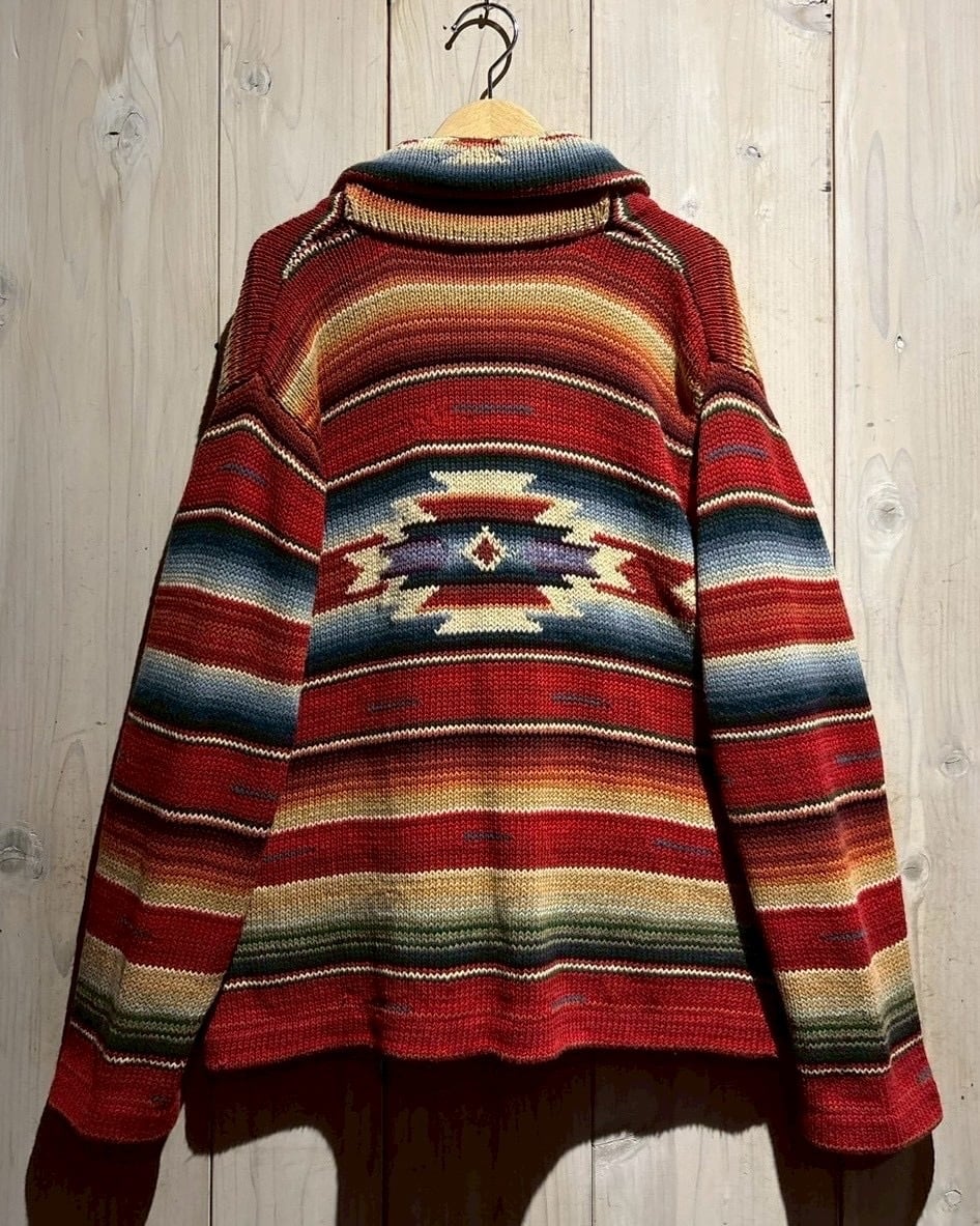 伝統的なネイティブアメリカンモチーフをベースに、深みあるレッドを中心としたマルチカラーのボーダーパターンが圧倒的な存在感を放ちます。