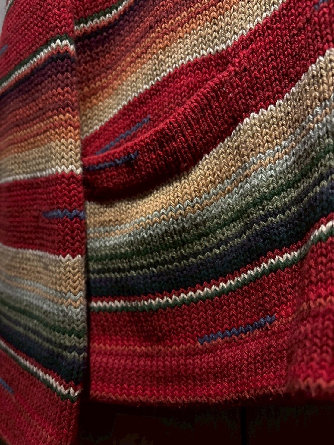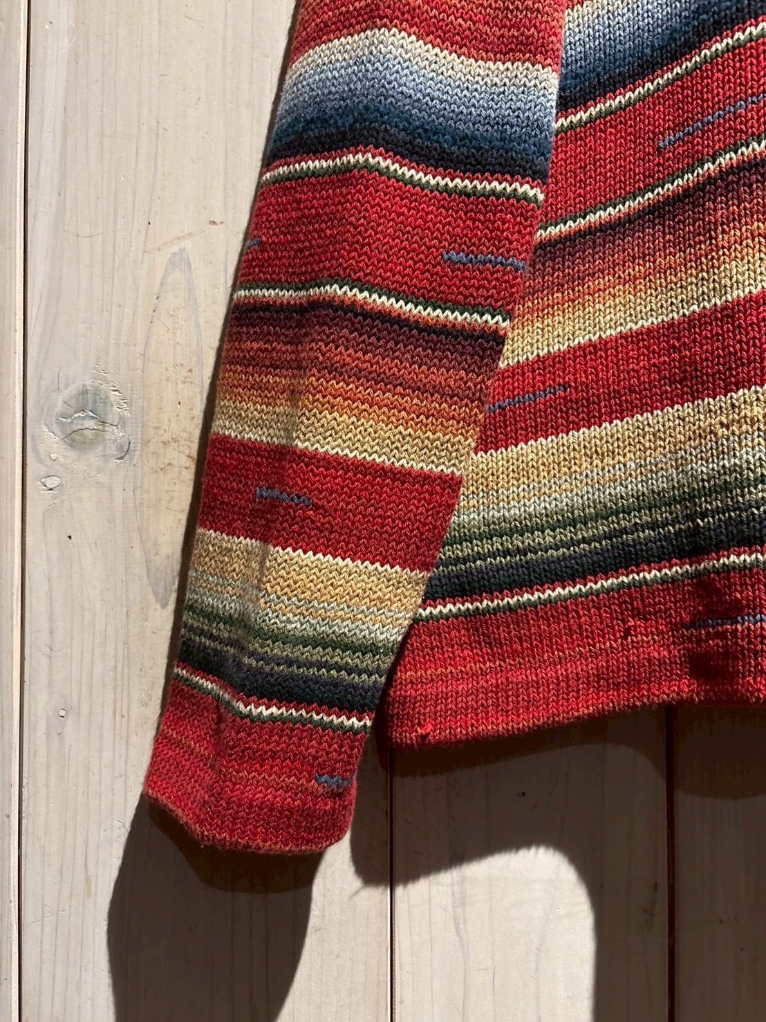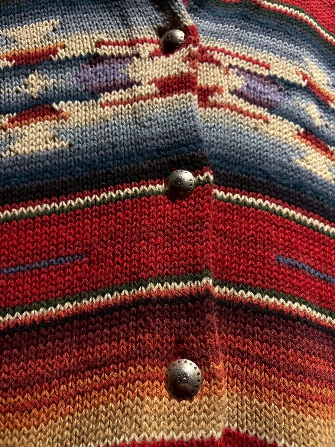 伝統的なネイティブアメリカンモチーフをベースに、深みあるレッドを中心としたマルチカラーのボーダーパターンが圧倒的な存在感を放ちます。