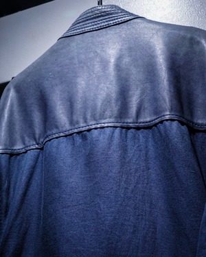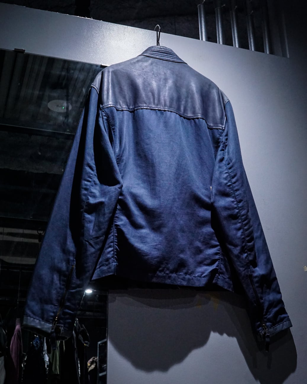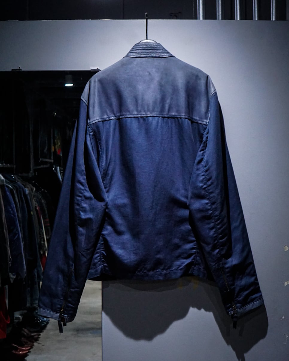 レザーフェード感もまた魅力で、生地のトーン差が絶妙な奥行きを演出。深みとモードな艶感が共存する、唯一無二の雰囲気を纏っています。ライダースをベースにしたシンプルなデザインながら、素材と色気で勝負できる完成された1着かと。