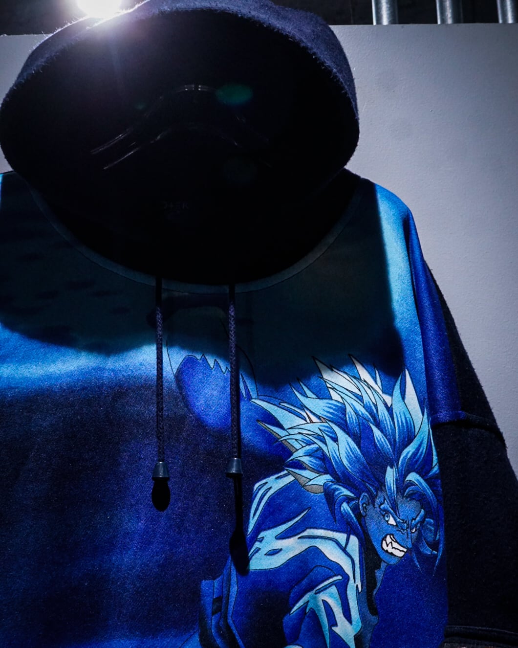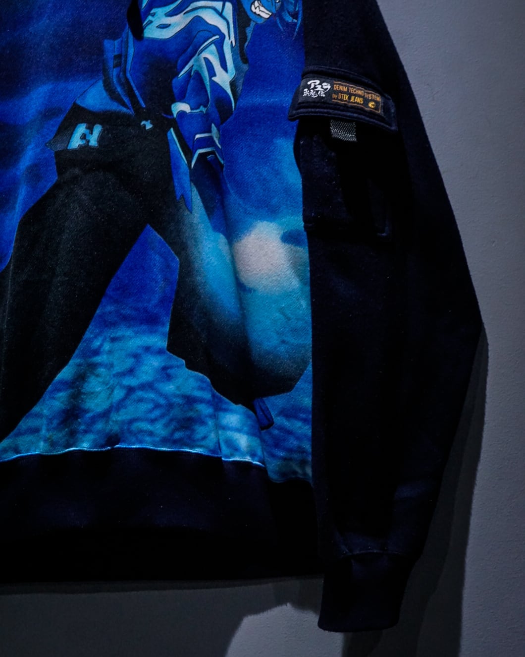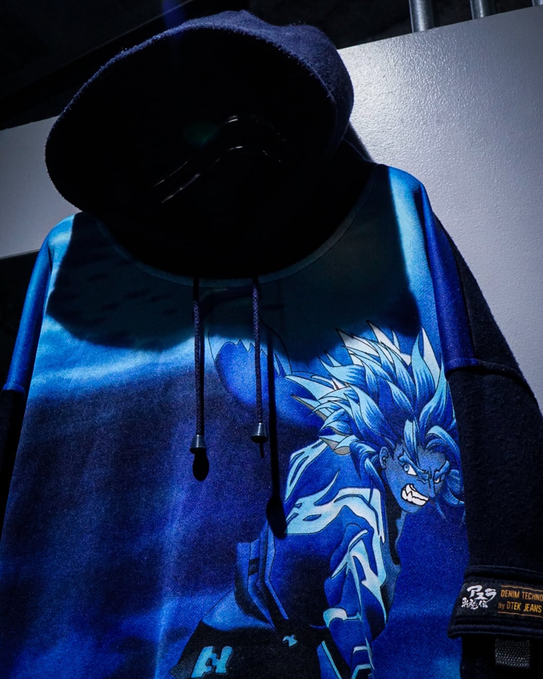ネイビーボディをベースに、フロント一面へと大胆に広がる、某アニメを彷彿とさせるアニメグラフィックが印象的なプルオーバーフーディ。