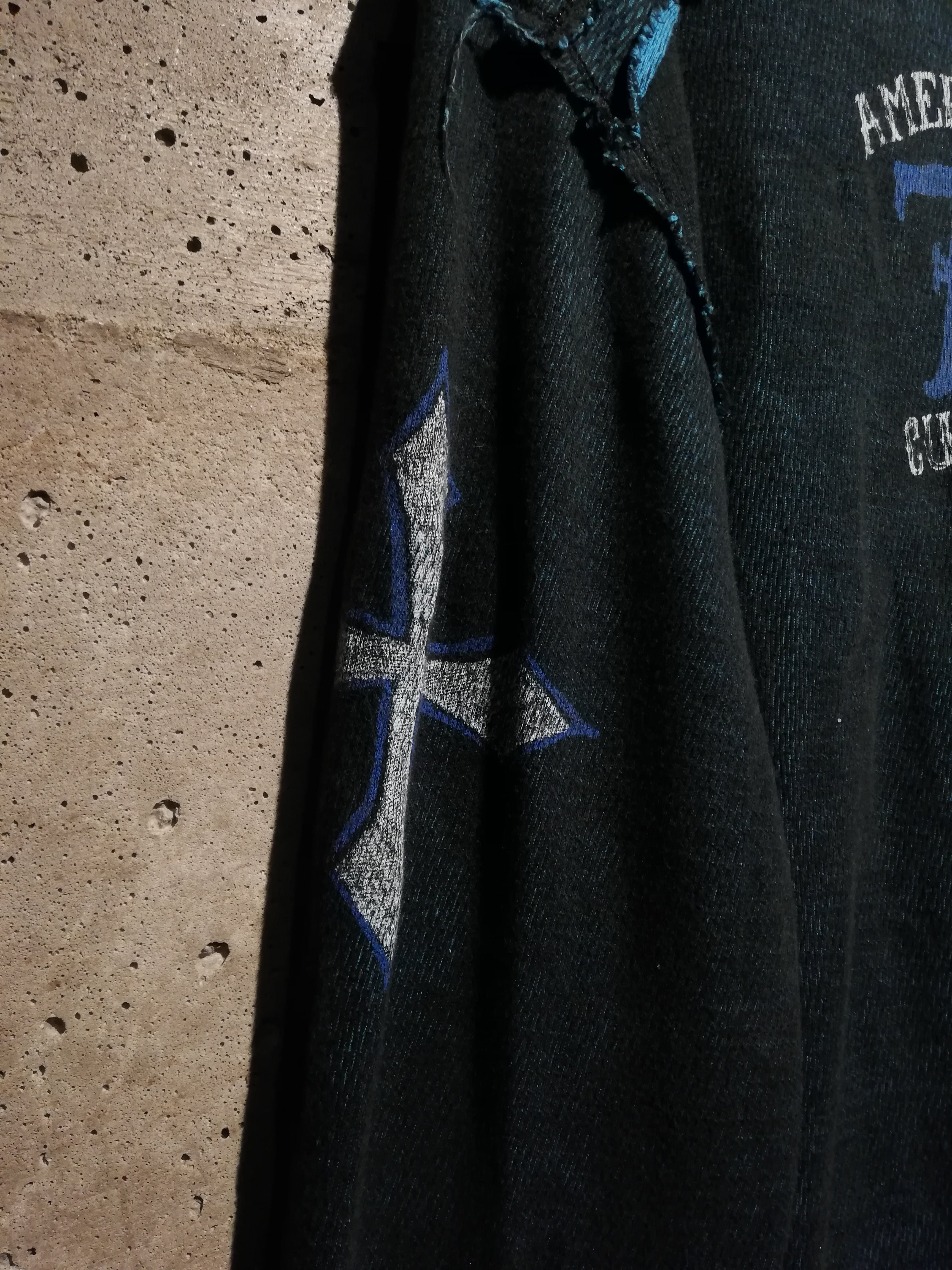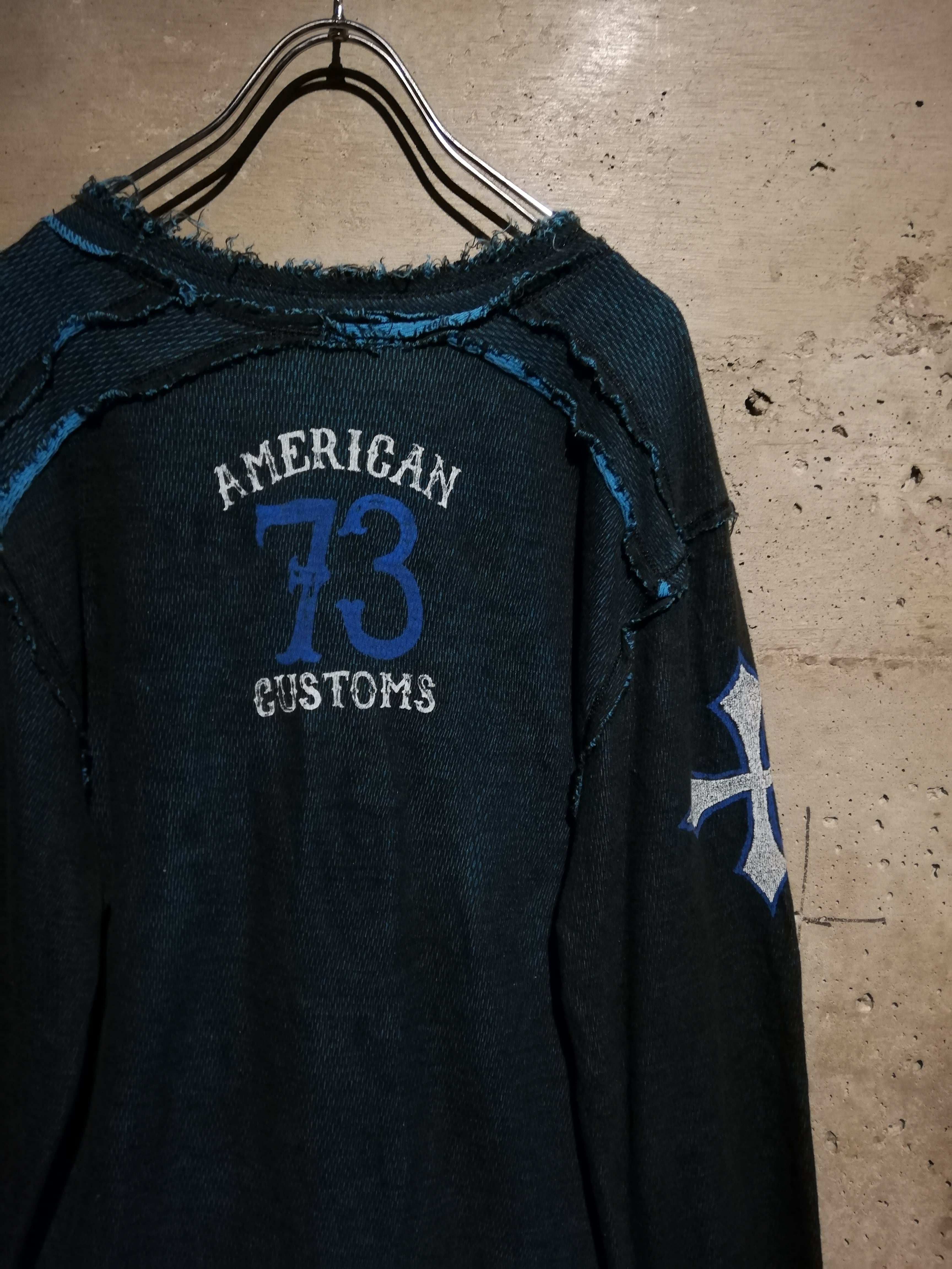表面にはスカル×ウィングを中心に「SEEK & DESTROY」「AMERICAN CUSTOMS」など、ブランドの哲学を象徴するグラフィックを大判でプリント。背面には“AMERICAN 73 CUSTOMS”のナンバリングロゴを配し、存在感抜群のデザインに仕上げられています。