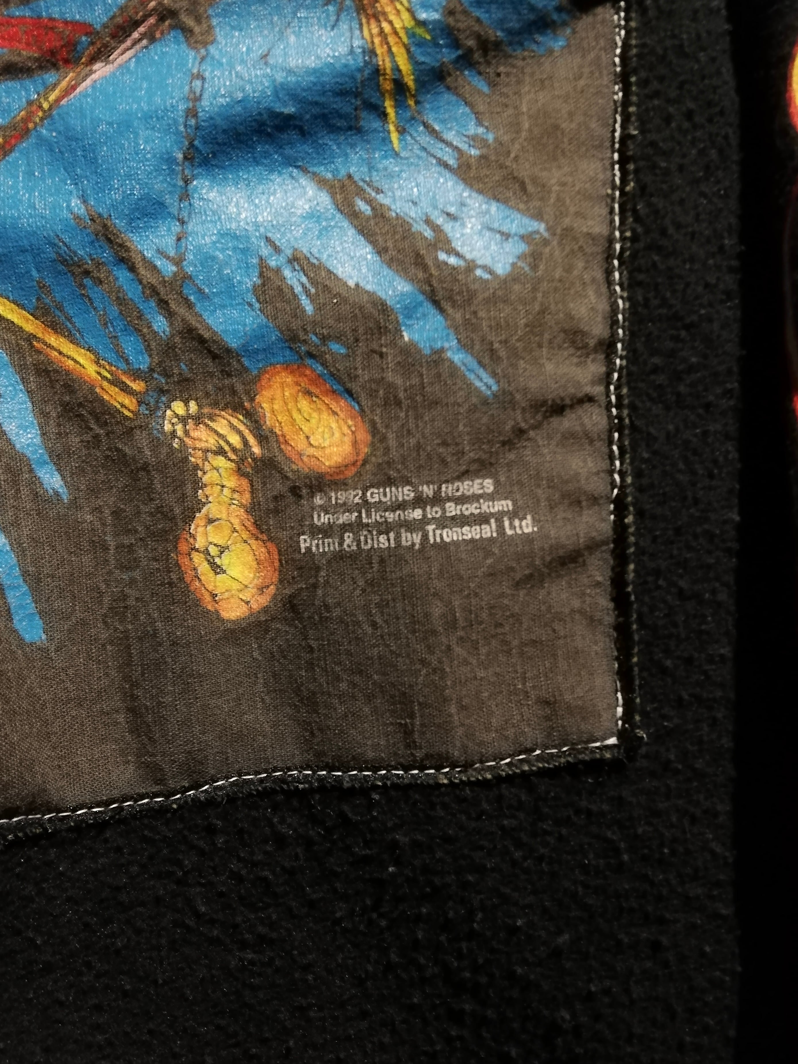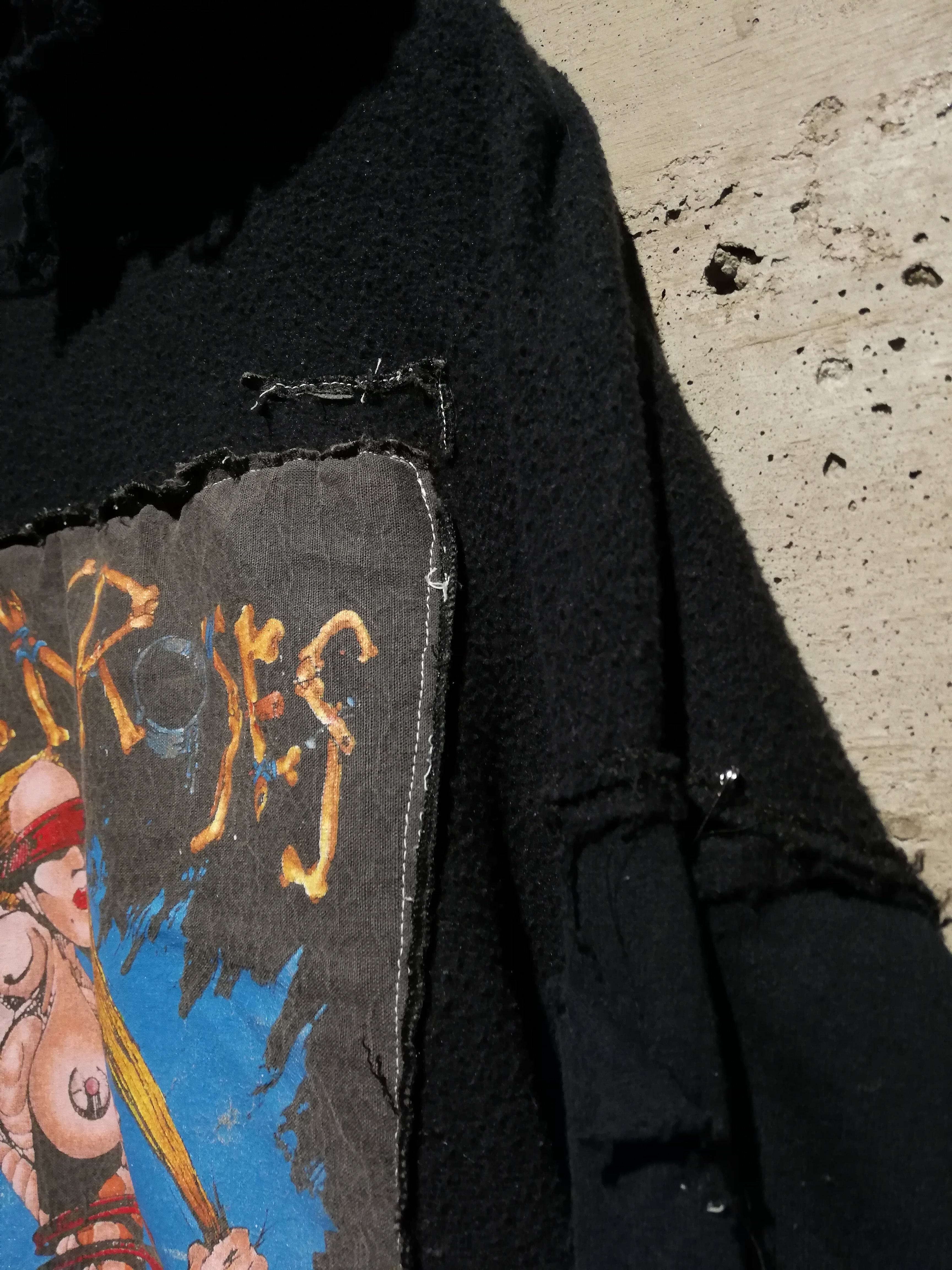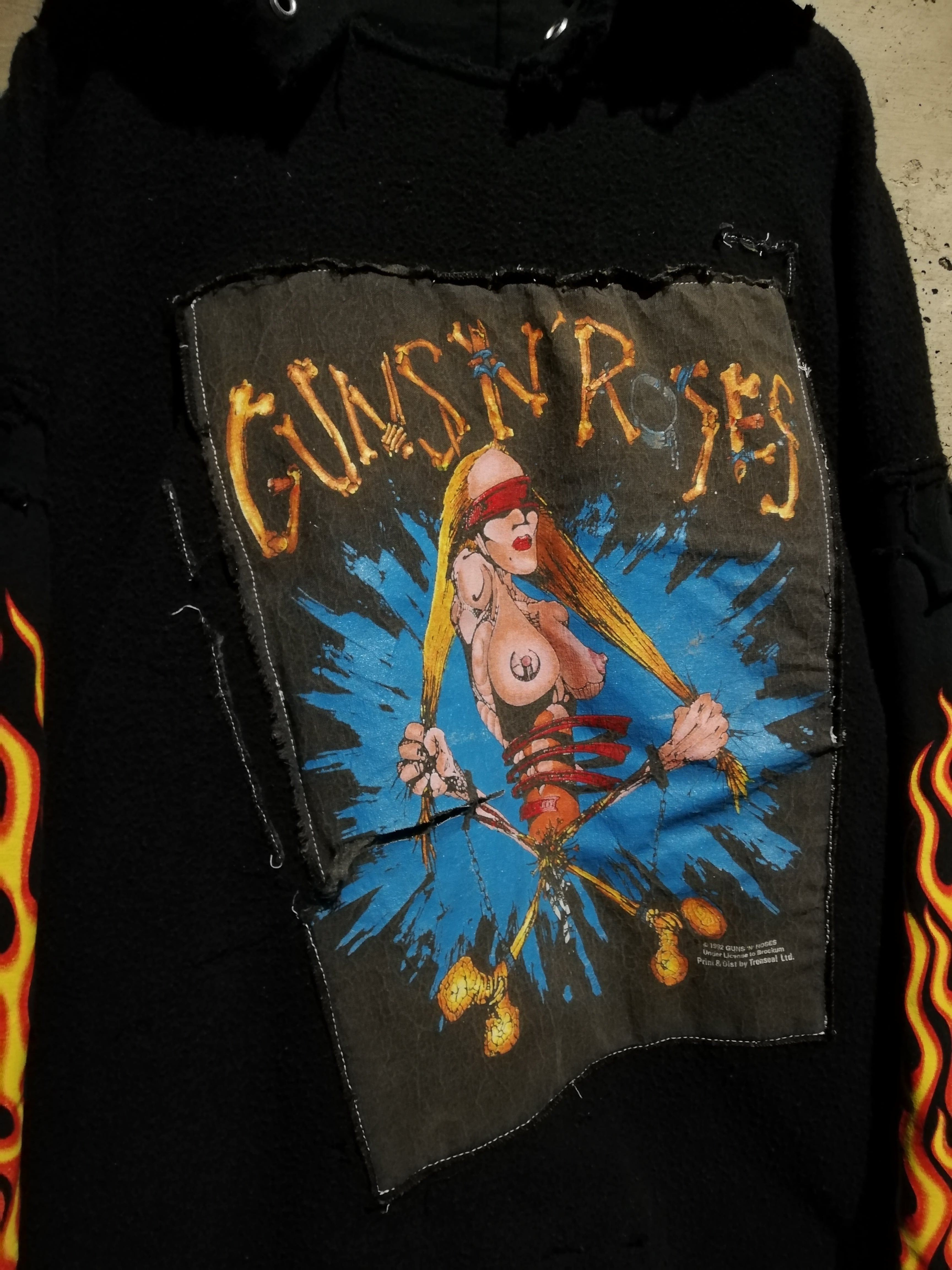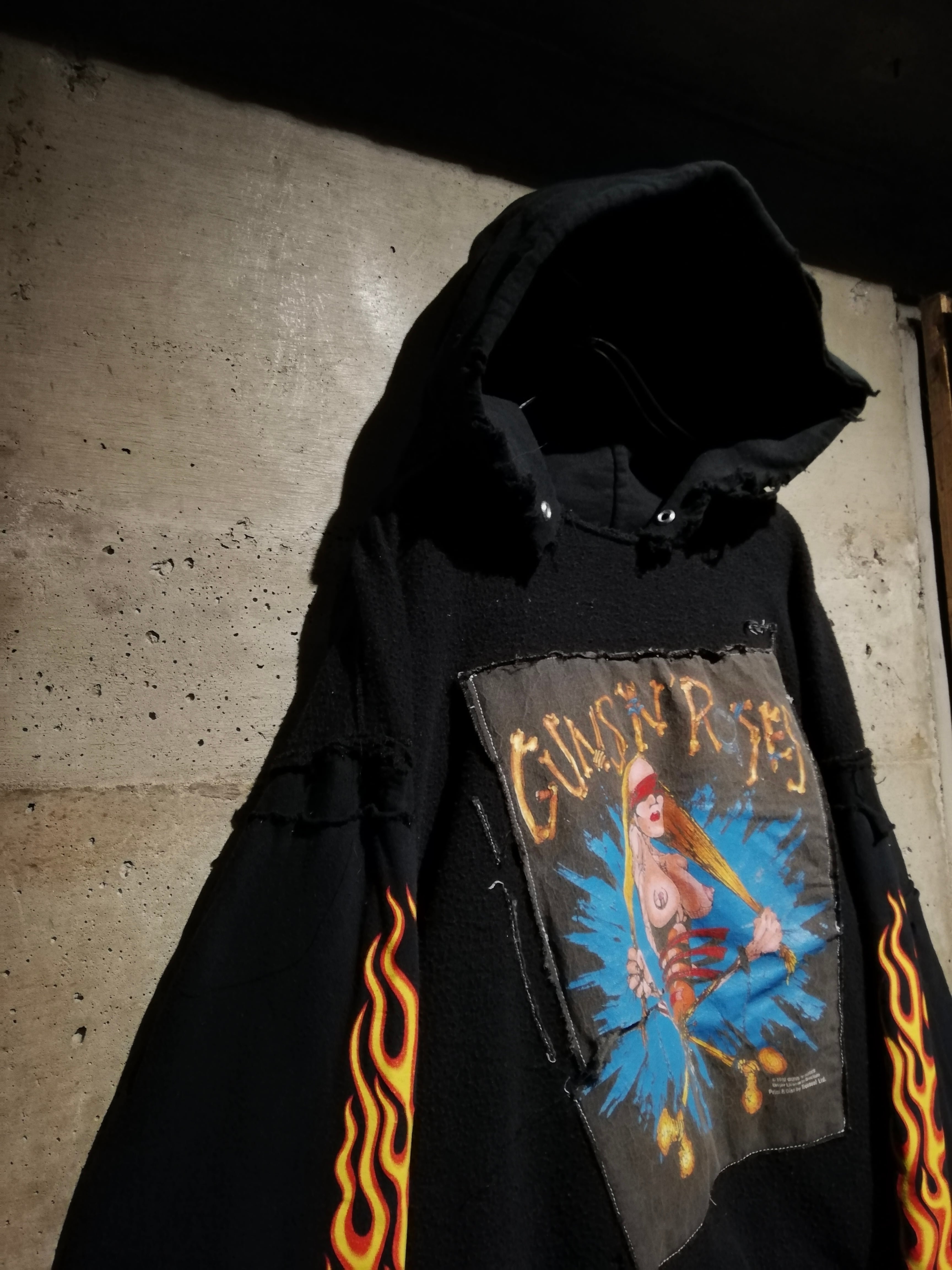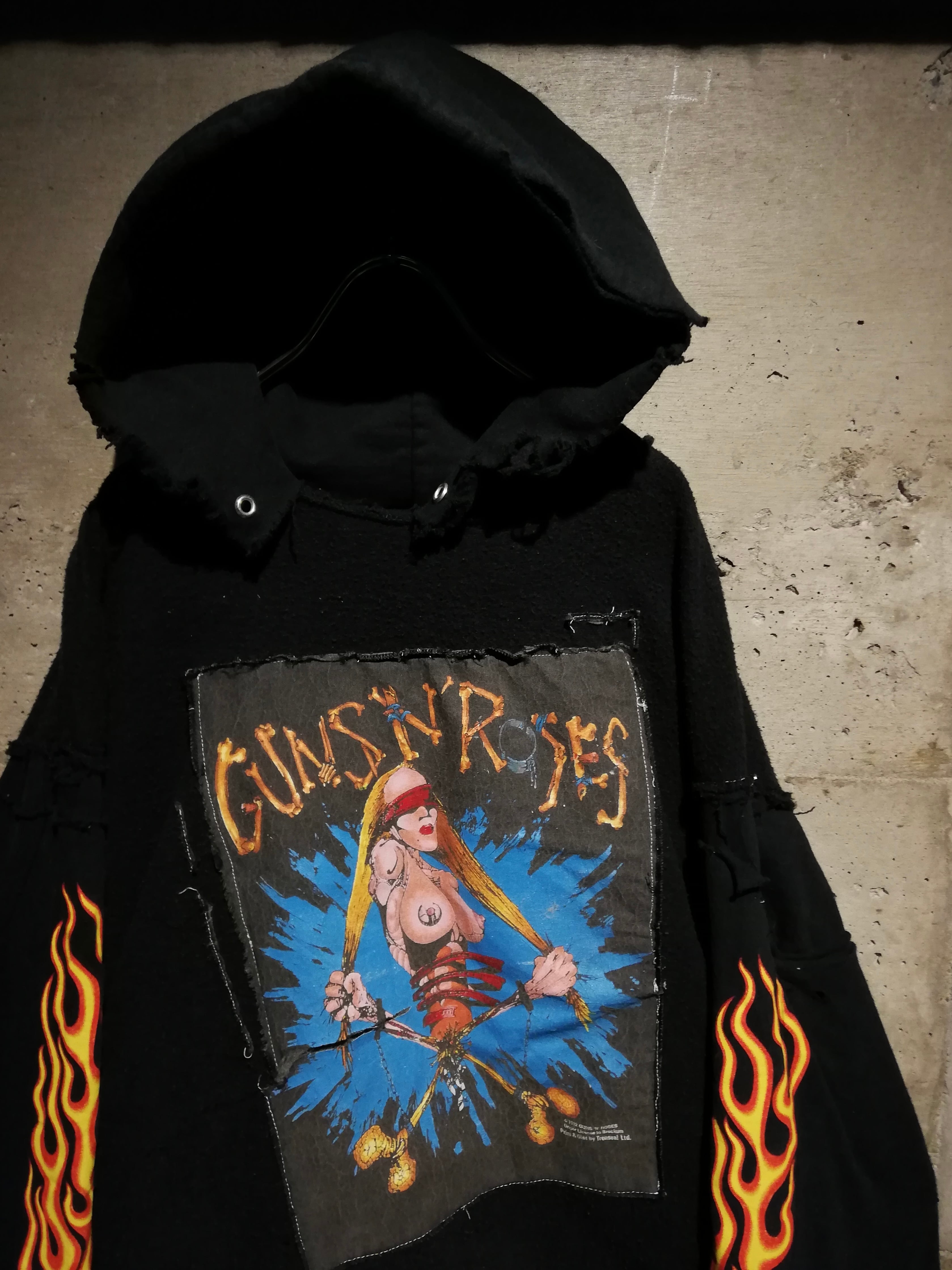 スウェットの裏毛部分を表地として採用し、フロントには“GUNS N’ ROSES / 1992 ©BROCKUM”のアートワークを大胆に縫い付けたリバーシブル仕様のリメイクフーディ。