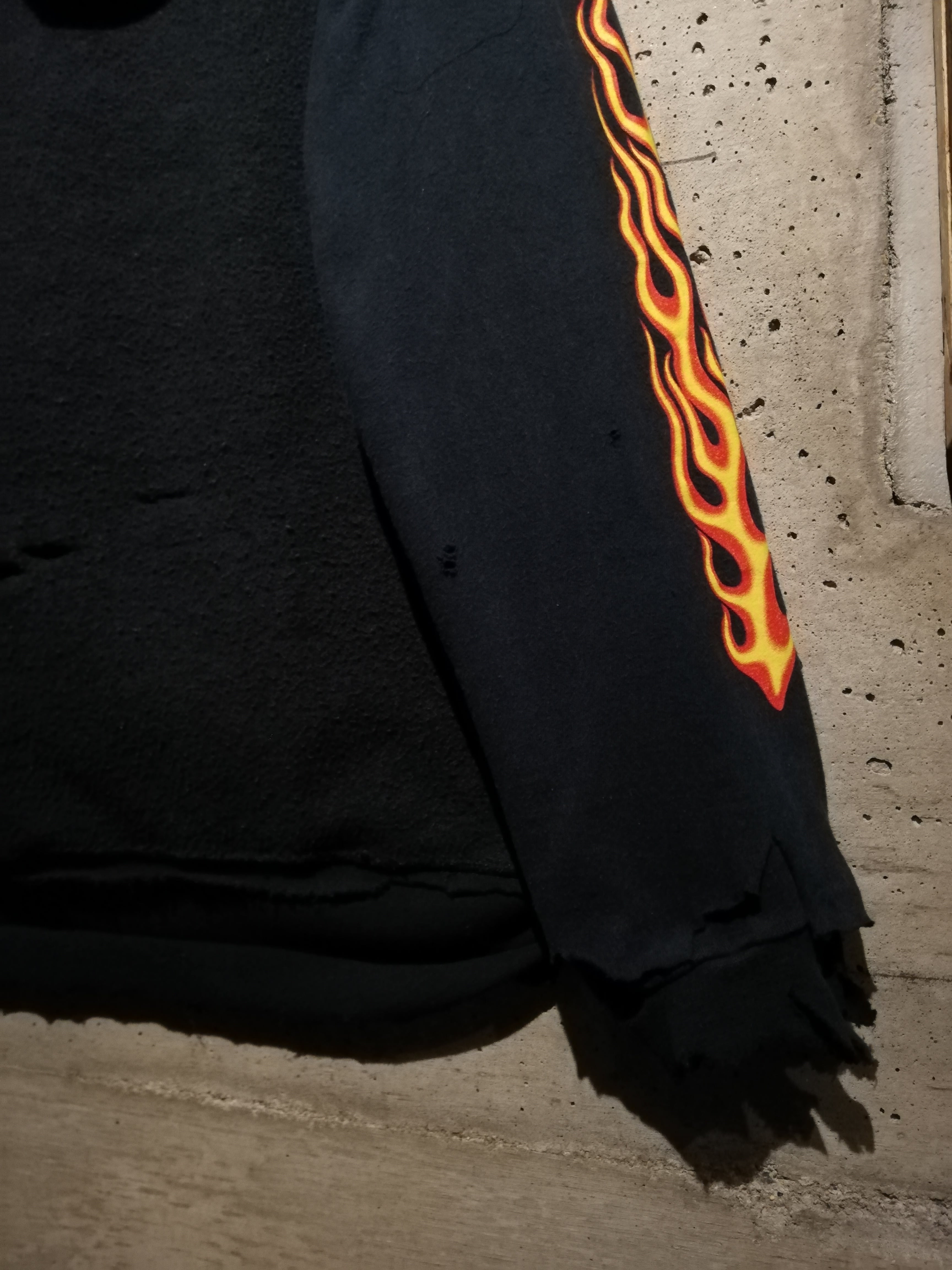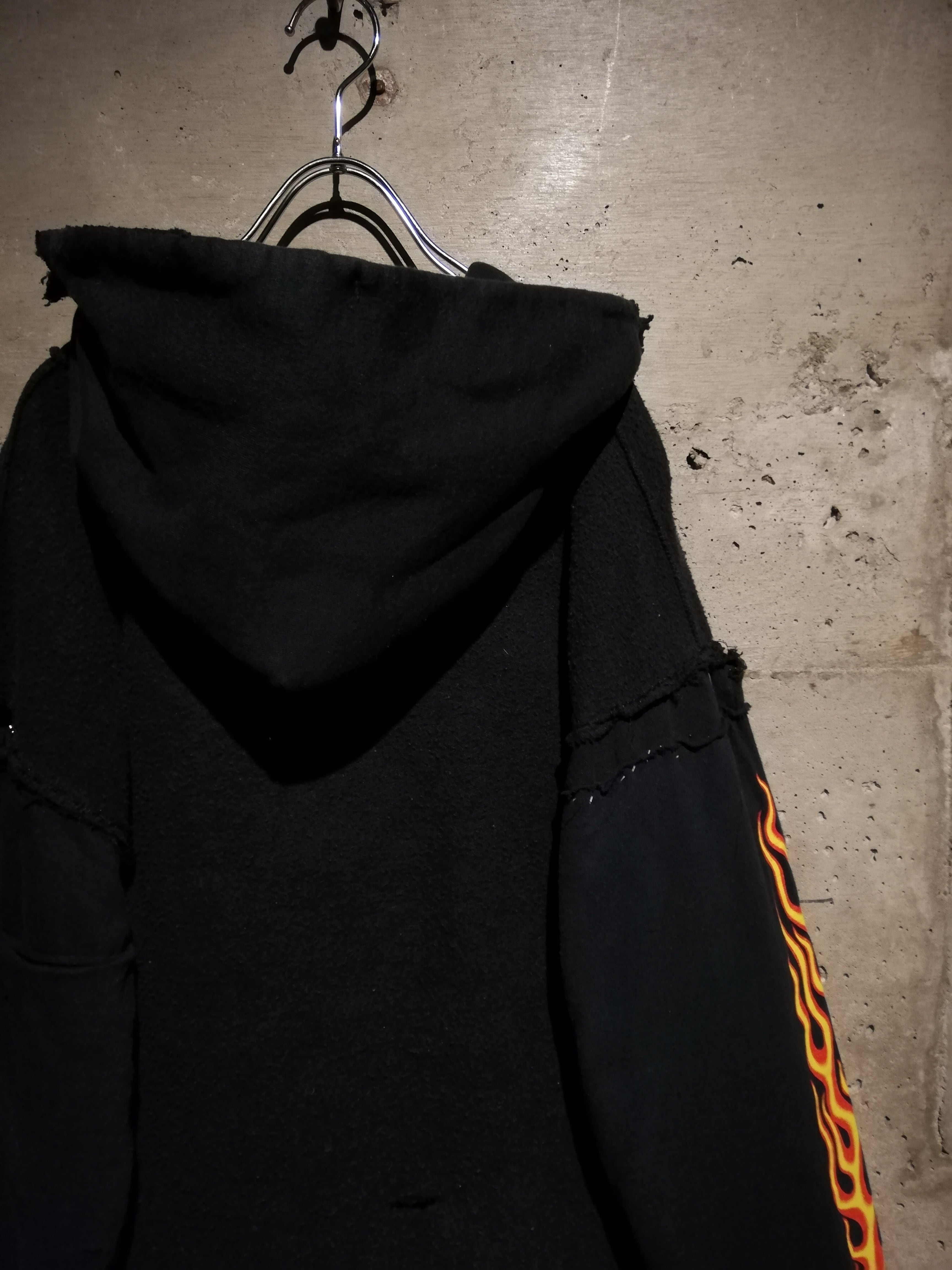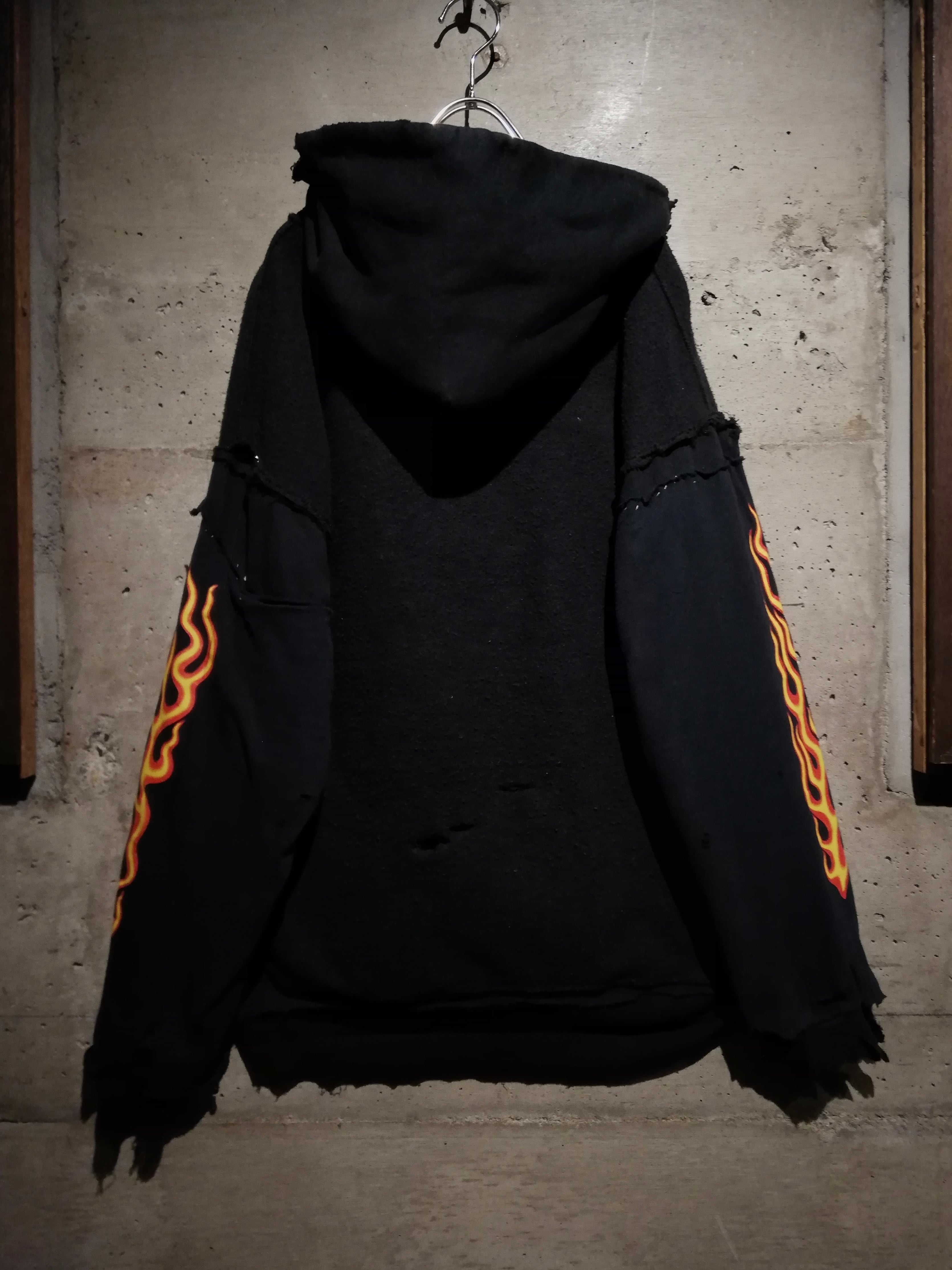 ラフで無骨な質感を活かしたボディに、袖にはフレイムプリントのロンT生地を上から被せたレイヤード風のデザインを採用し、リメイク特有の荒々しさと迫力を引き立てています。既存だったら申し訳ないが、このセンスには思わず脱帽しました。