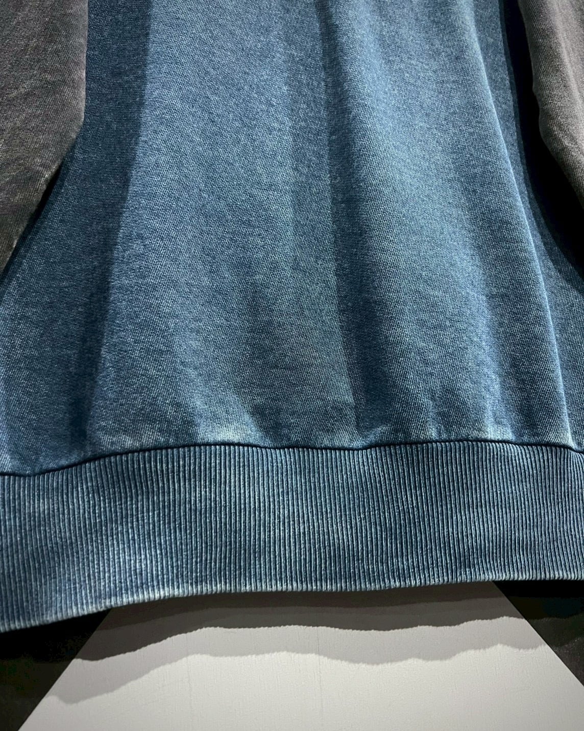 生地にはオーバーダイ加工を施したコットン100%スウェットを使用。独特のフェード感や色ムラが一点一点異なり、着込むほどにさらに味わいを増していきます。厚みのあるボディながら柔らかく、リブとのコントラストも絶妙。