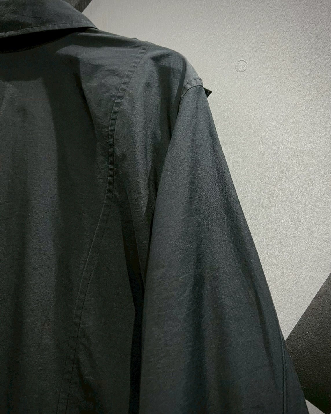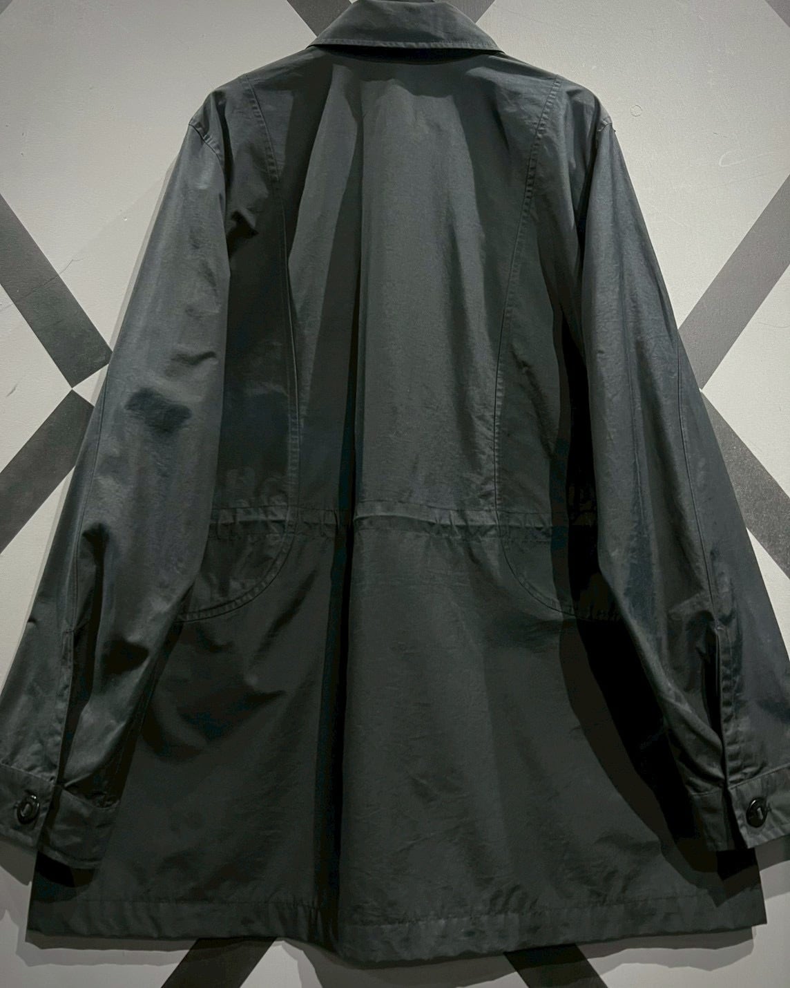 フロントには大ぶりの4ポケットを左右対称に配置し、機能美を感じさせながらも全体は極めてクリーンな仕上がりに。ショルダーエポレットがミリタリーらしい無骨さを残しつつも、光沢を抑えた生地感が上品なバランスを保っています。