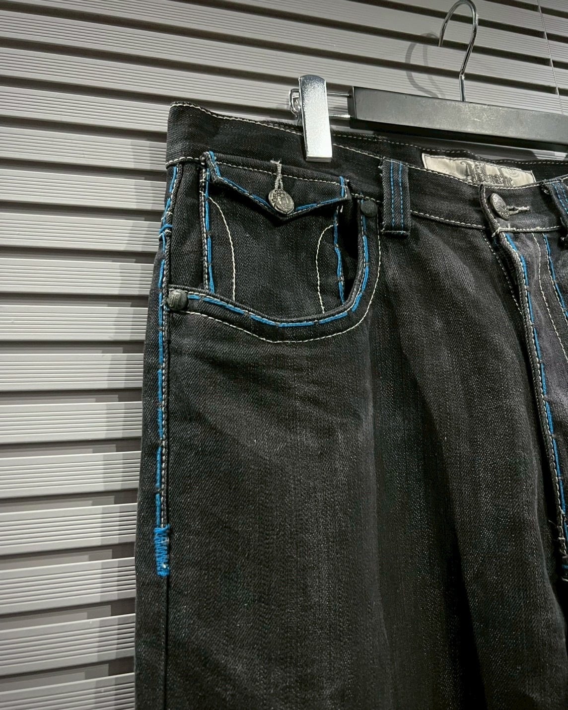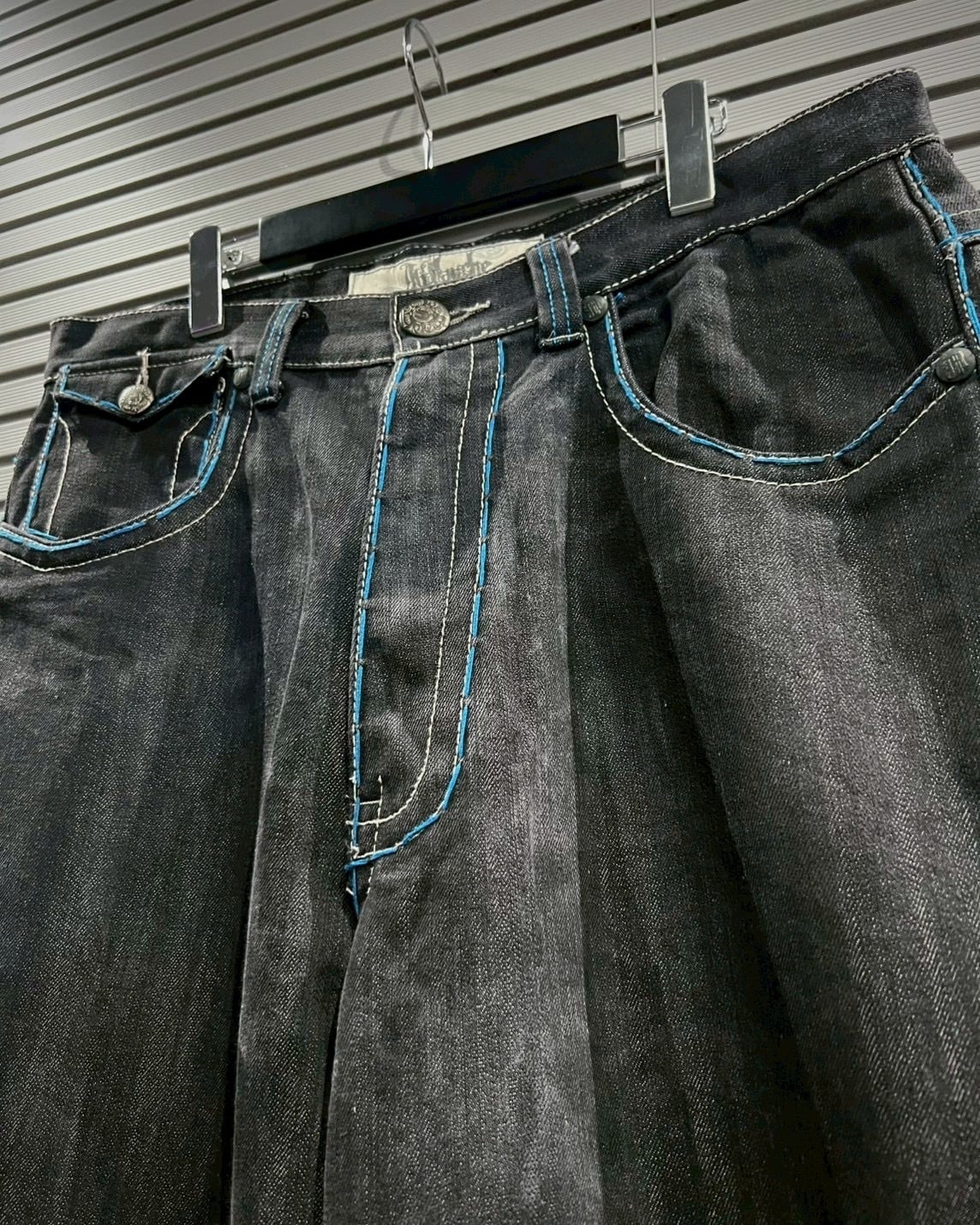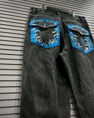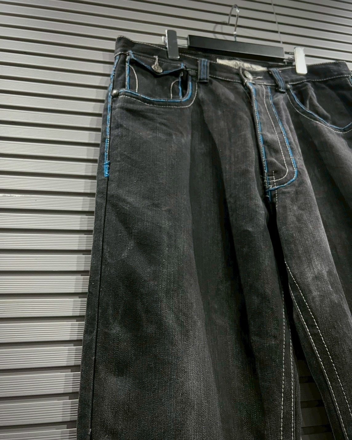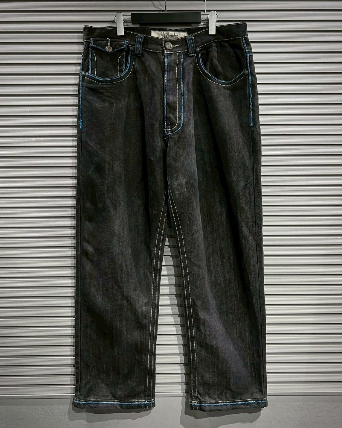 フェードしたブラックデニムをベースに、鮮やかなブルーステッチを大胆に走らせたバギーパンツ。