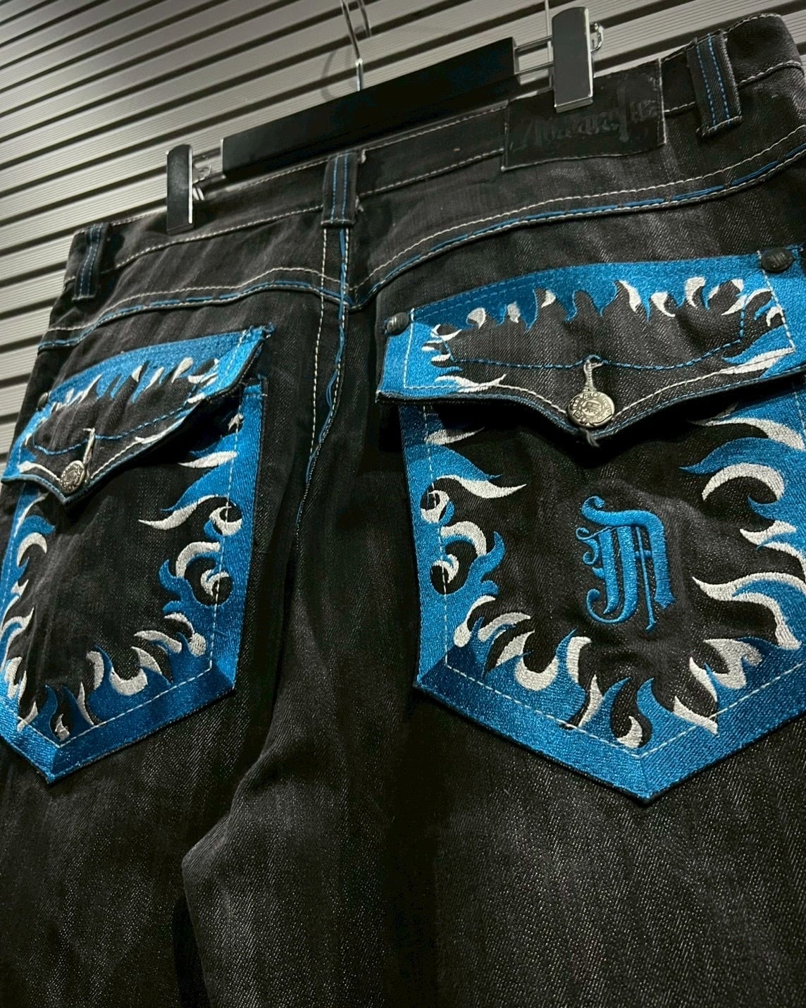 バックポケットにはフレイムモチーフの刺繍を大胆に施し、刺繍の立体感とコントラストがバックスタイルの主役に。ポケットフラップの形状やメタルボタンの装飾まで緻密に作り込まれており、クラフトマンシップを感じられます。