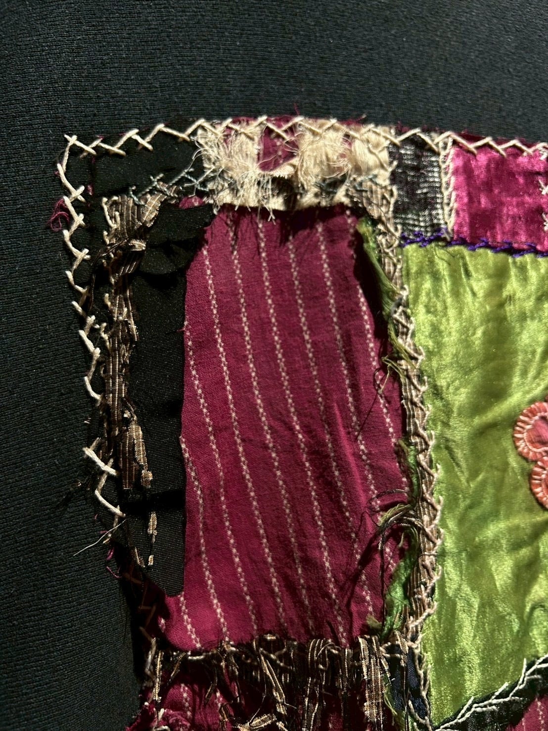 ピンクやグリーン、ブラウン、レッドなどの多色な生地をクロスステッチで粗く縫い合わせ、部分的に糸のほつれを残したデザインは、計算された荒さが魅力。ハンドメイドライクの縫製と異素材感が、唯一無二の存在感を生み出しています。
