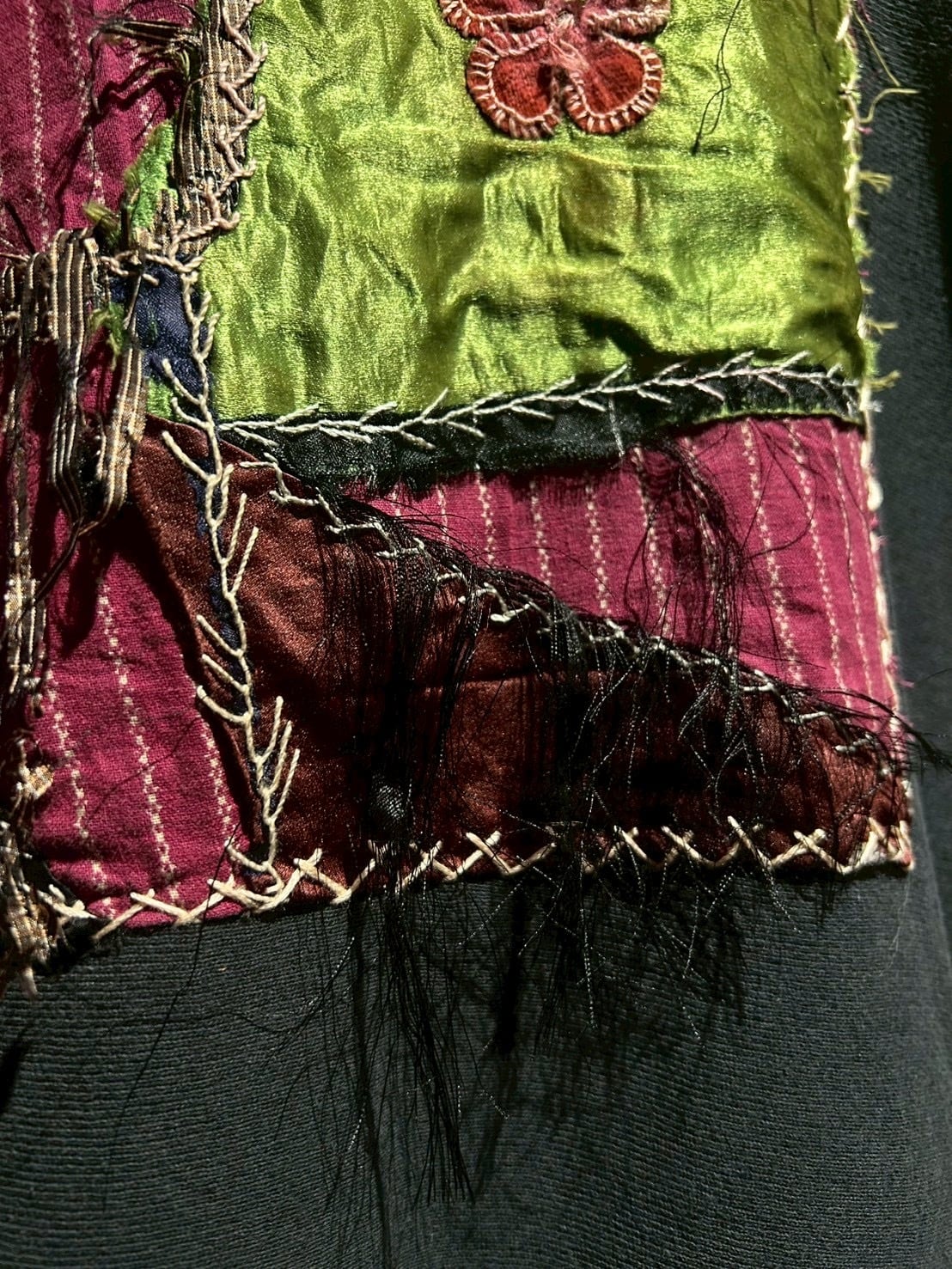 古布やヴィンテージサテンを再構築したようなパッチワーク刺繍がフロントに縫い付けられ、クラフト感とアヴァンギャルドな雰囲気を同時に纏う仕上がり。