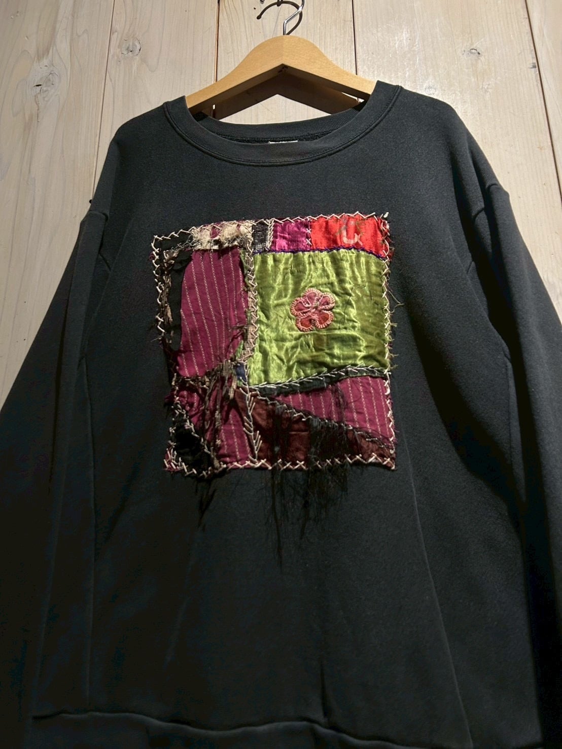 ベースはミドルオンスのコットンスウェット地。程よいフェード感を帯びたブラックボディが、パッチの艶や刺繍糸の陰影を際立たせ、アートとファッションが交錯するようなムードを演出。