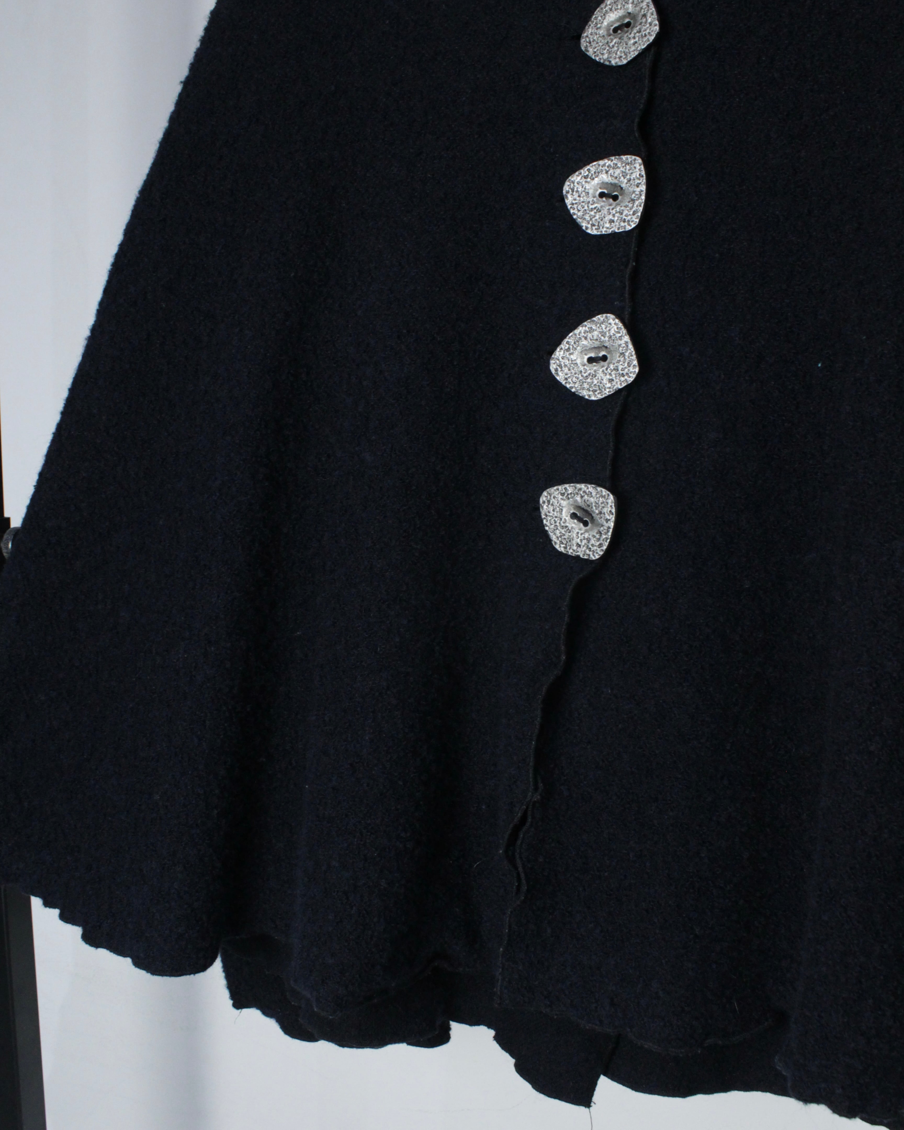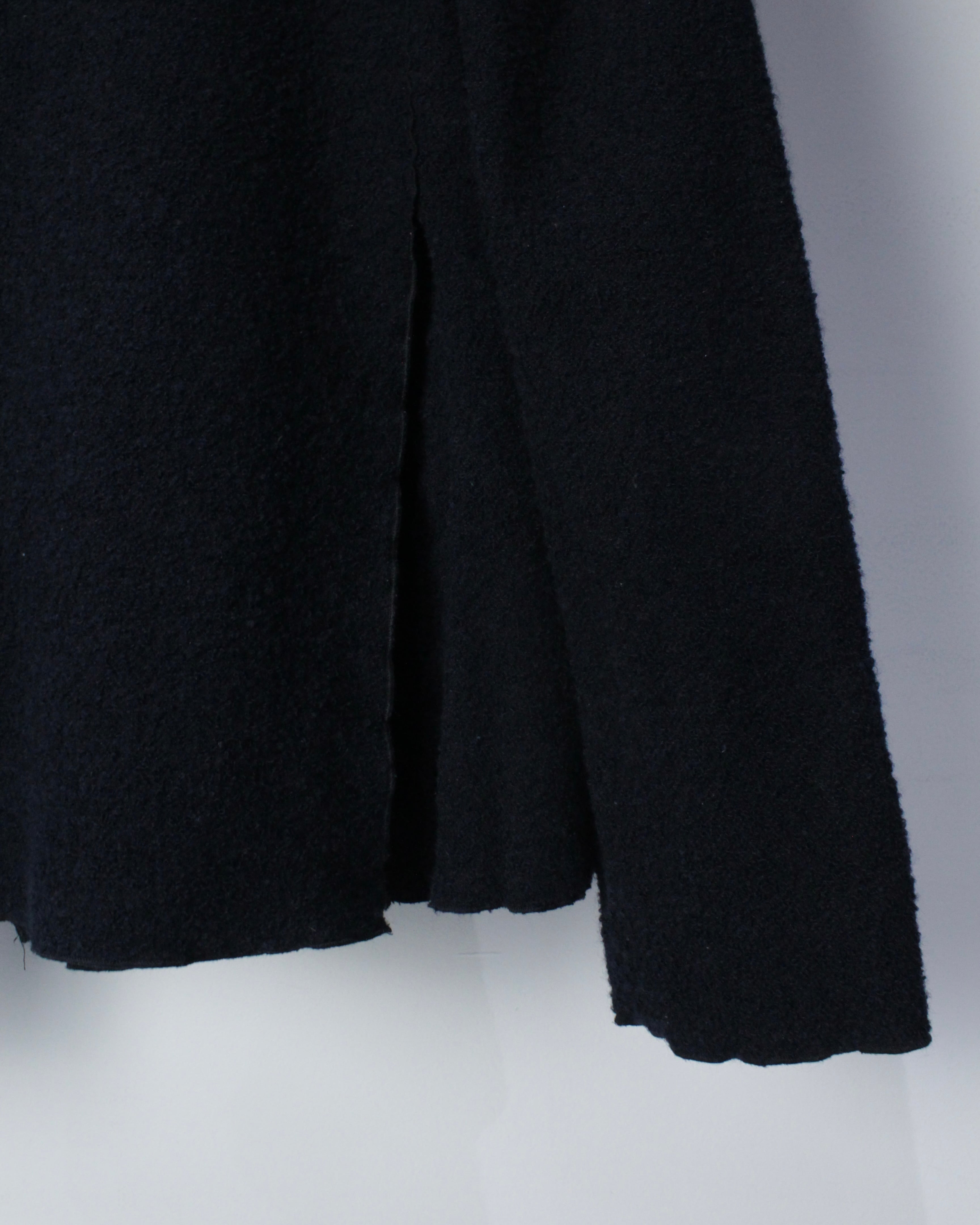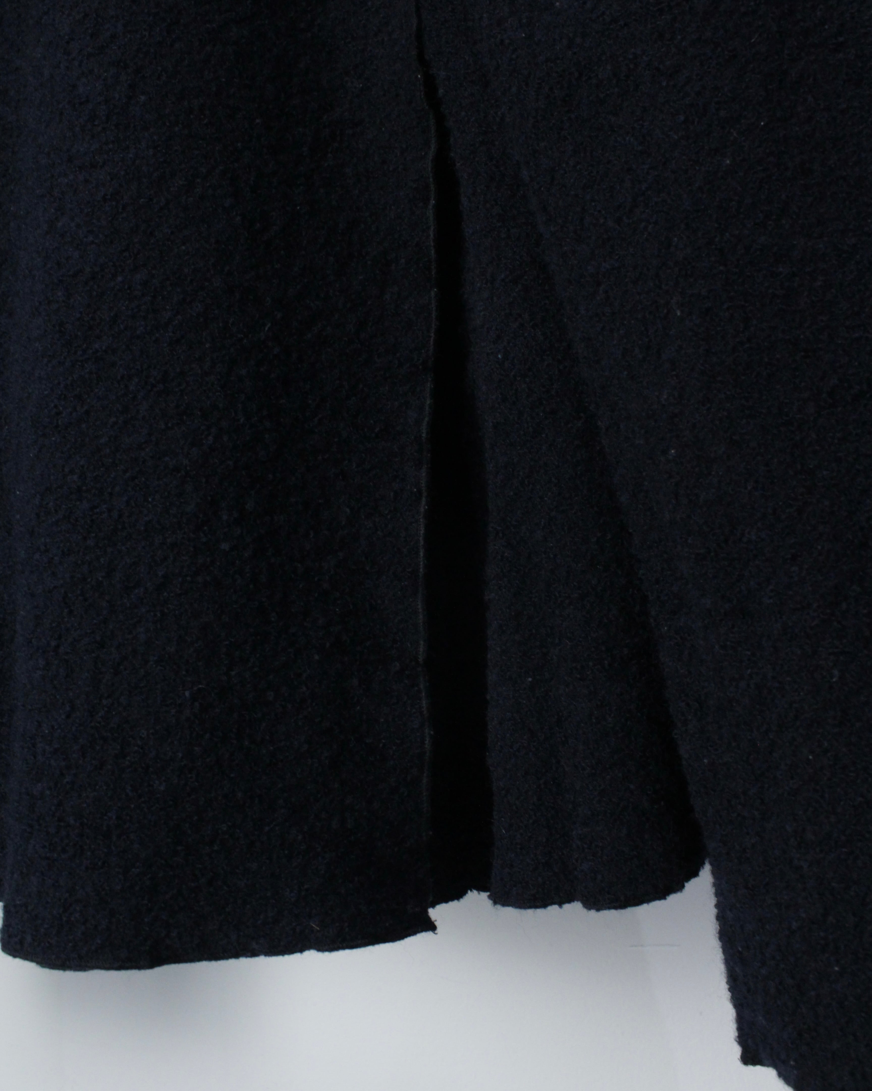 ざらつきを持たせたウール混素材は、軽やかでありながら空気を含んだような柔らかさを持ち、シルエットに独特の膨らみを与えます。カットオフ風のエッジが自然な波打ちを生み、無骨さと繊細さが同居する仕上がりに。