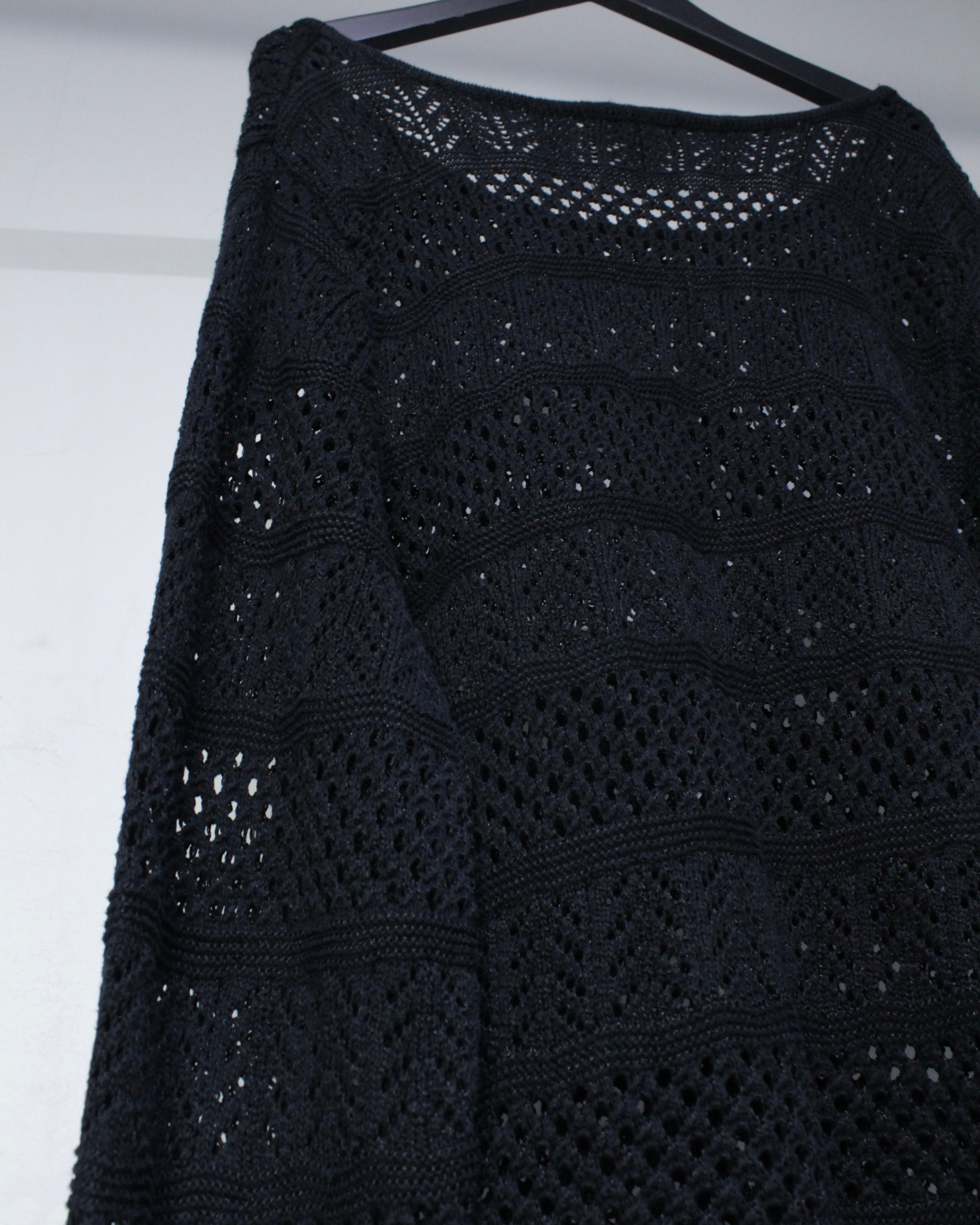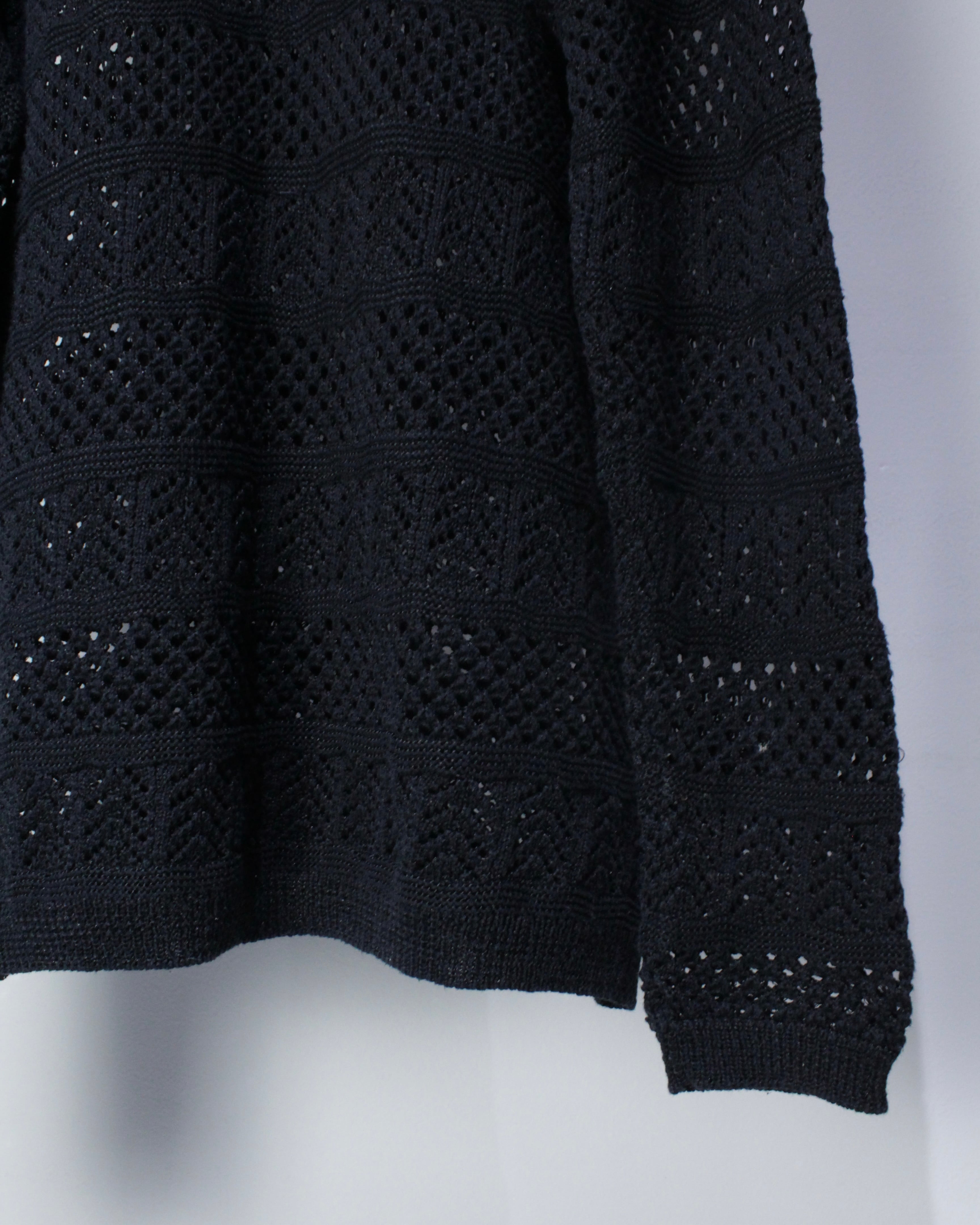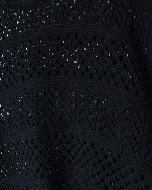 凹凸のある立体的な編み目が光を受けて陰影を生み出し、単色のブラックながら奥行きと存在感を感じさせる仕上がりに。しなやかで柔らかな糸を使用し、着心地の軽さと通気性も確保しています。