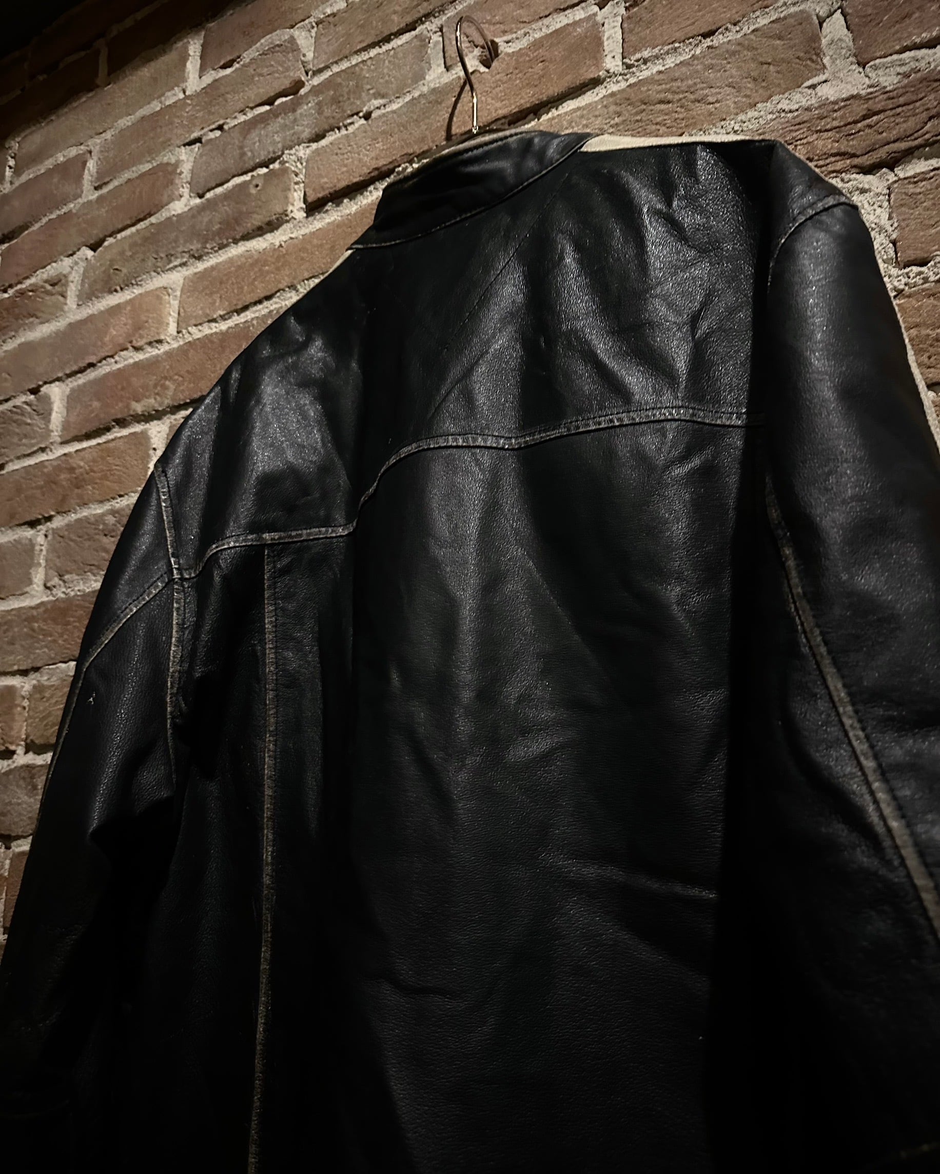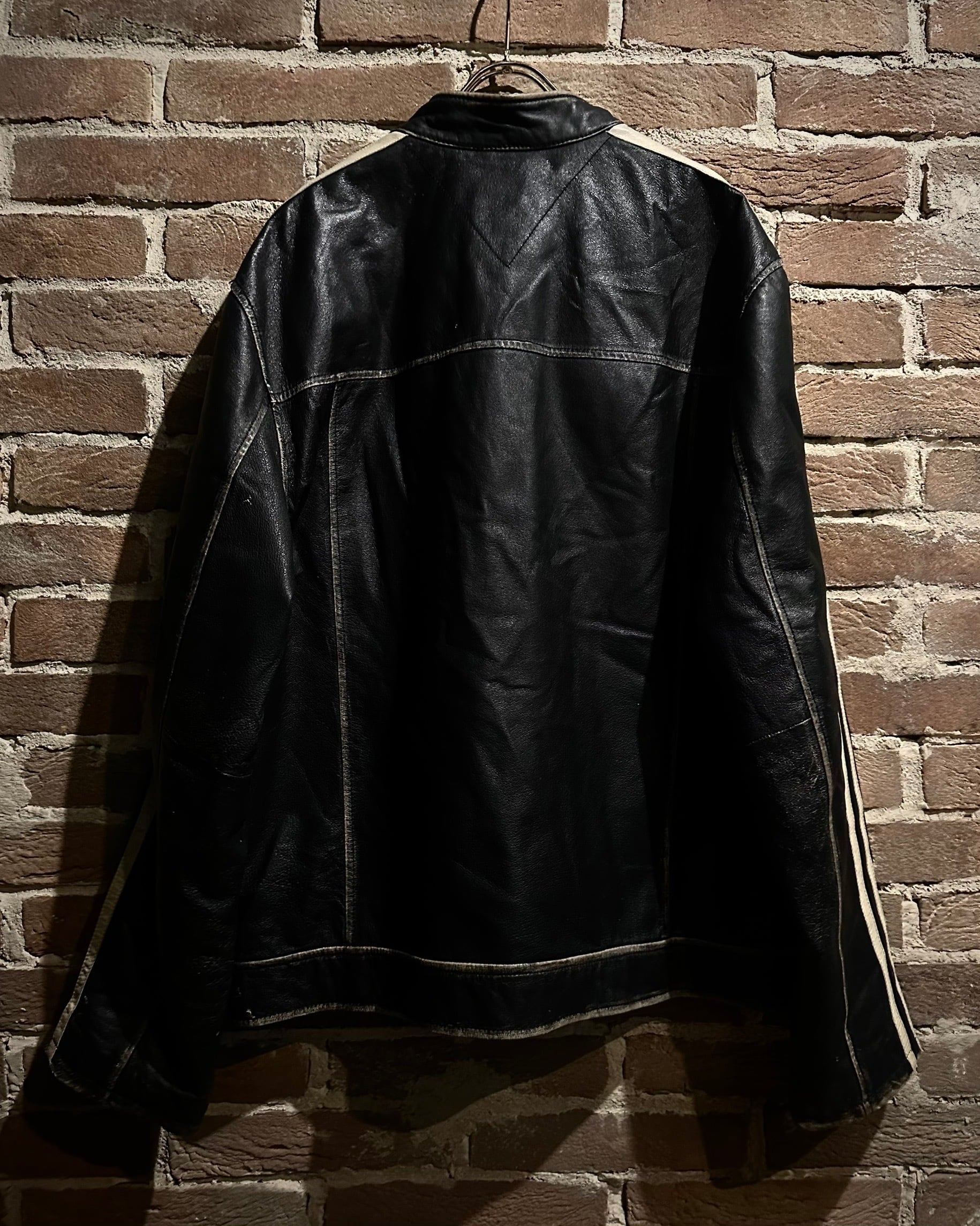 ボディには艶感を抑えたブラックレザーを採用し、袖にはラインを走らせることで、モノトーンながら動きのあるデザインに。胸元のジップポケットとフロントのシルバージップがアクセントとして効き、全体の重厚感を引き締めています。