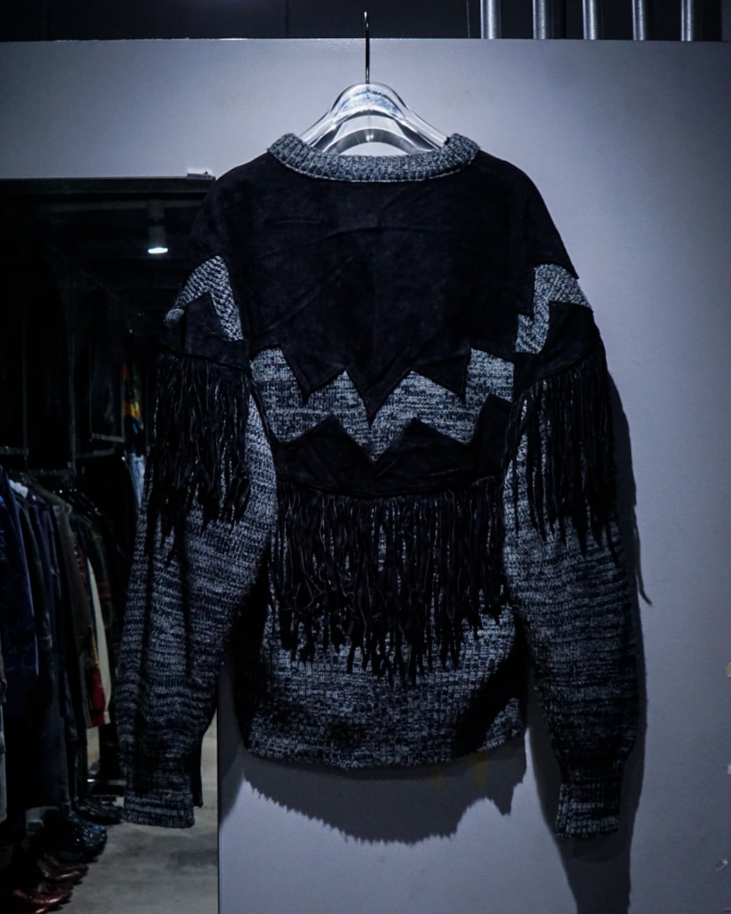 霜降りグレーのミドルゲージニットをベースに、胸、ショルダーにかけて贅沢にスエードレザーを切り替えた1着。